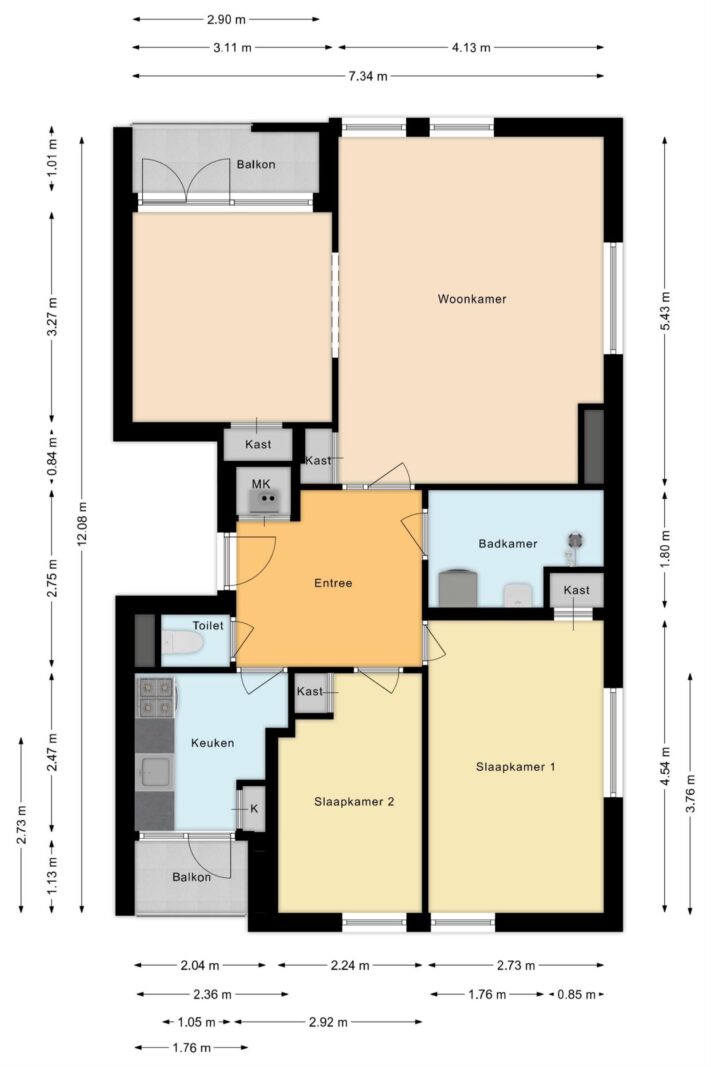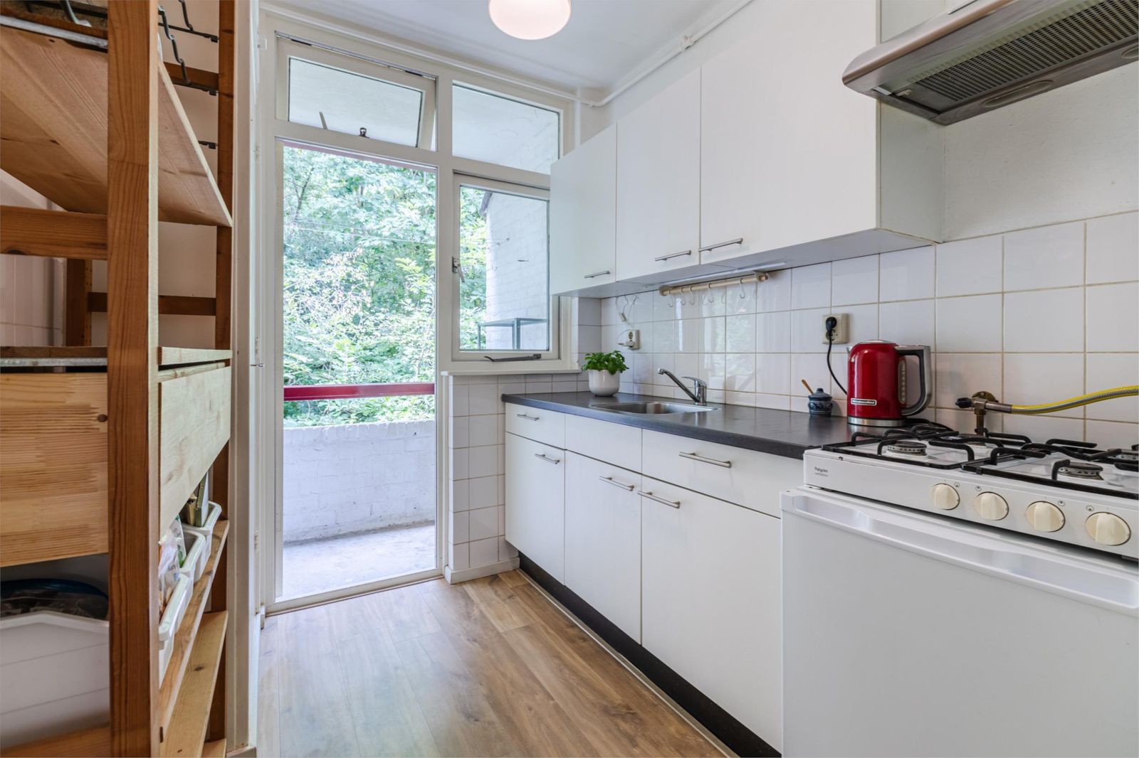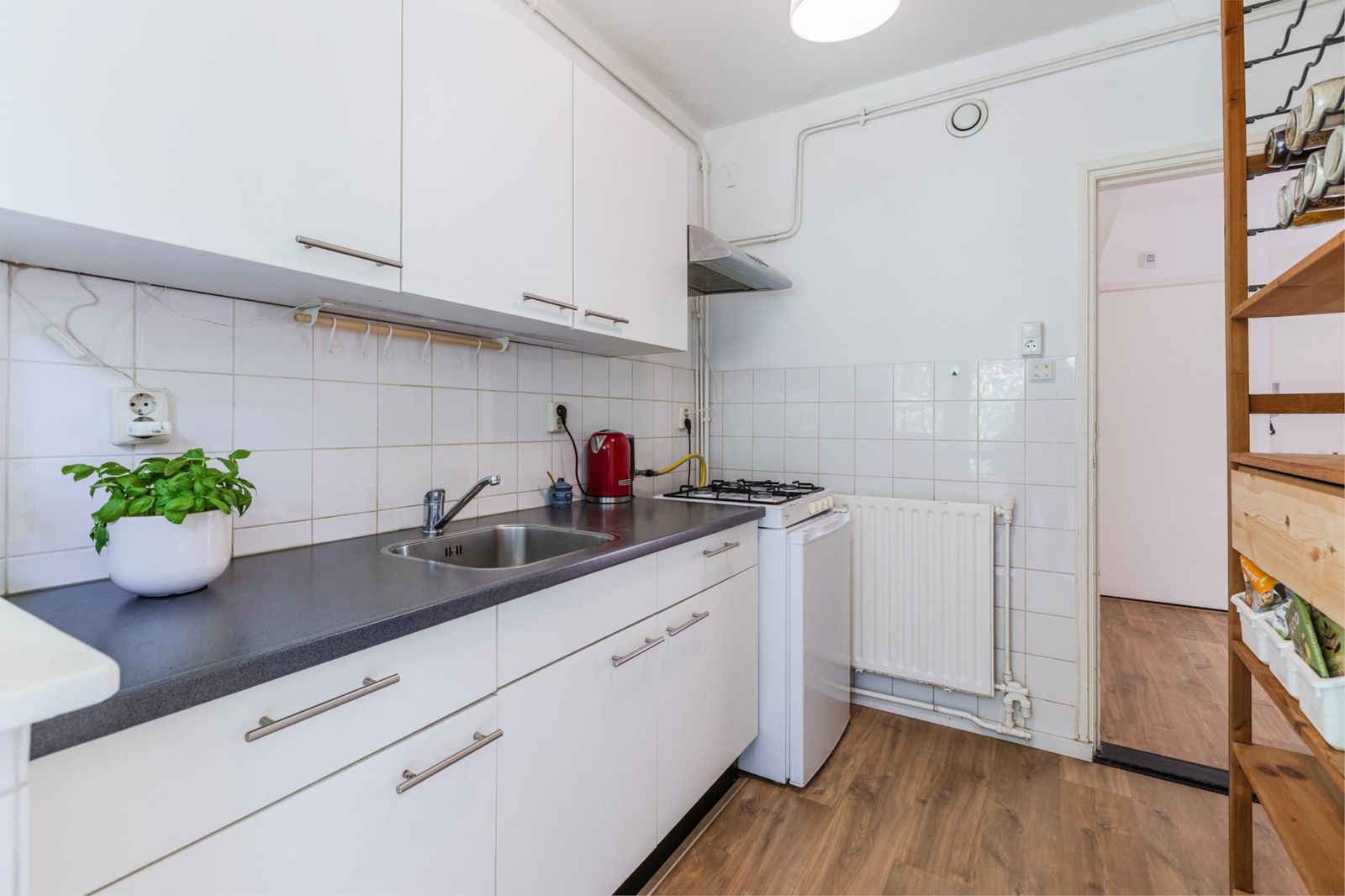 Je komt binnen in een ruime hal. De lichte woonkamer is voorzien van een inbouwkast en grenst aan een zijkamer met openslaande deuren naar het balkon op het zuidoosten. De keuken is praktisch ingericht, voorzien van vaste kastruimte, koelkast en kookplaat. Deze geeft toegang tot het balkon op het noordwesten.
