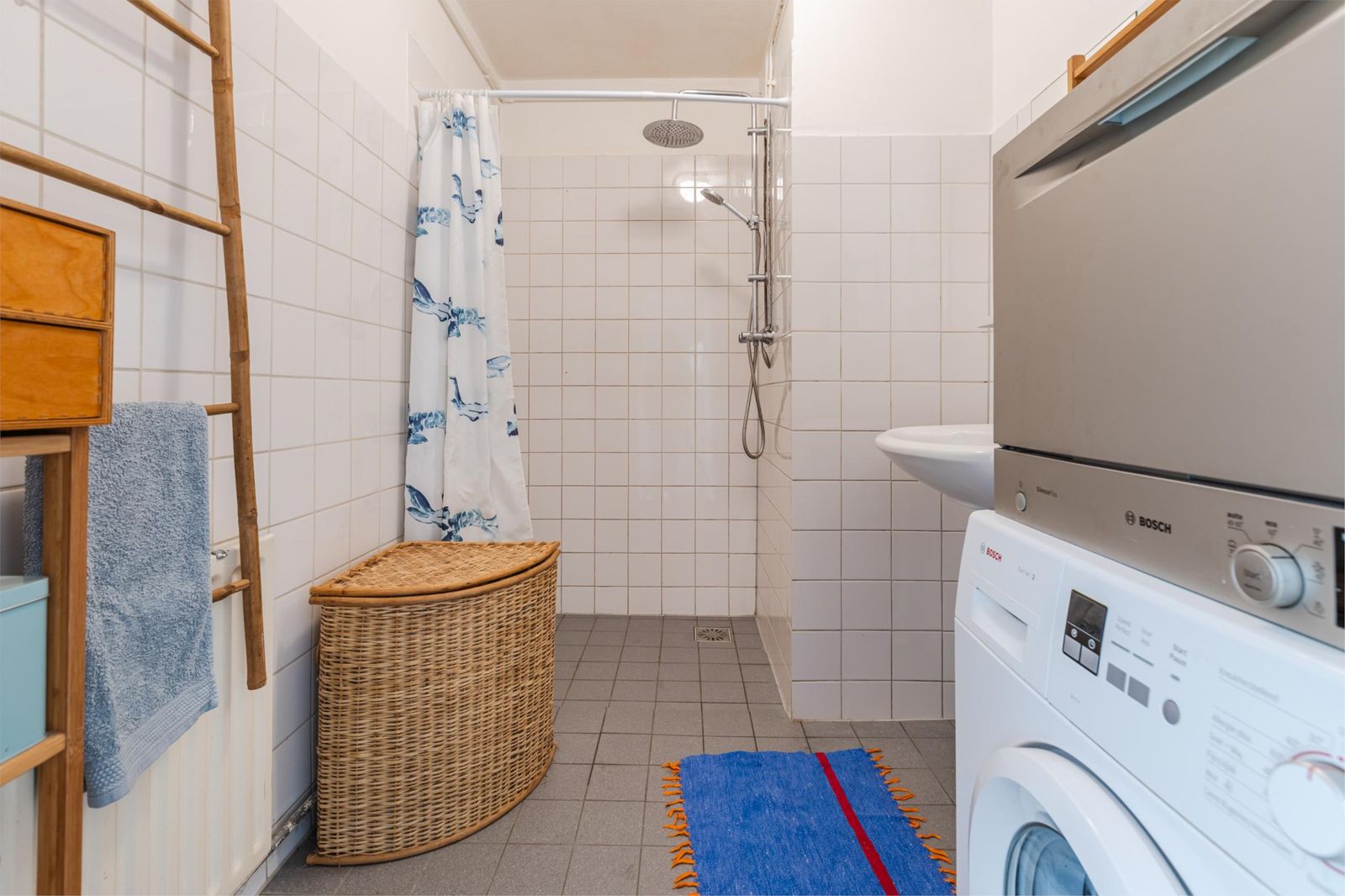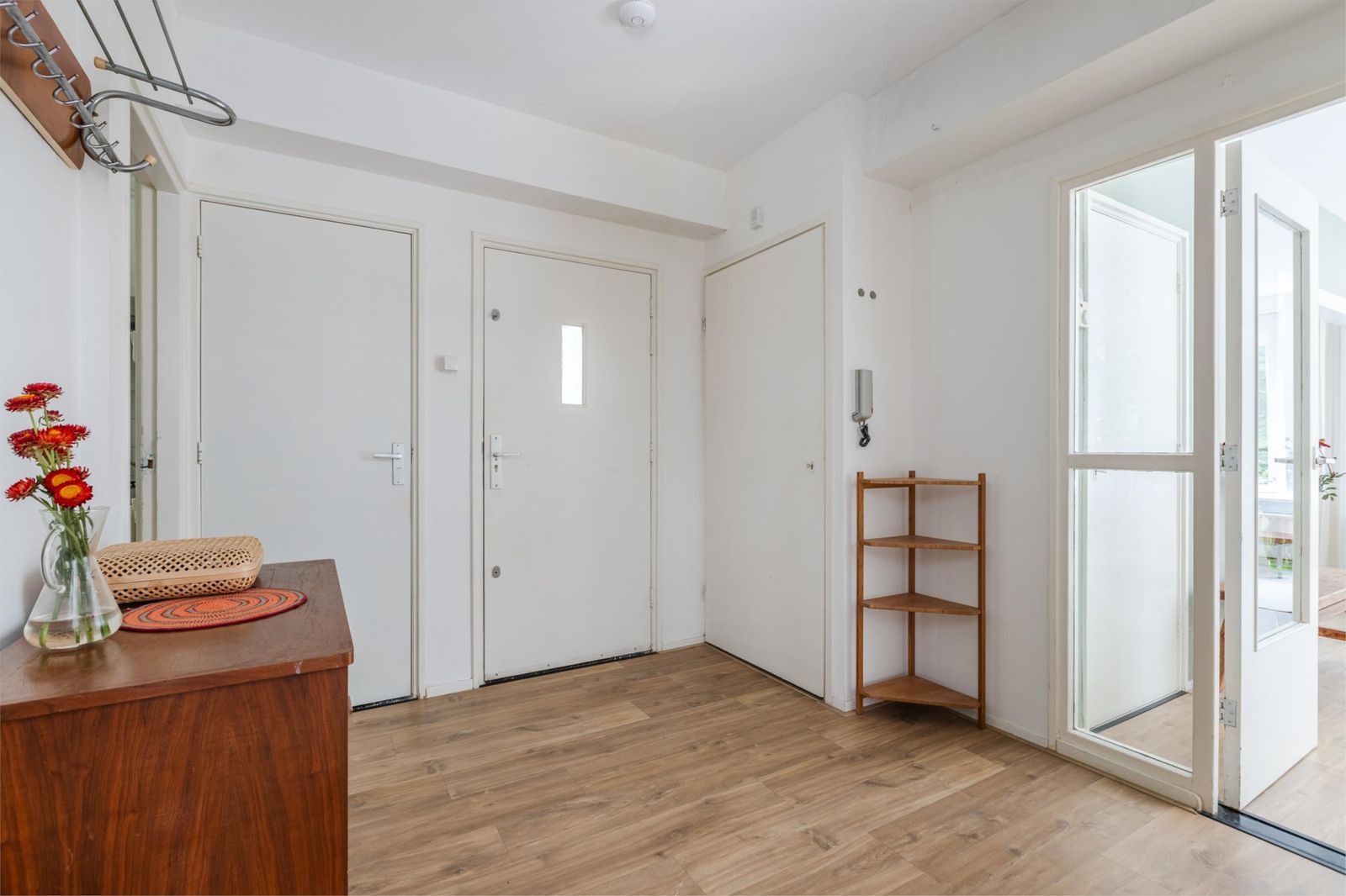 In de ruime hal komen alle vertrekken samen. Je bereikt hiervandaan de twee slaapkamers met vaste kasten, waarvan één ruim genoeg is voor een tweepersoonsbed en de andere perfect kan dienen als logeerkamer, kinderkamer of thuiswerkplek. Ook heb je vanuit de hal toegang tot apart toilet en de badkamer, voorzien van douche, wastafel en aansluiting voor de wasmachine. De hal is bovendien uitgerust met een intercom en een inbouwkast met technische ruimte.