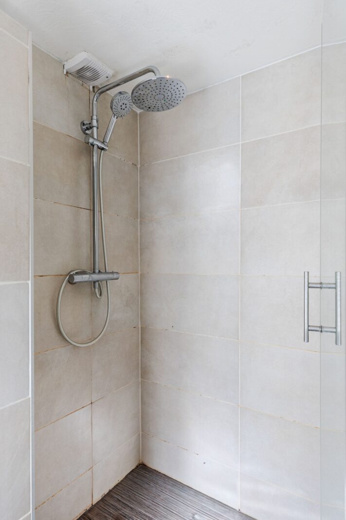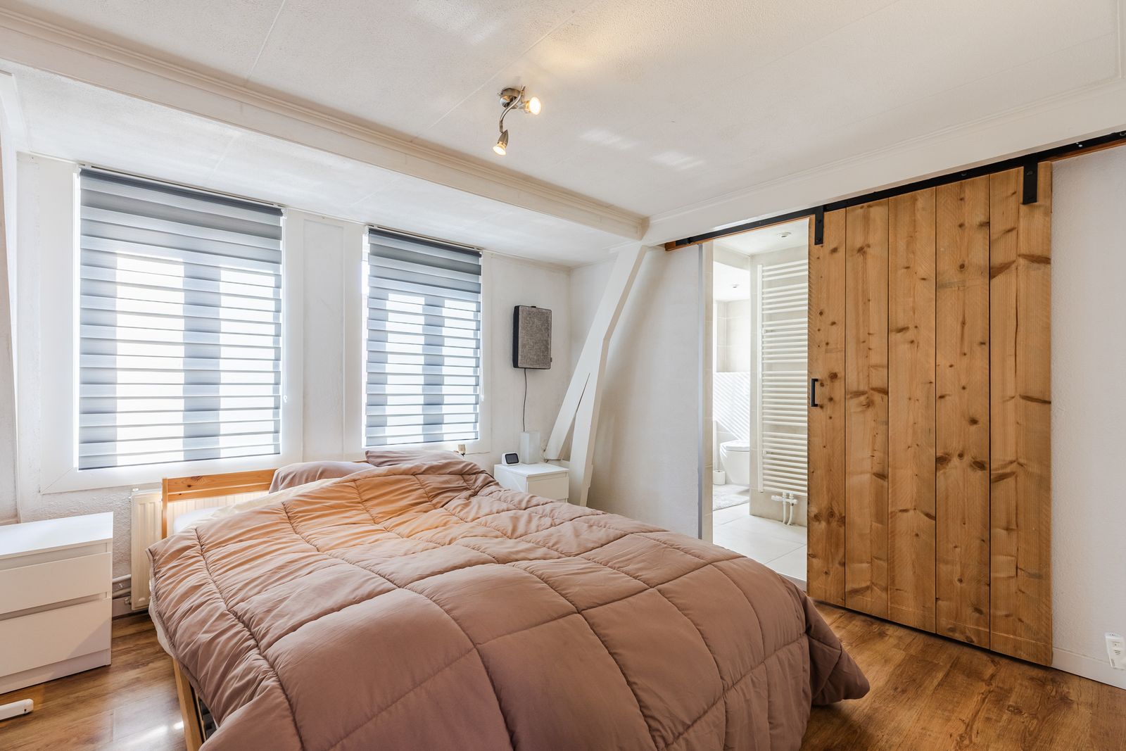Vanuit de woonkamer bereik je de ruime hoofdslaapkamer, voorzien van een dakkapel. De badkamer ligt en suite en is modern uitgevoerd met een stortdouche, wastafel, handdoekenradiator en een tweede toilet.