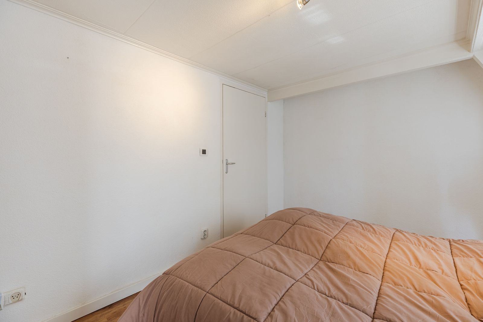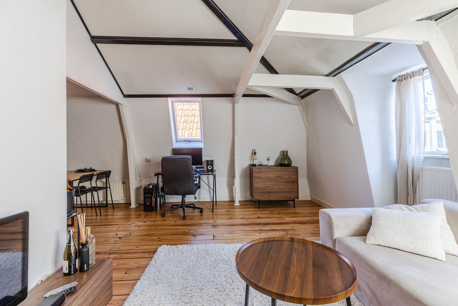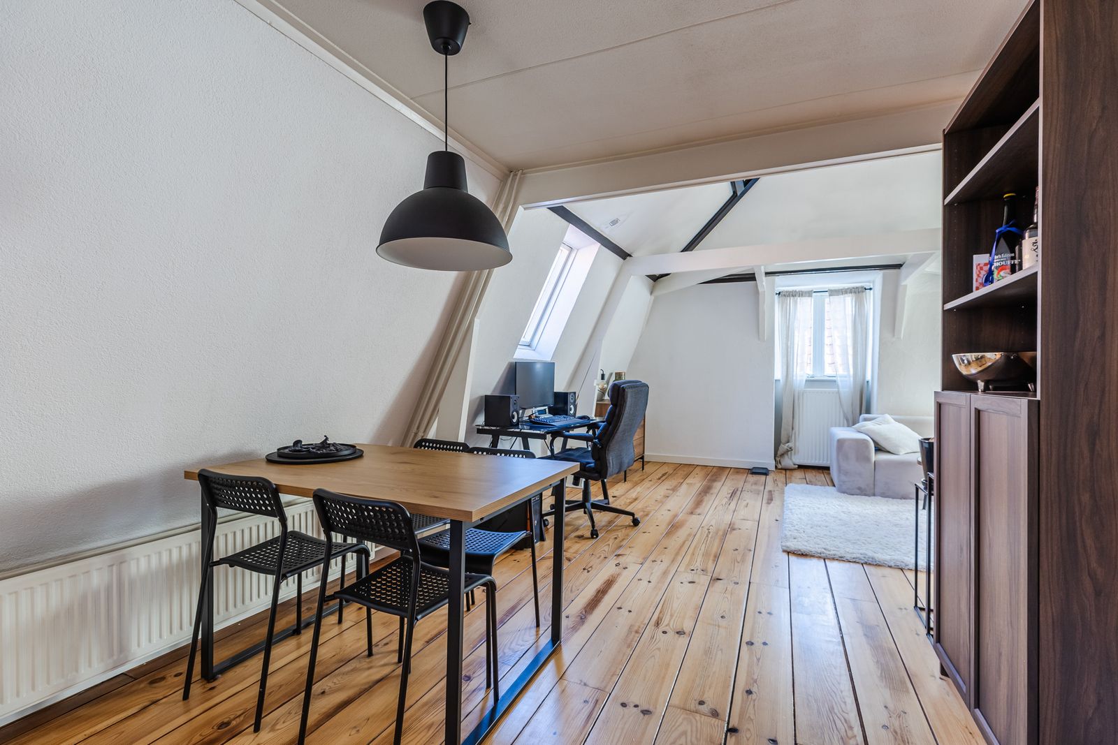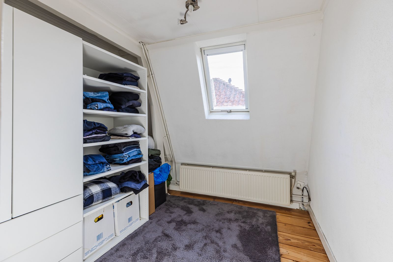 De tweede slaapkamer, eveneens toegankelijk vanuit de woonkamer, beschikt over een groot dakraam en is ideaal als logeerkamer, werkruimte of hobbykamer.