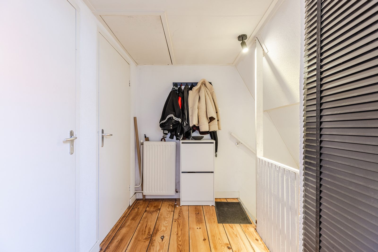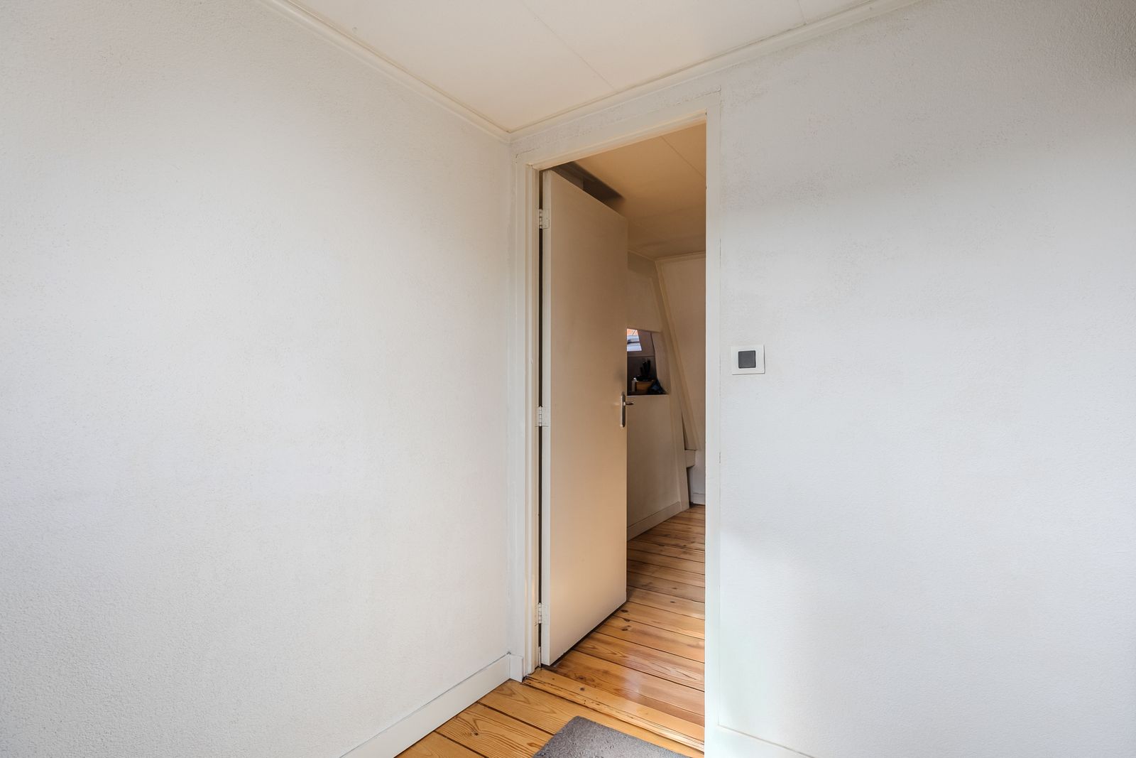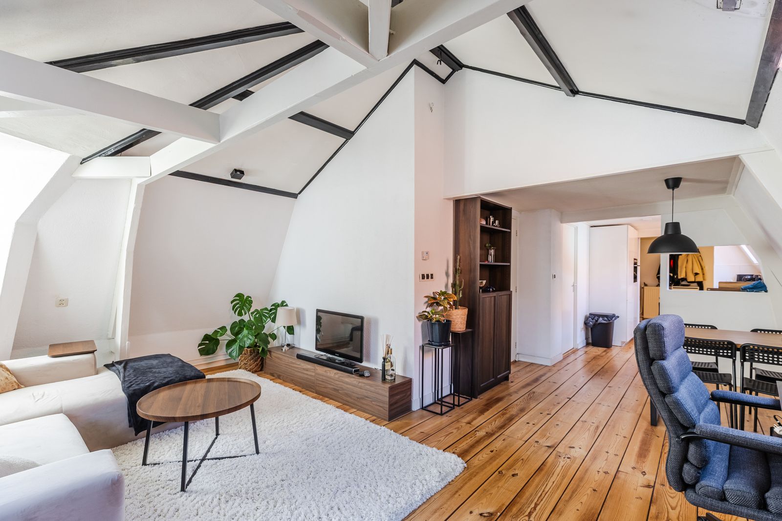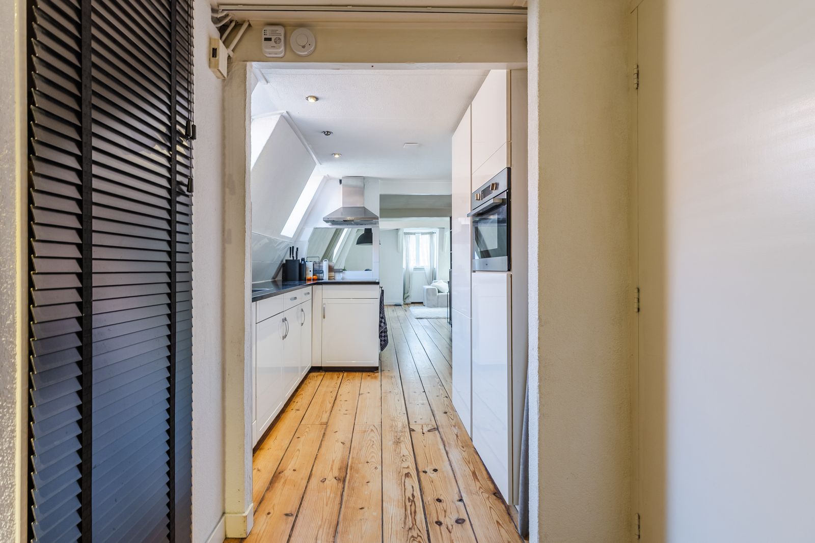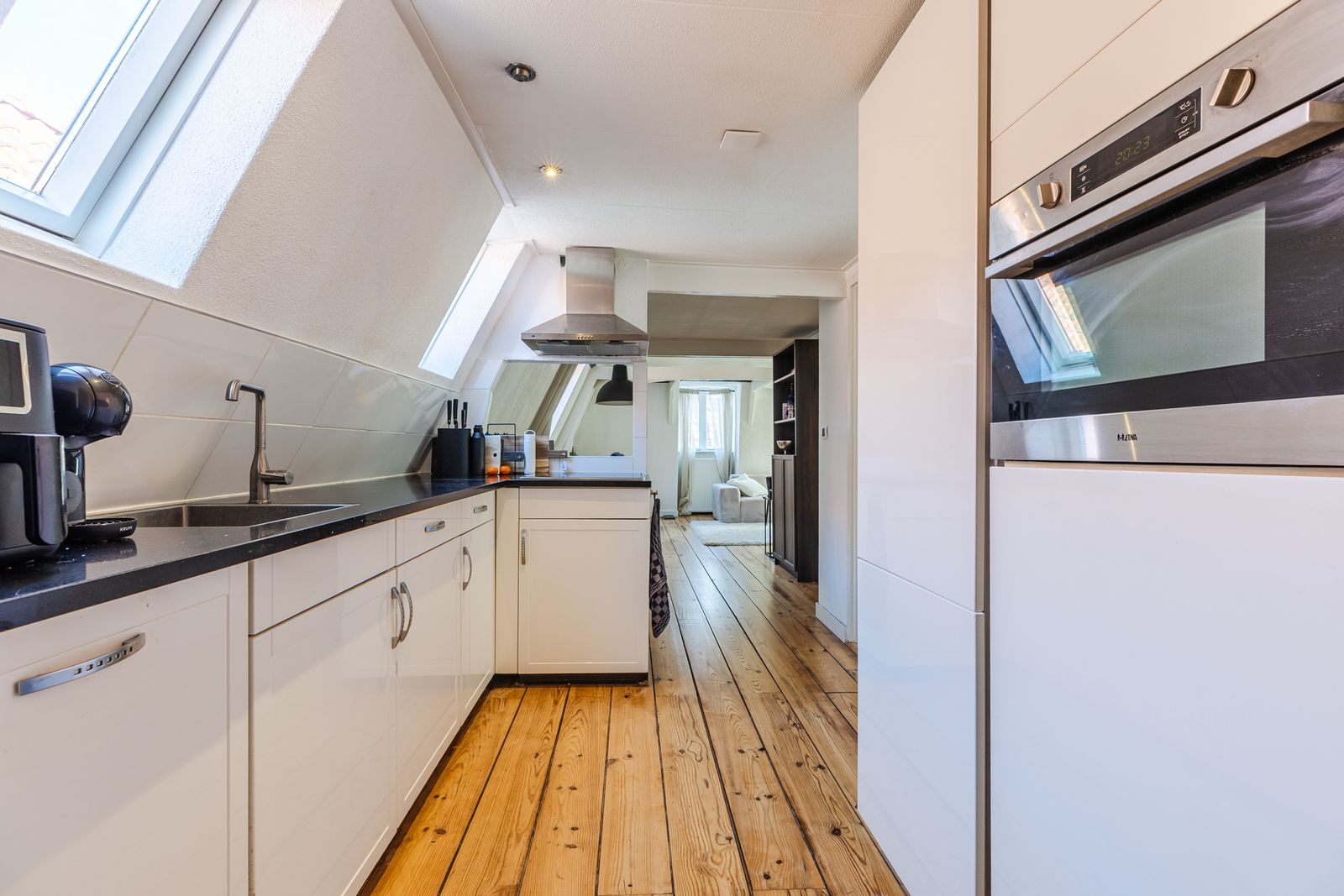 Via de entree op de tweede verdieping stap je binnen in de ruime en sfeervolle woonkamer. Voorzien van een fraaie houten vloer, met veel lichtinval. Samen zorgt het voor een warme uitstraling en veel natuurlijk licht, waardoor de ruimte fris en modern oogt.