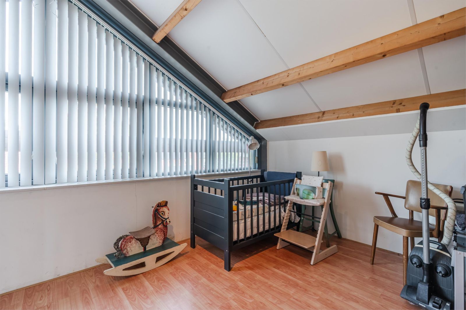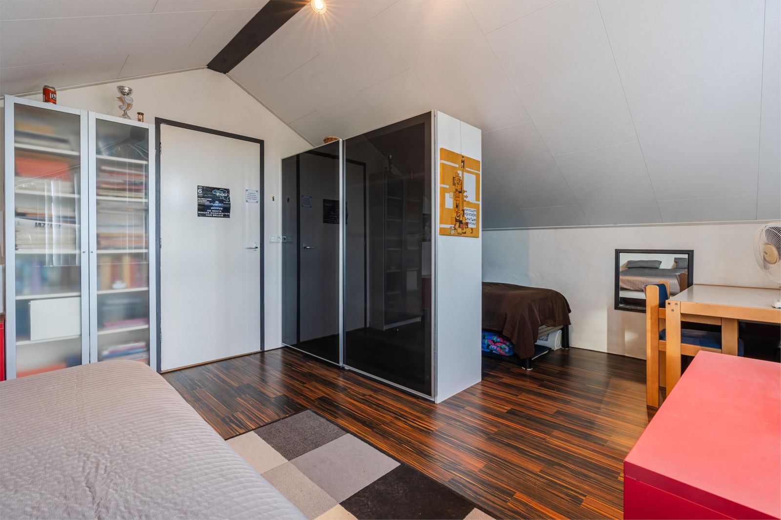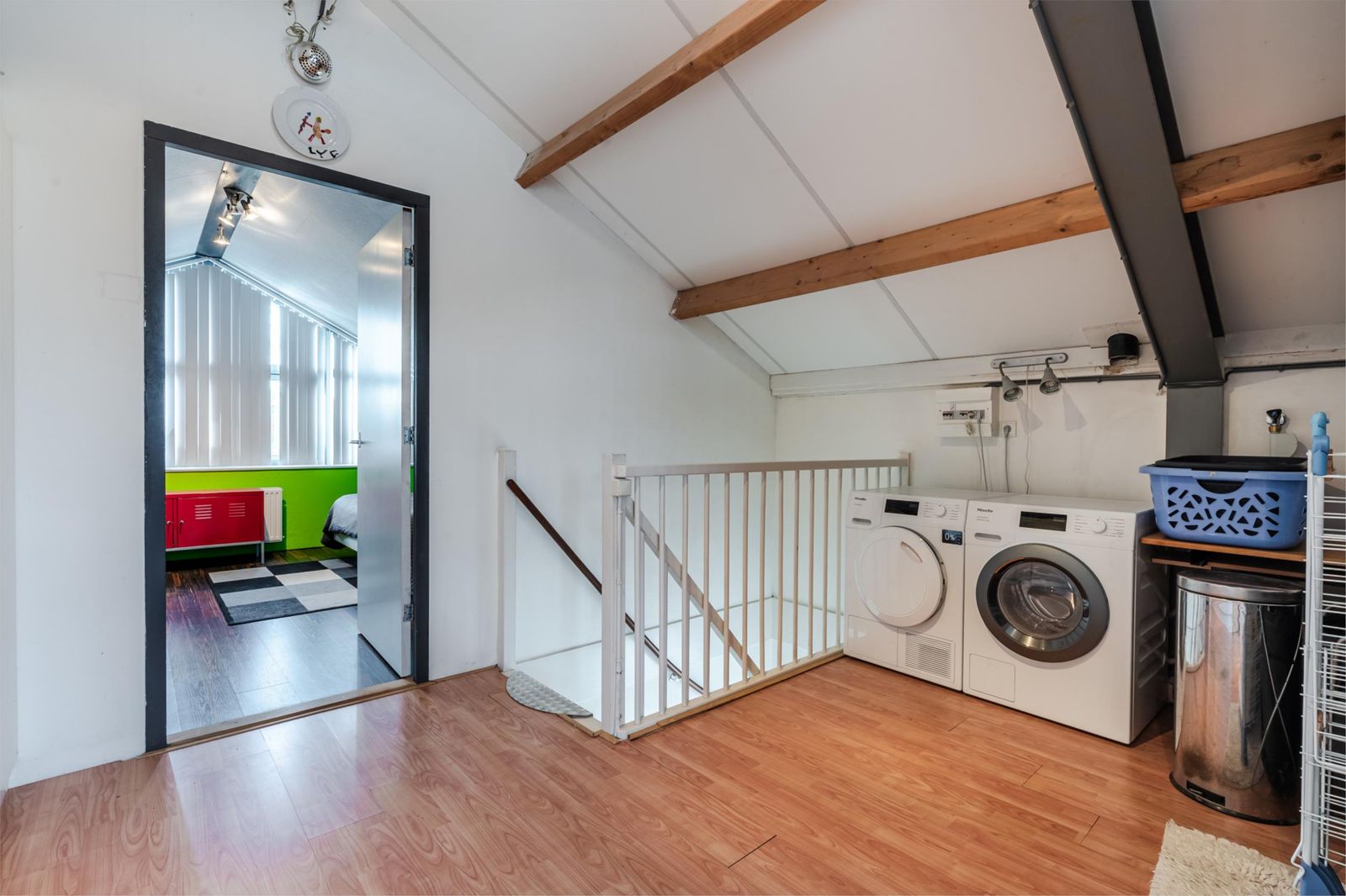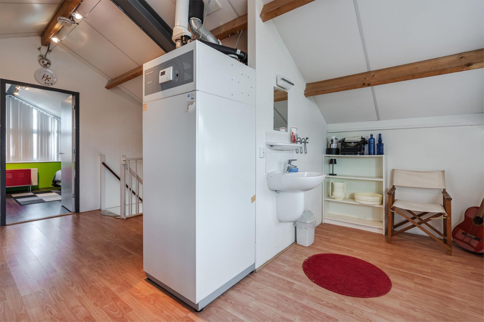 Deze is erg licht en ruim, doordat het schuine dak pas op 1,50 meter hoogte begint. De ruimte is in tweeën gedeeld: