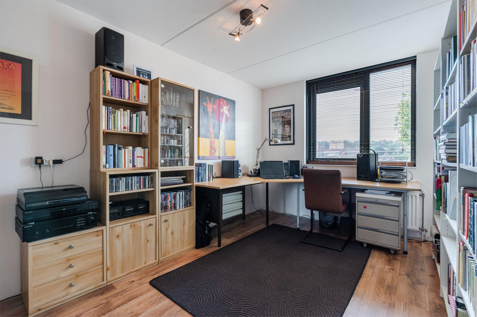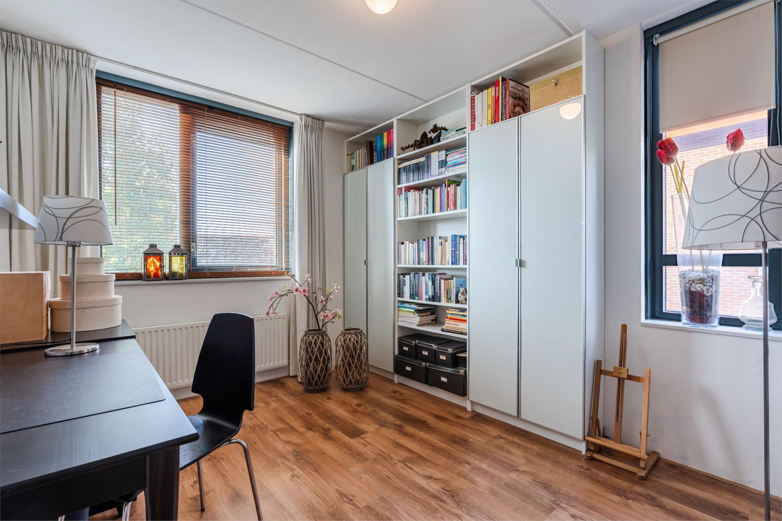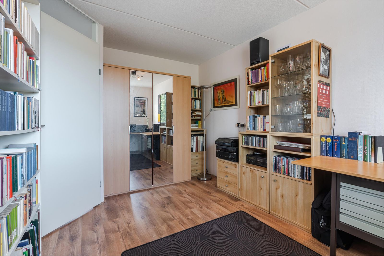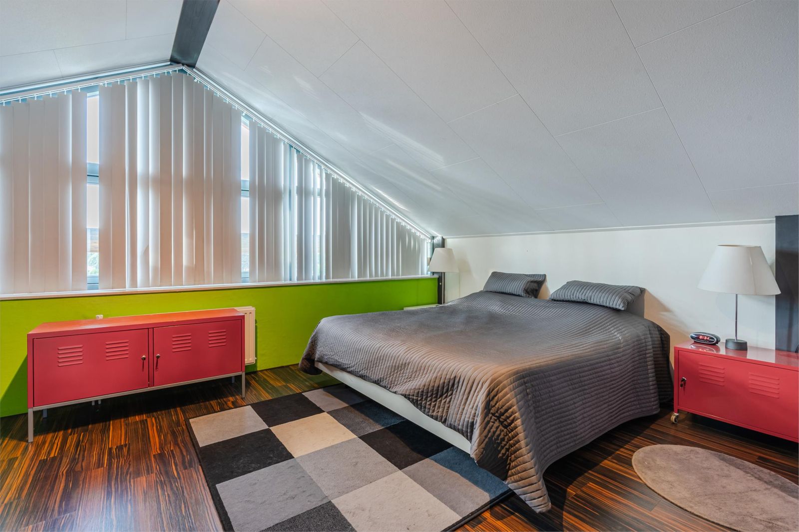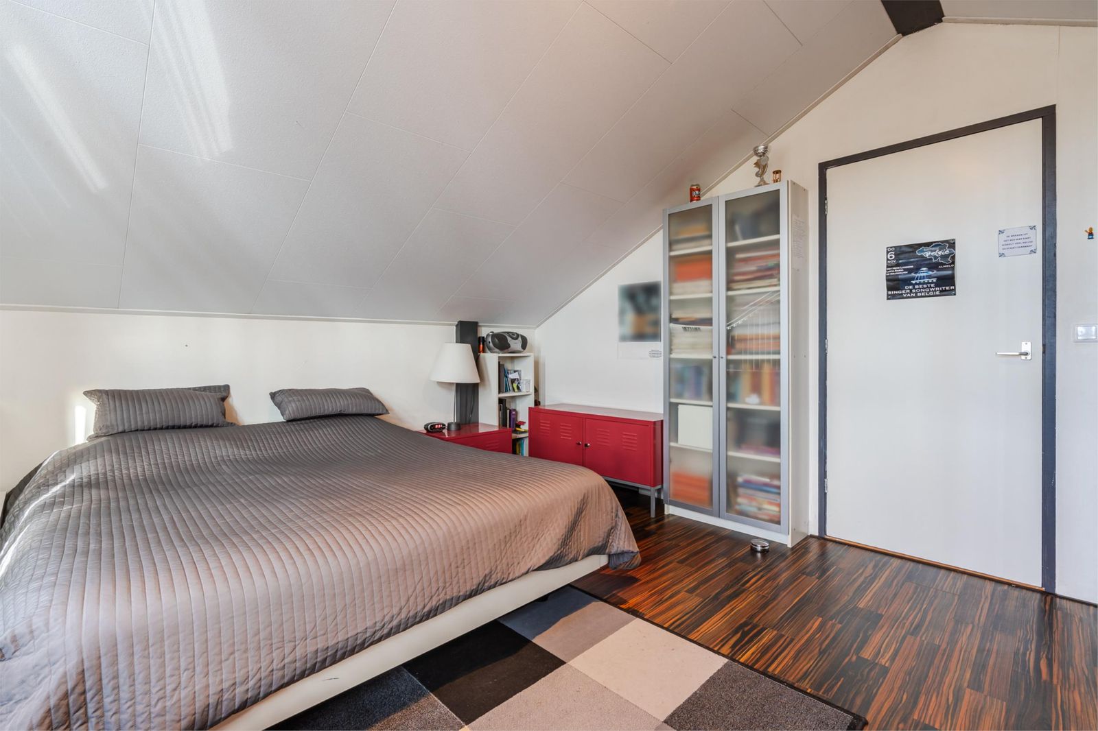 Deze is erg licht en ruim, doordat het schuine dak pas op 1,50 meter hoogte begint. De ruimte is in tweeën gedeeld: