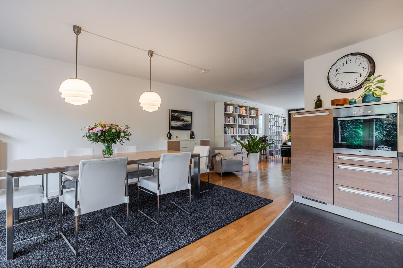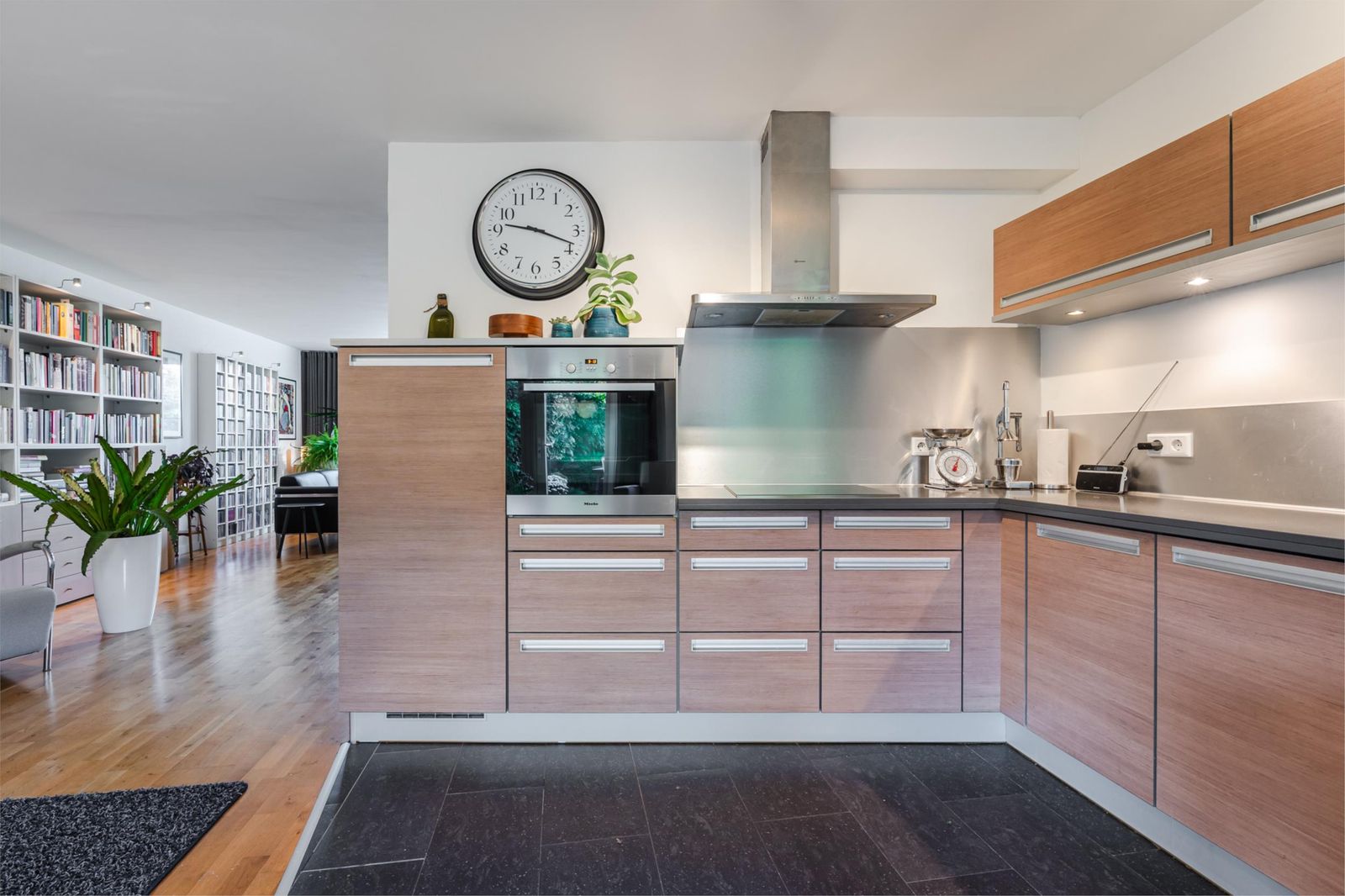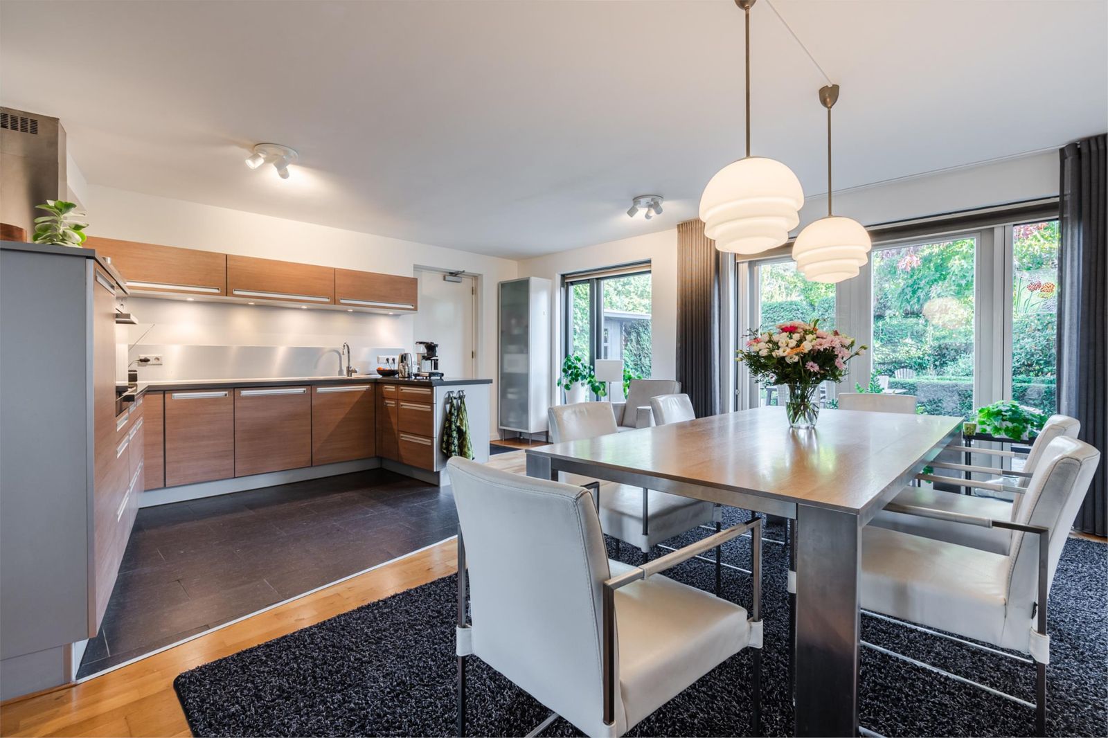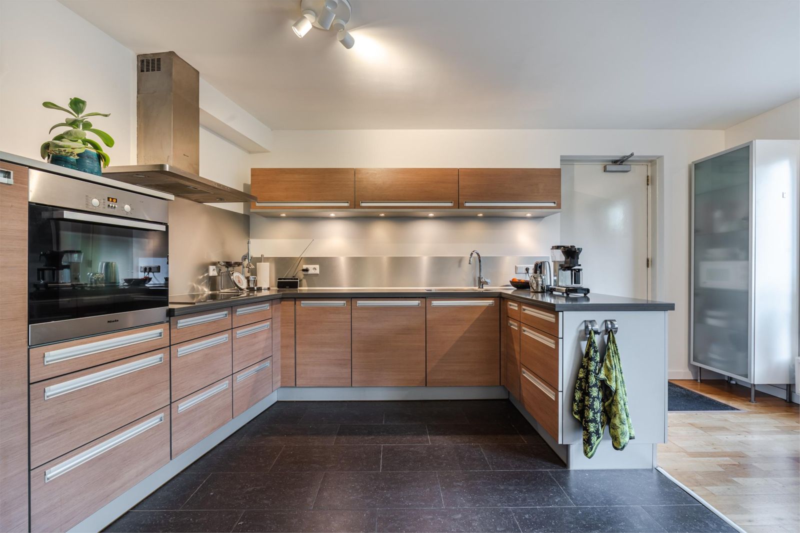 * Open keuken met tegelvloer, voorzien van inbouwapparatuur (koelkast, oven, inductiekookplaat, vaatwasser). Via een brede deur toegang tot de