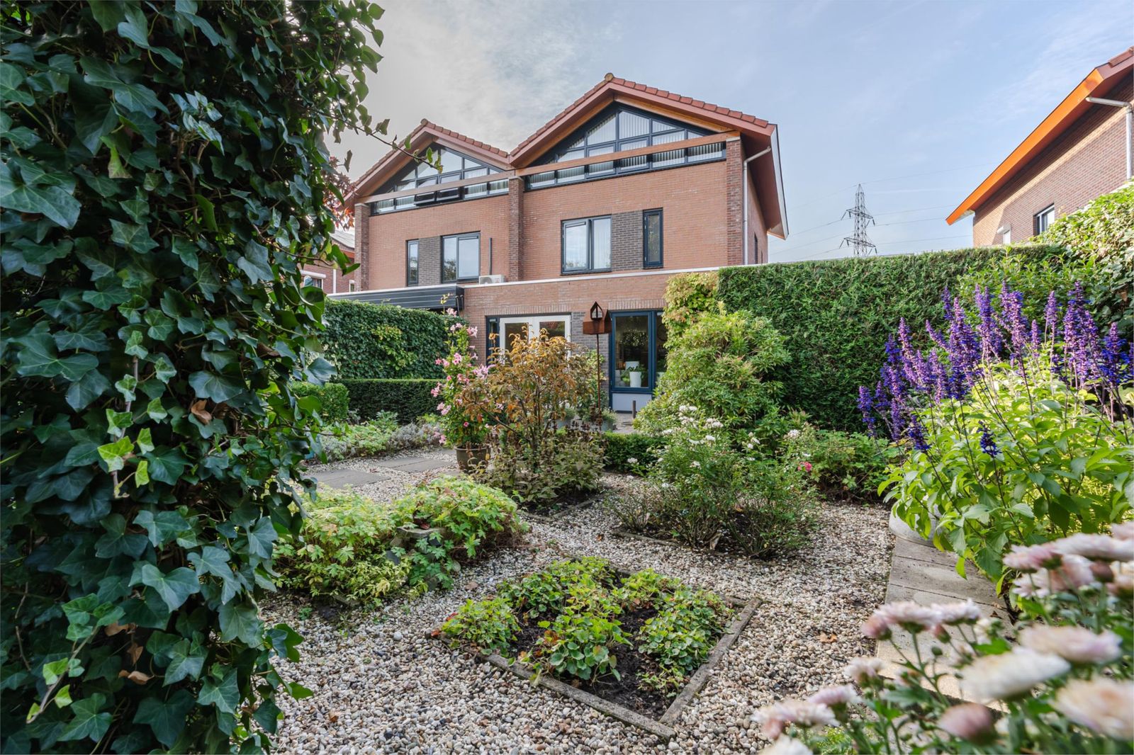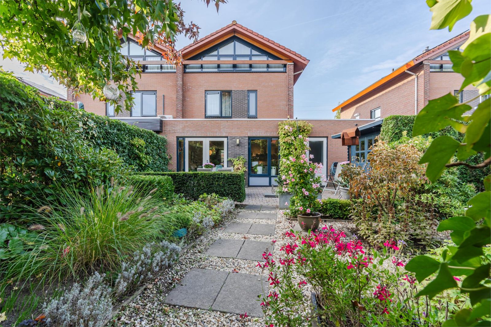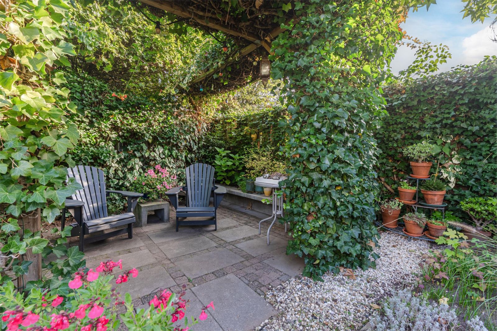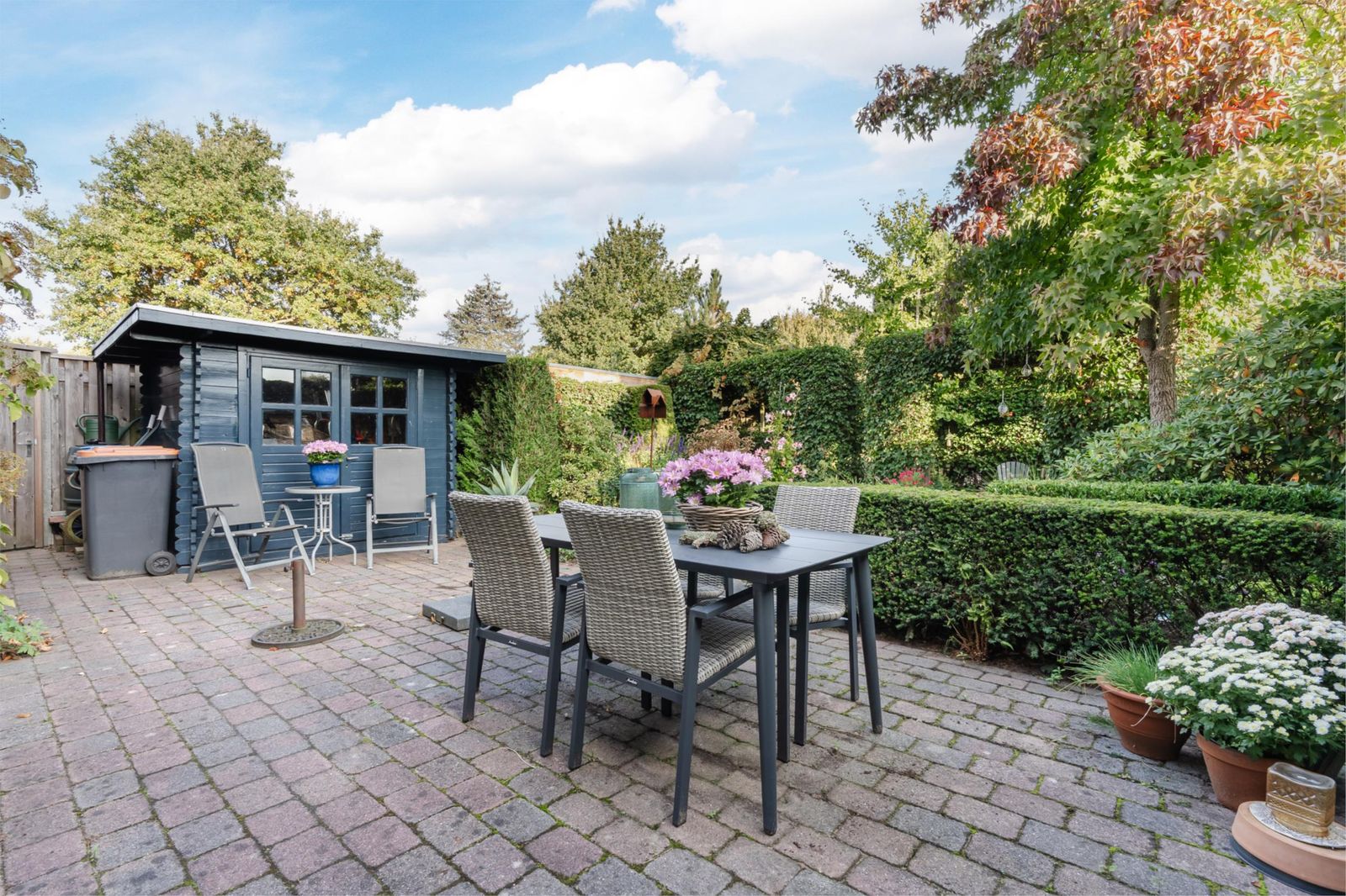 Naast de garage bereik je via een achterom en een poort de achtertuin. Deze tuin op het noorden is diep, zodat er toch voldoende plekken zijn om heerlijk in de zon te zitten. Met veel liefde hebben de bewoners de tuin ontworpen en vormgegeven met veel verrassende zitjes en doorkijkjes. De begroeiing rondom zorgt ervoor dat de tuin ook 's winters groen is. Direct bij de poort staat een houten tuinschuurtje dat is voorzien van elektriciteit.
