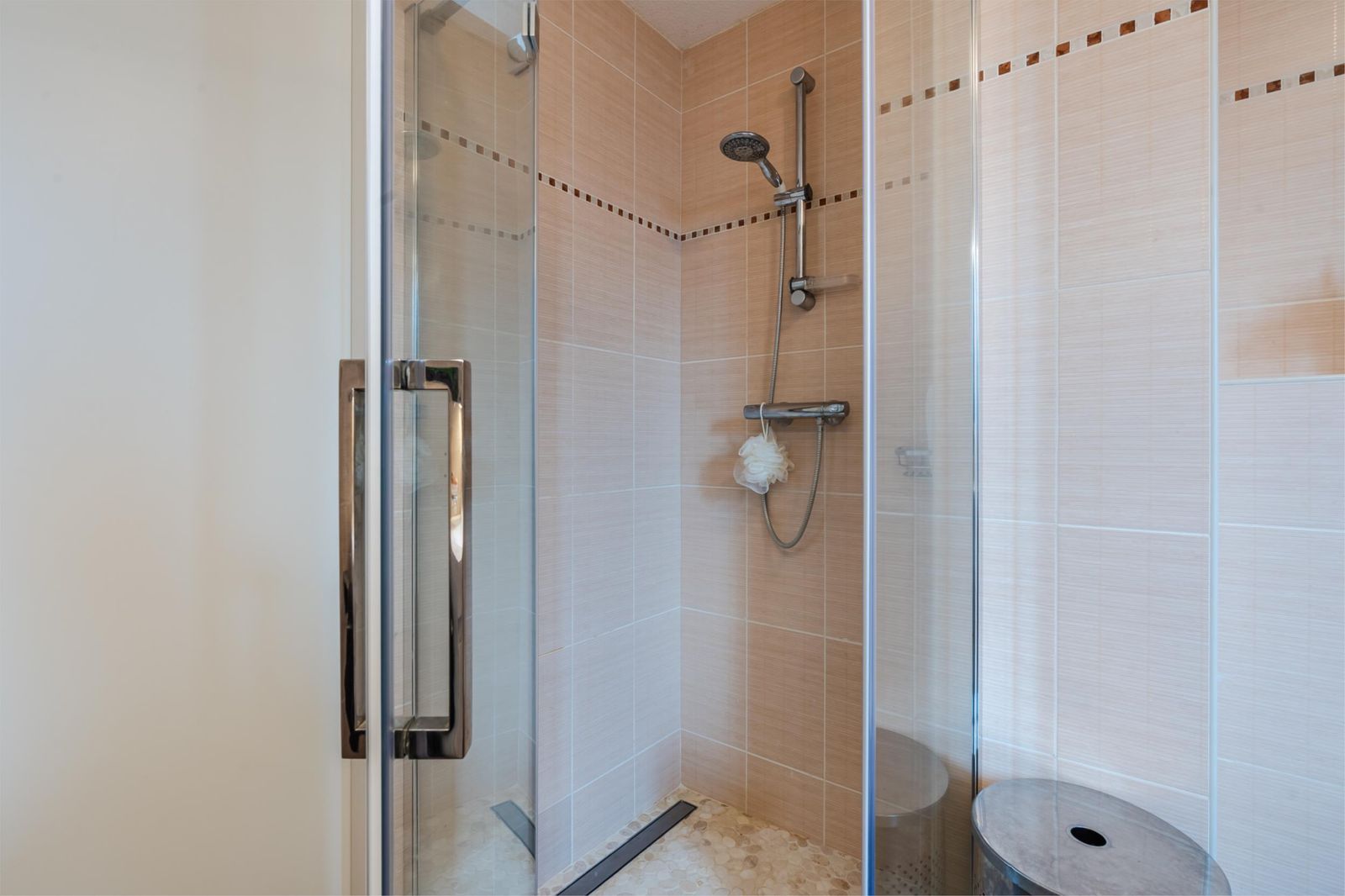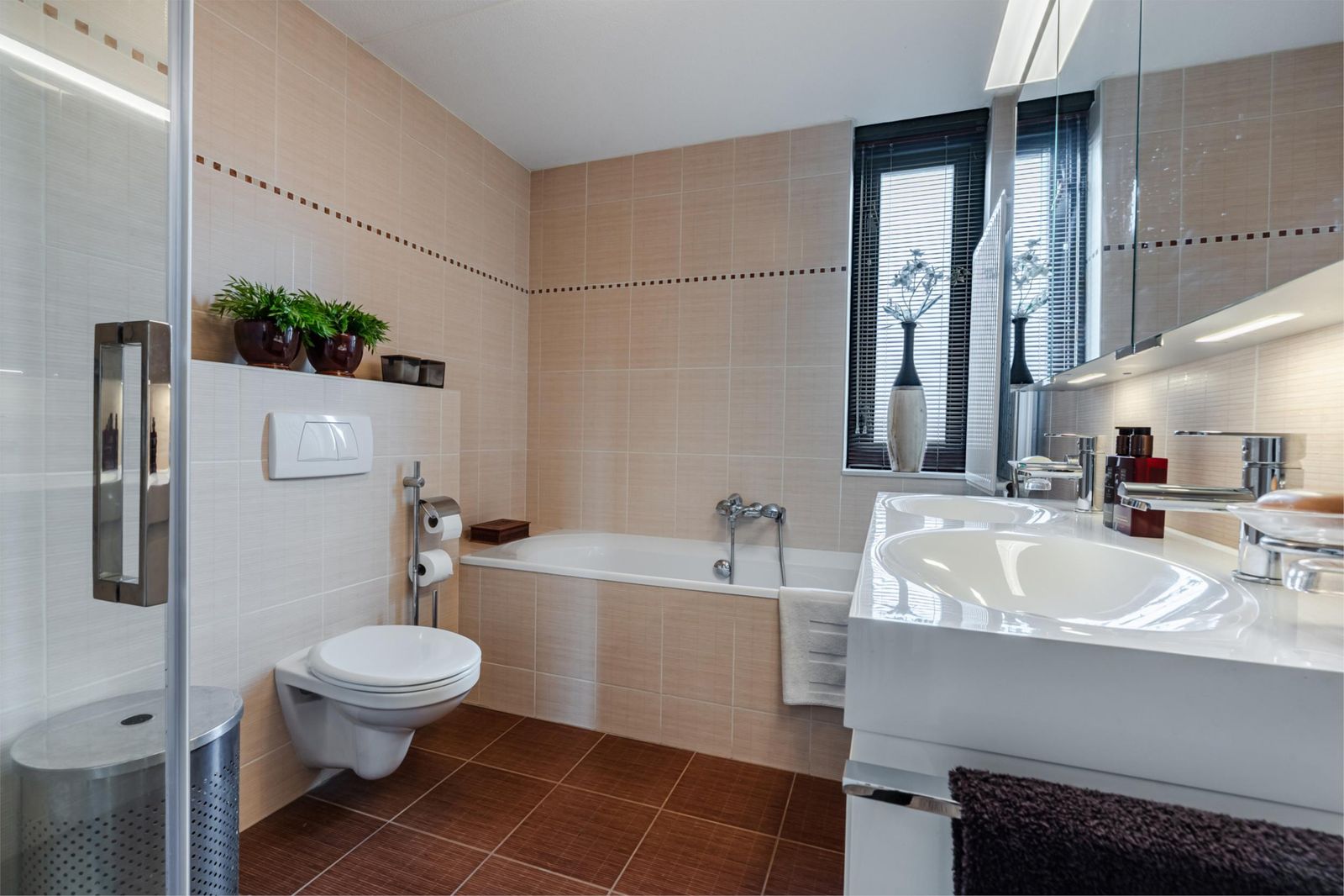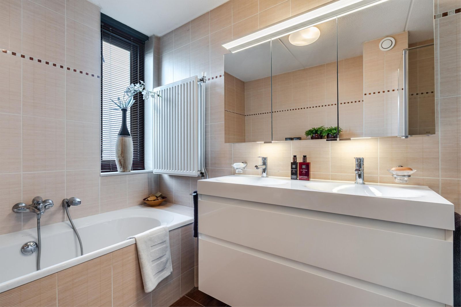 *Badkamer: ruime douche met glazen wanden, toilet, ligbad, dubbele wastafel met onderkast en een bovenkast met spiegels en verlichting. Via een vaste trap kom je op de