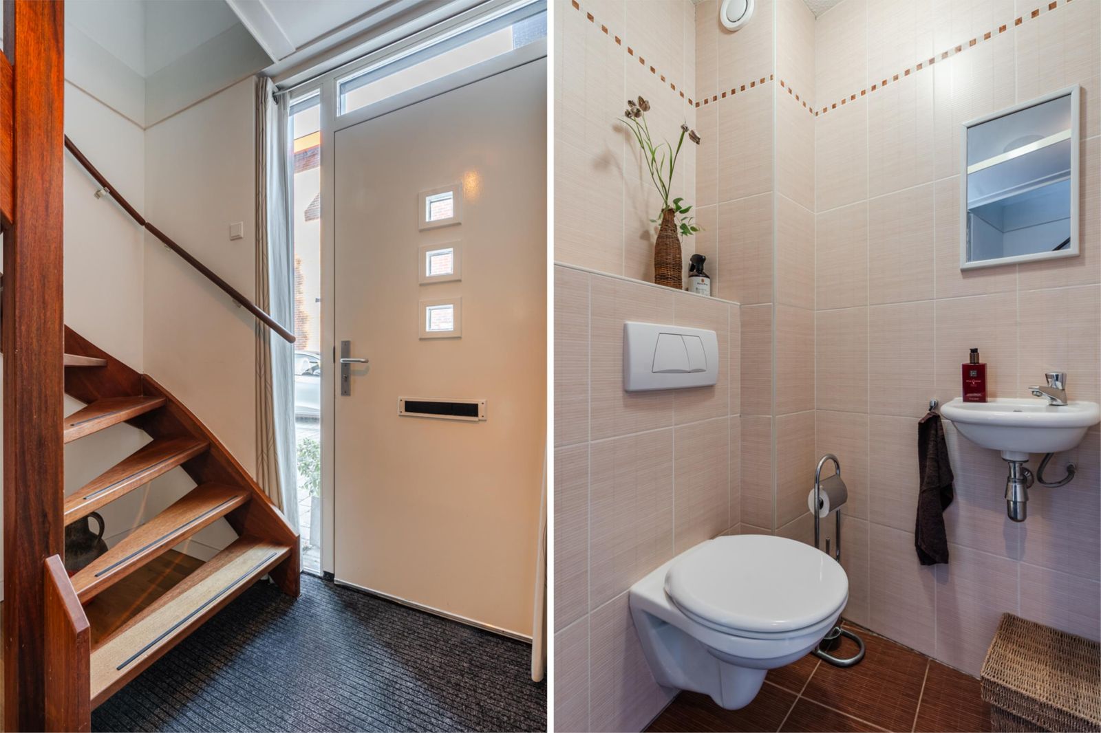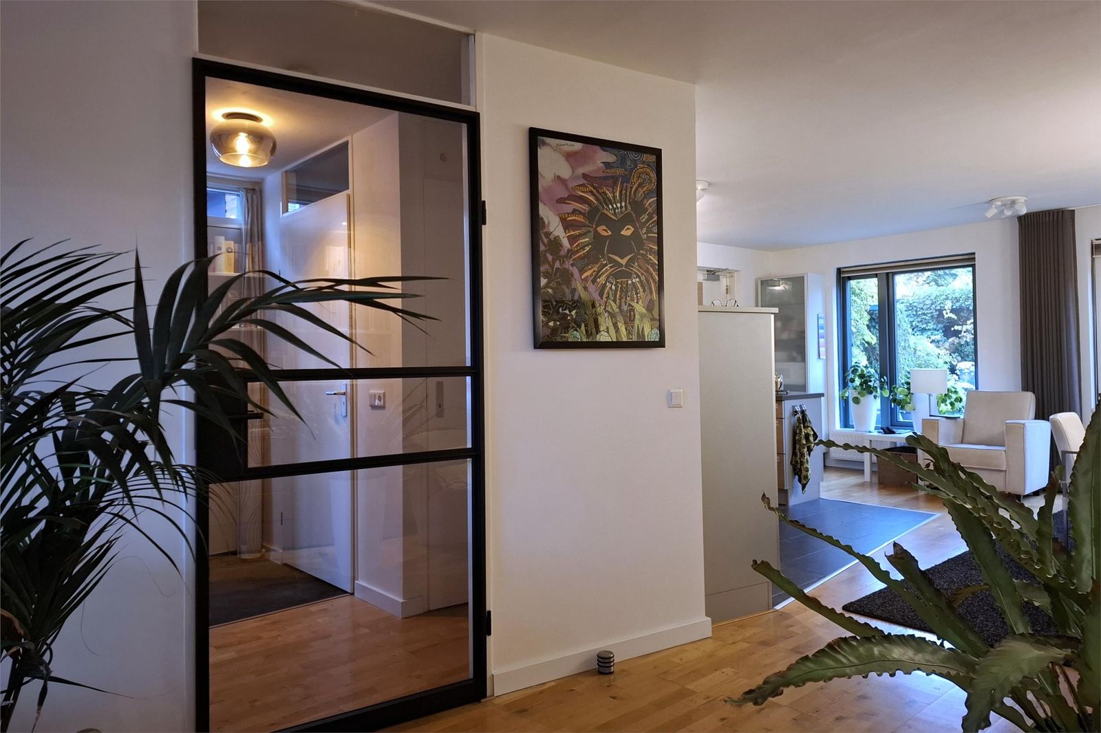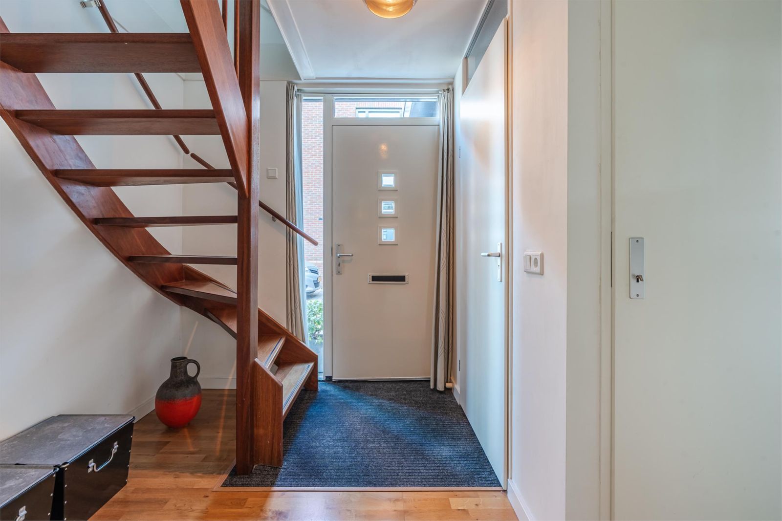 * Entree: lichte hal met toilet, meterkast en trapopgang naar de eerste verdieping. Vanuit de hal kom je via een moderne glazen deur in de