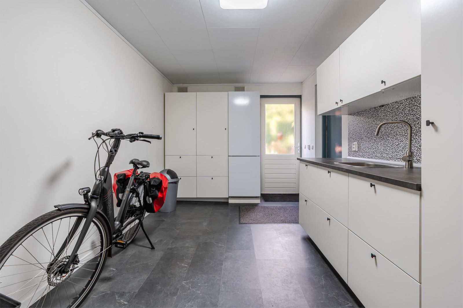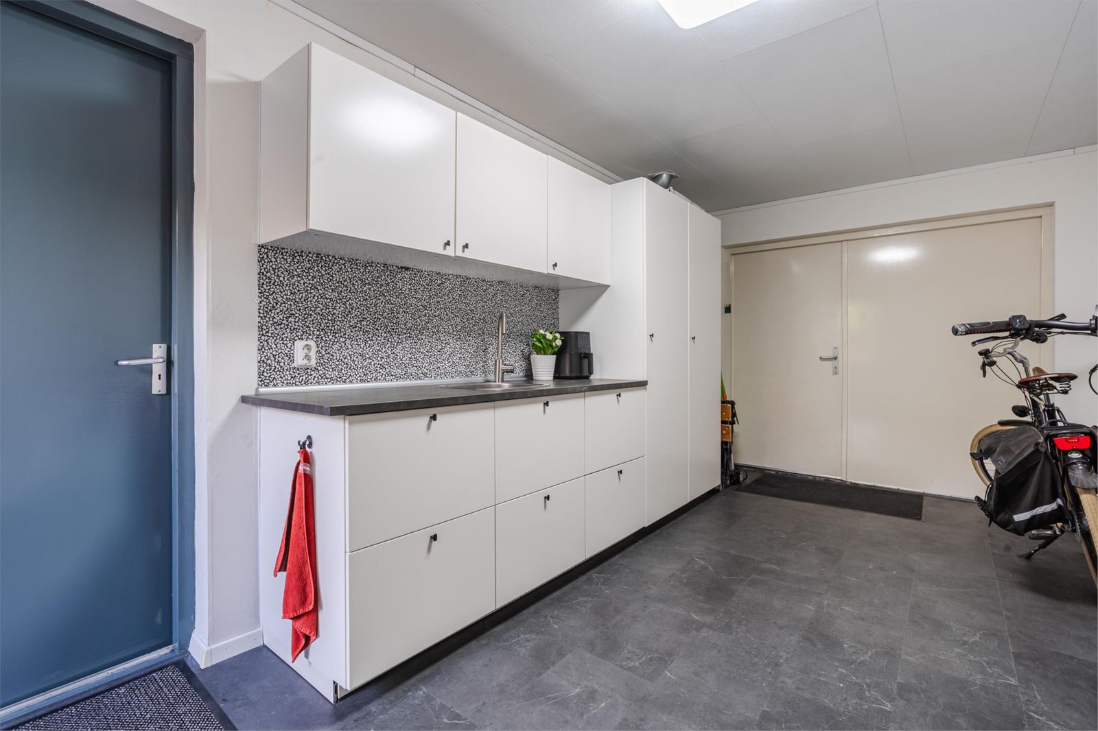 * Garage / bijkeuken: Rondom geïsoleerd. Er is een aanrecht met warm/koud stromend water en veel extra kastruimte. PVC-vloer. Openslaande houten deuren naar de oprit aan de voorzijde, achterdeur met veiligheidsglas naar de tuin.