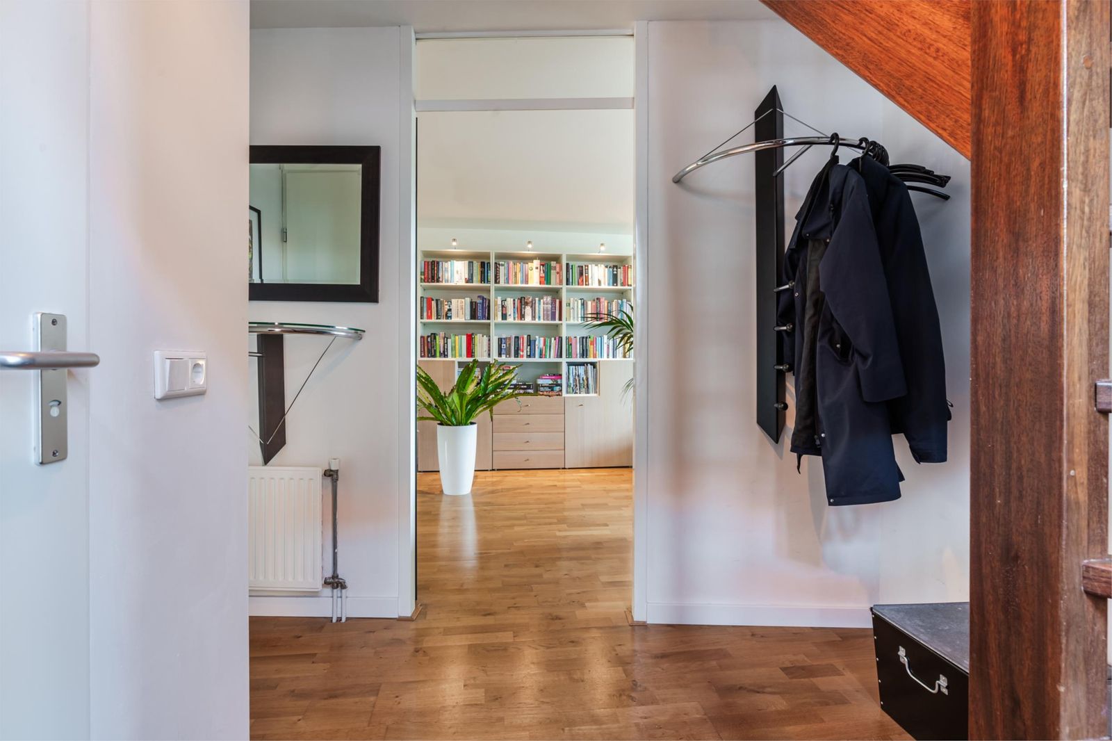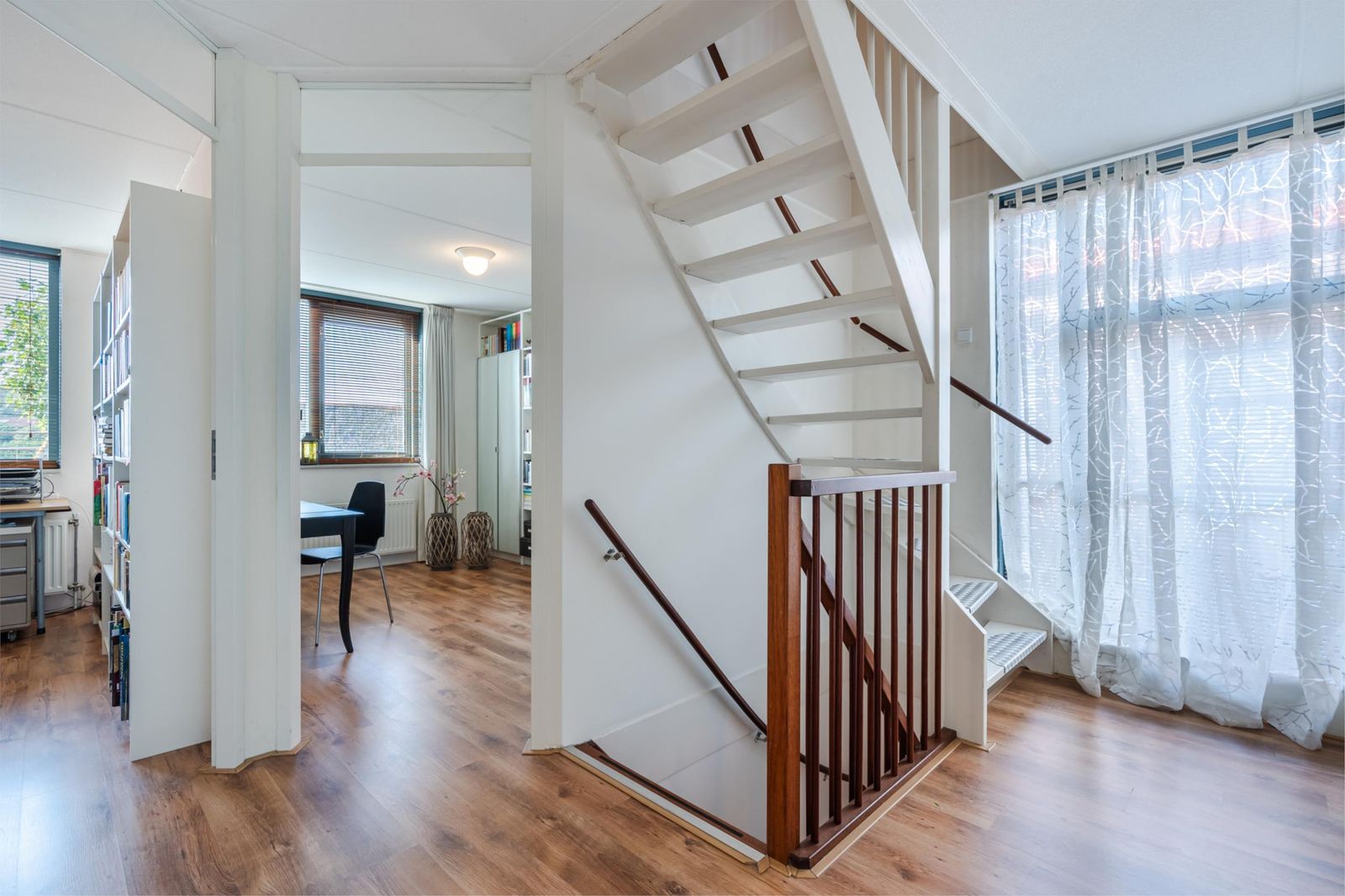 Vanuit de hal bereik je via een hardhouten trap de