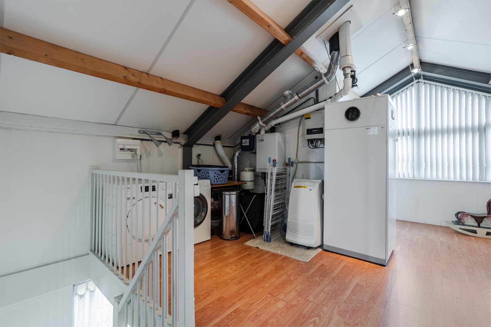 * Ruime zolder met bergruimte en aansluiting voor de wasmachine en de droger, Cv-ketel (2021) en apparatuur van de 12 zonnepanelen (2019), extra wastafel met warm/koud stromend water. Er is voldoende mogelijkheid om een vijfde slaapkamer te creëren.