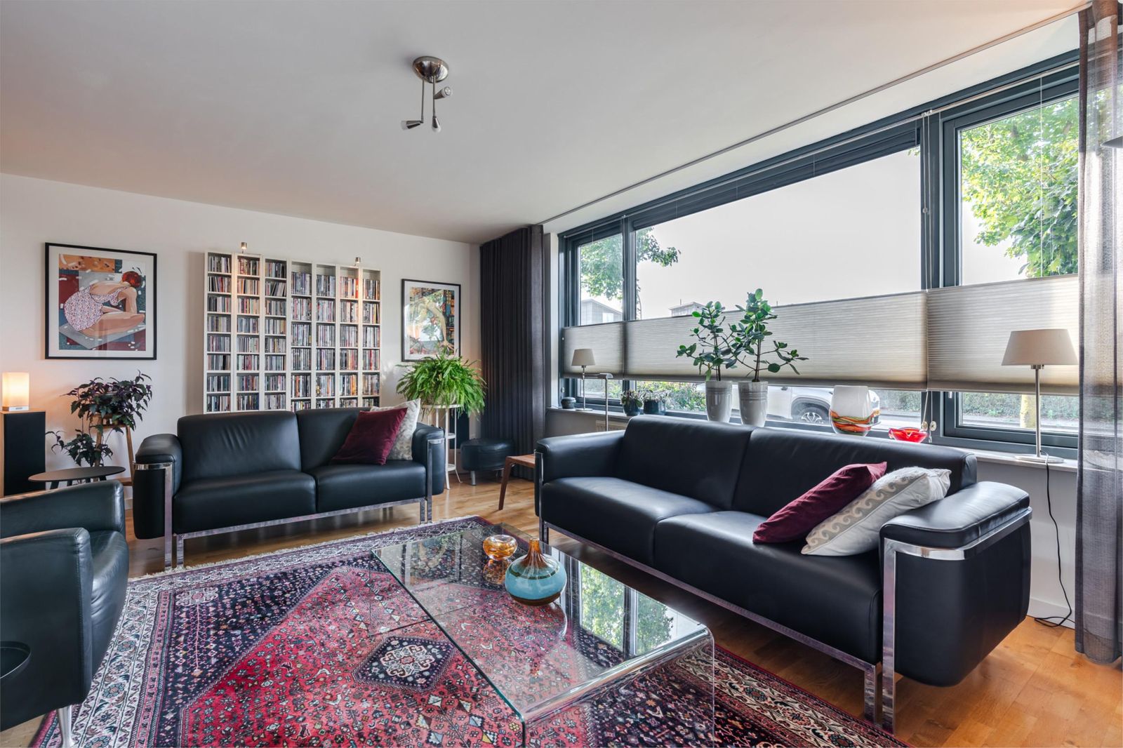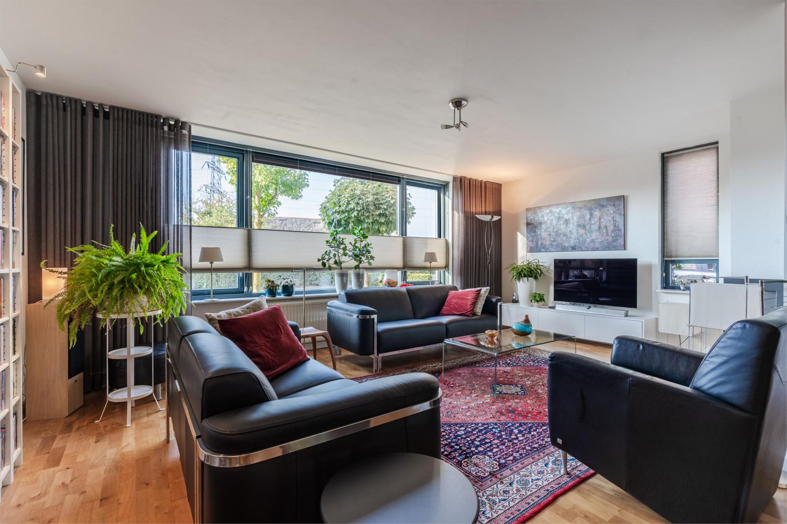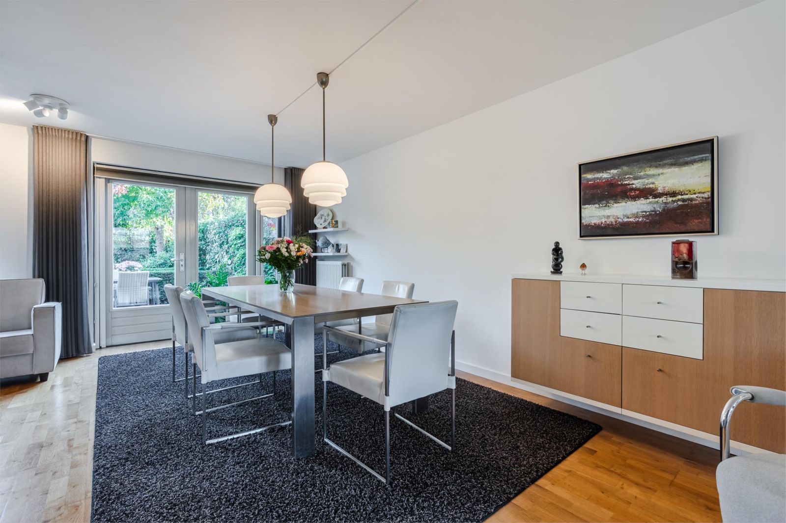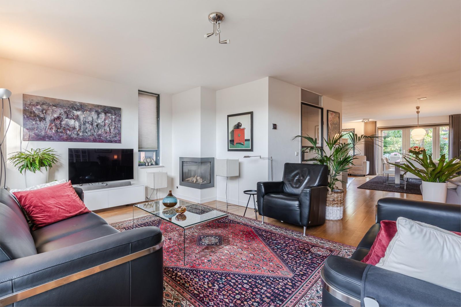 * Woonkamer: Deze is zeer ruim, met living op het zuiden. Het grote, kamerbrede raam is voorzien van een automatisch zonnescherm. Vloer van lichteiken parket. Moderne gaskachel met openhaard-vormgeving die zorgt voor warmte en sfeer. Aan de achterzijde is er plaats voor een grote eettafel. Openslaande deuren naar de tuin met plissé hordeuren. Aangrenzend is de