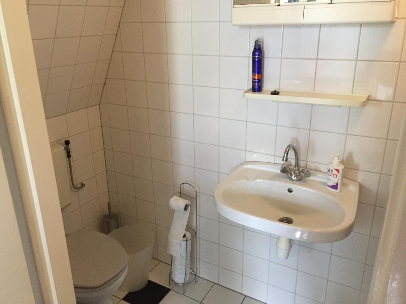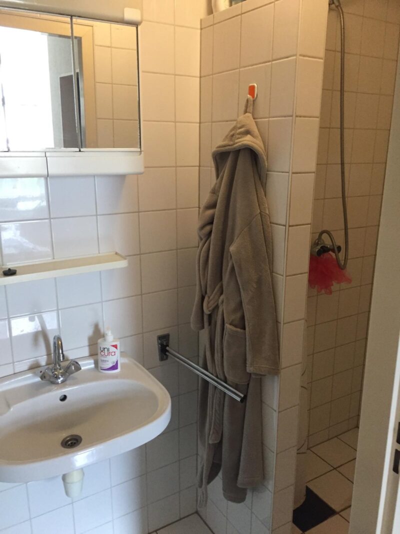 Gezamenlijke keuken en overloop. De keuken wordt gedeeld met één medebewoner. Beide bewoners hebben wel een eigen koelkast en eigen kastruimte.
