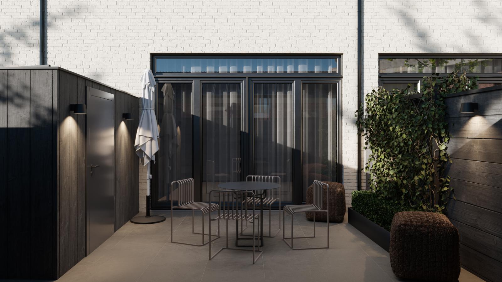 - Onderhoudsarme Tuin: Ideaal om te genieten van zonnige dagen, inclusief antraciet tegels (80x80 cm) en een composiet schutting.