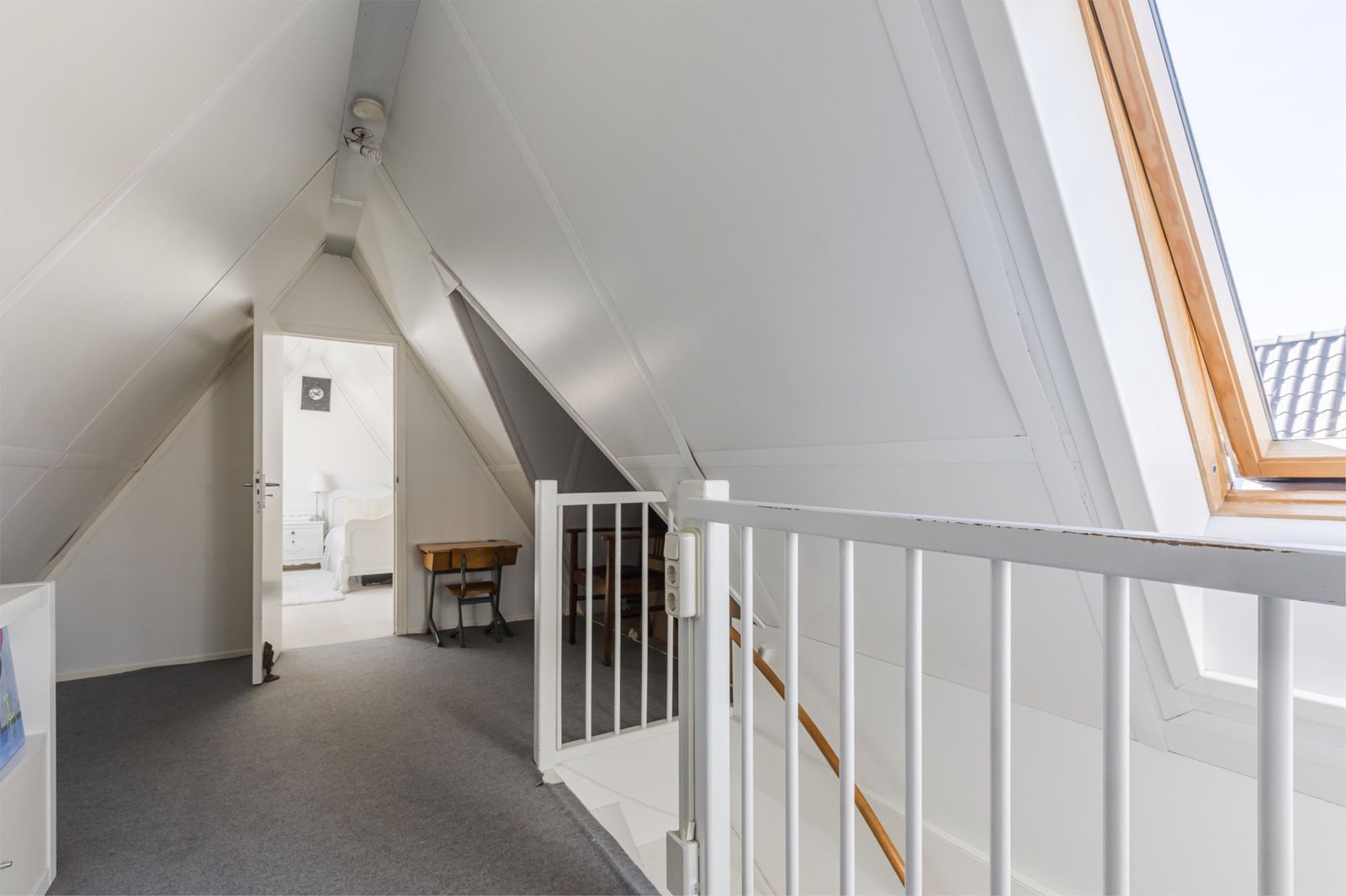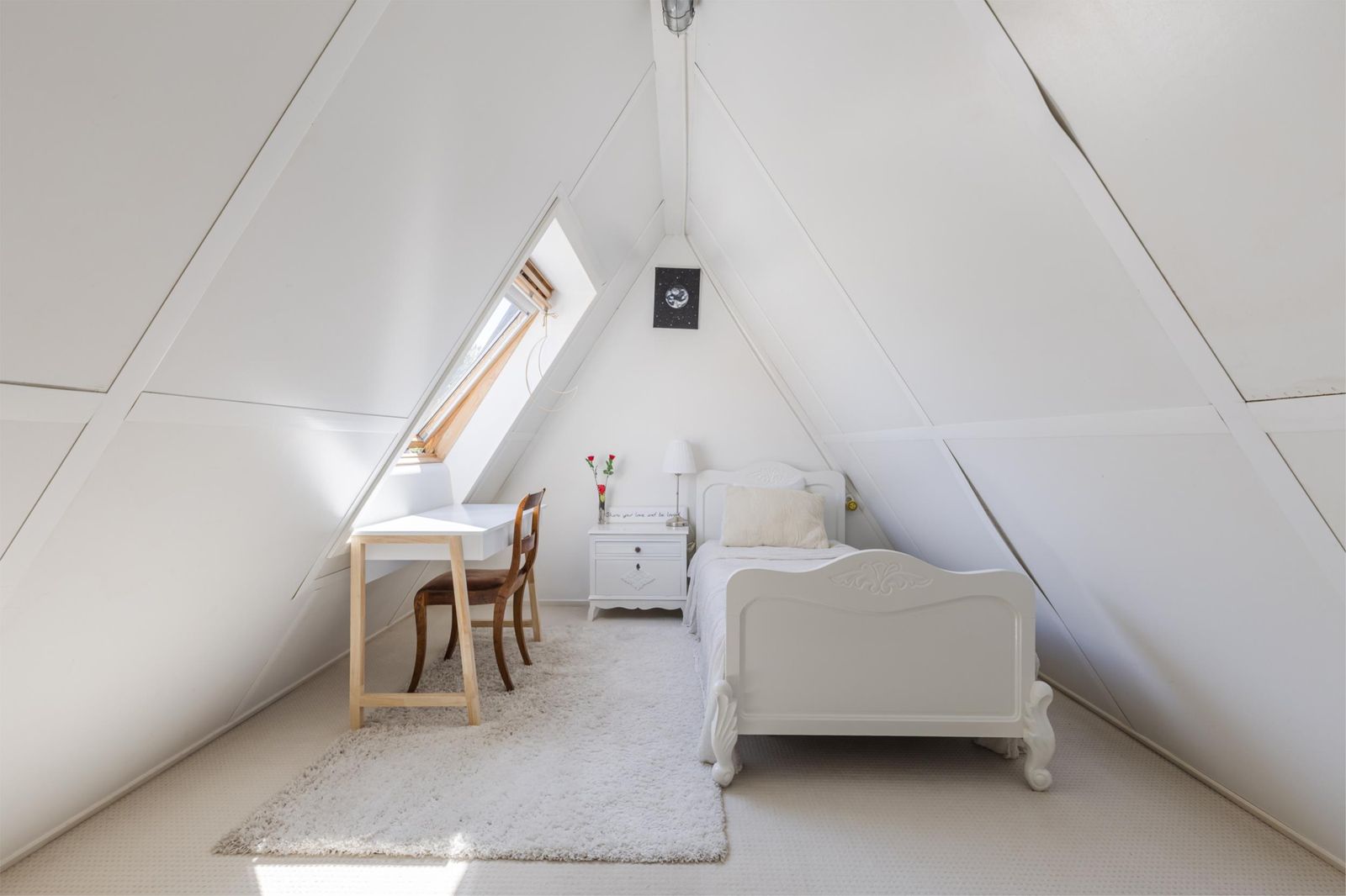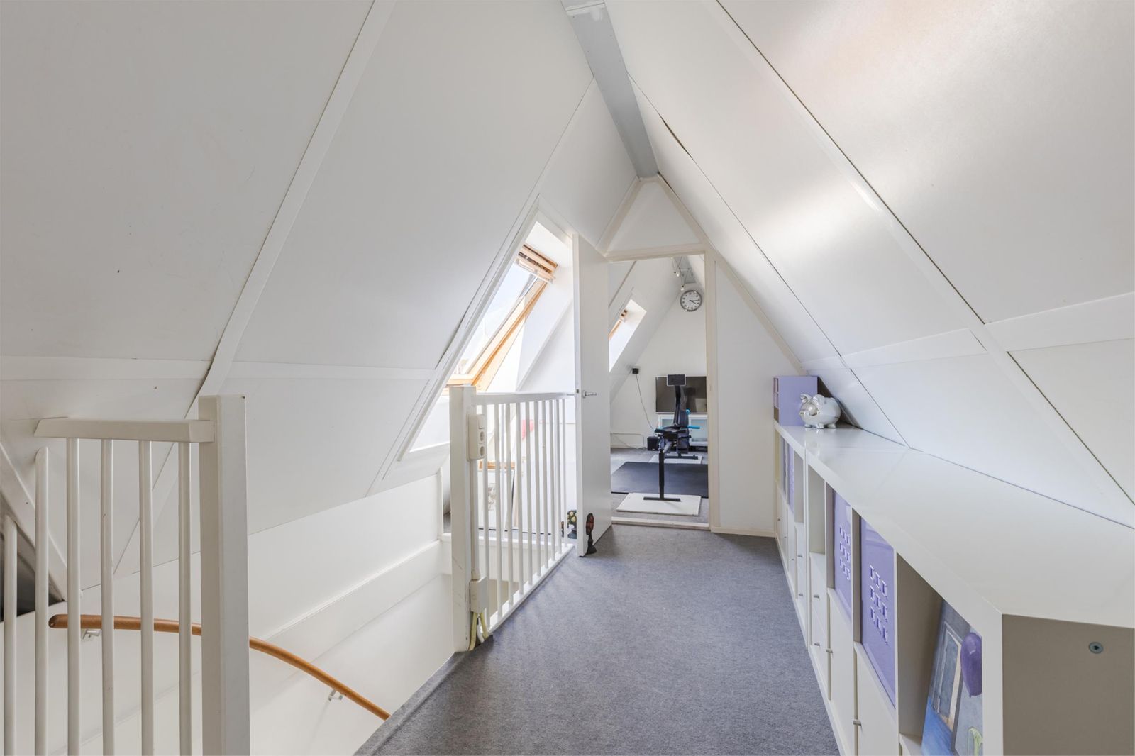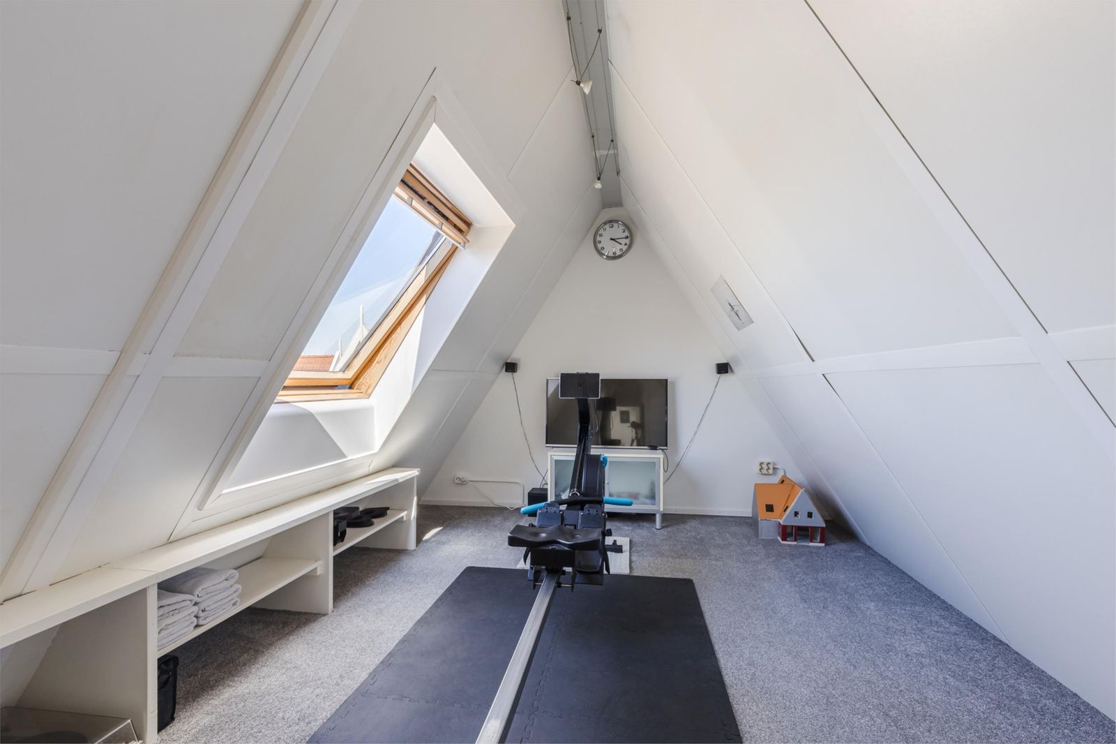Zolderverdieping: Via een open trap bereik je twee extra kamers onder het schuine dak – momenteel in gebruik als fitnessruimte en logeerkamer. Op de overloop een nis en lage kasten onder het schuine dak.