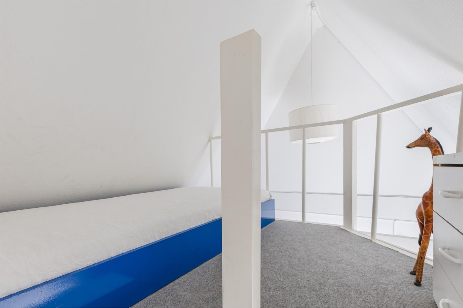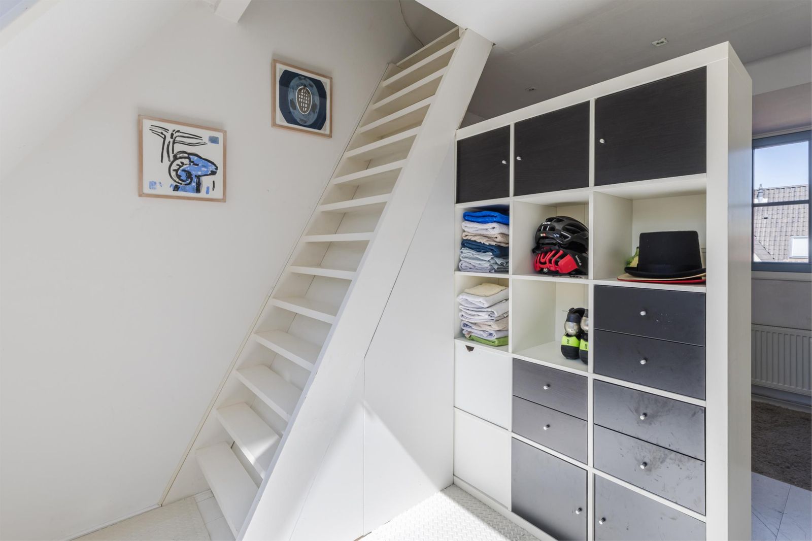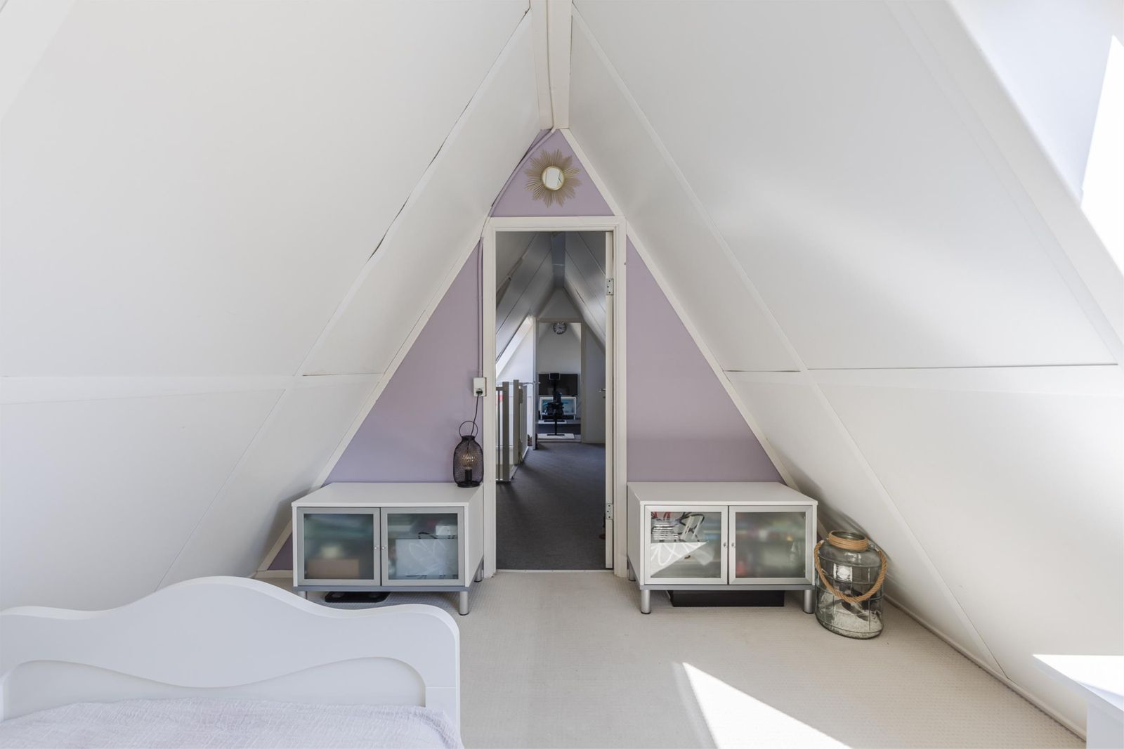 Zolderverdieping: Via een open trap bereik je twee extra kamers onder het schuine dak – momenteel in gebruik als fitnessruimte en logeerkamer. Op de overloop een nis en lage kasten onder het schuine dak.