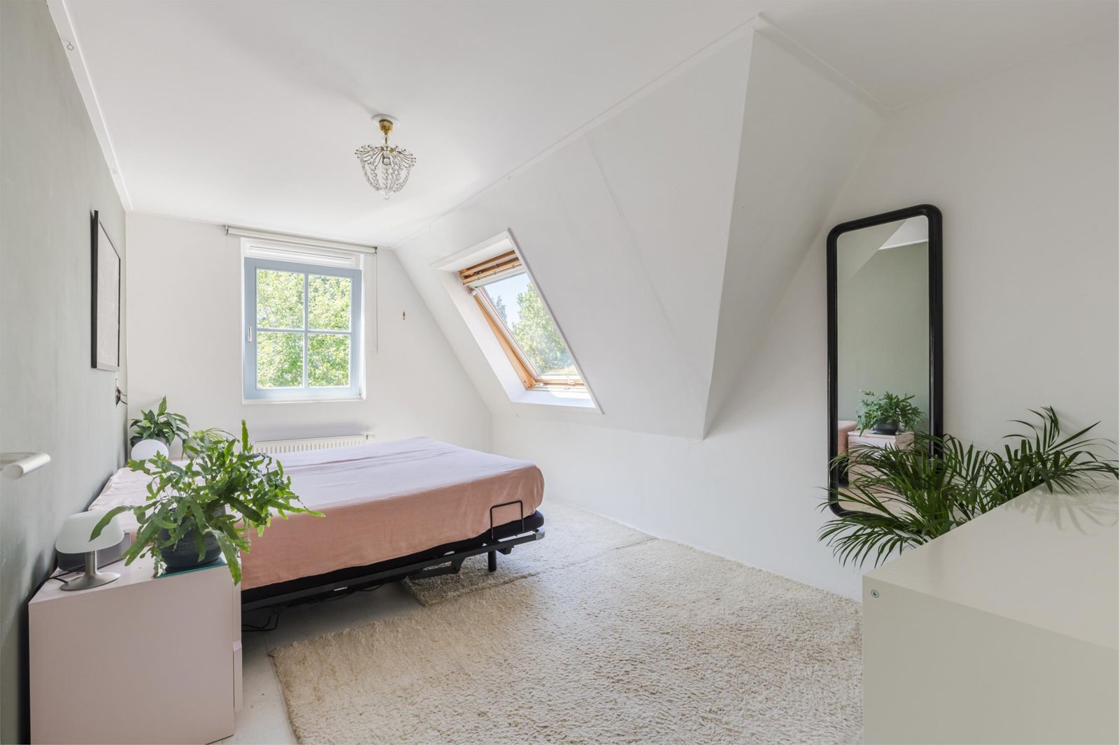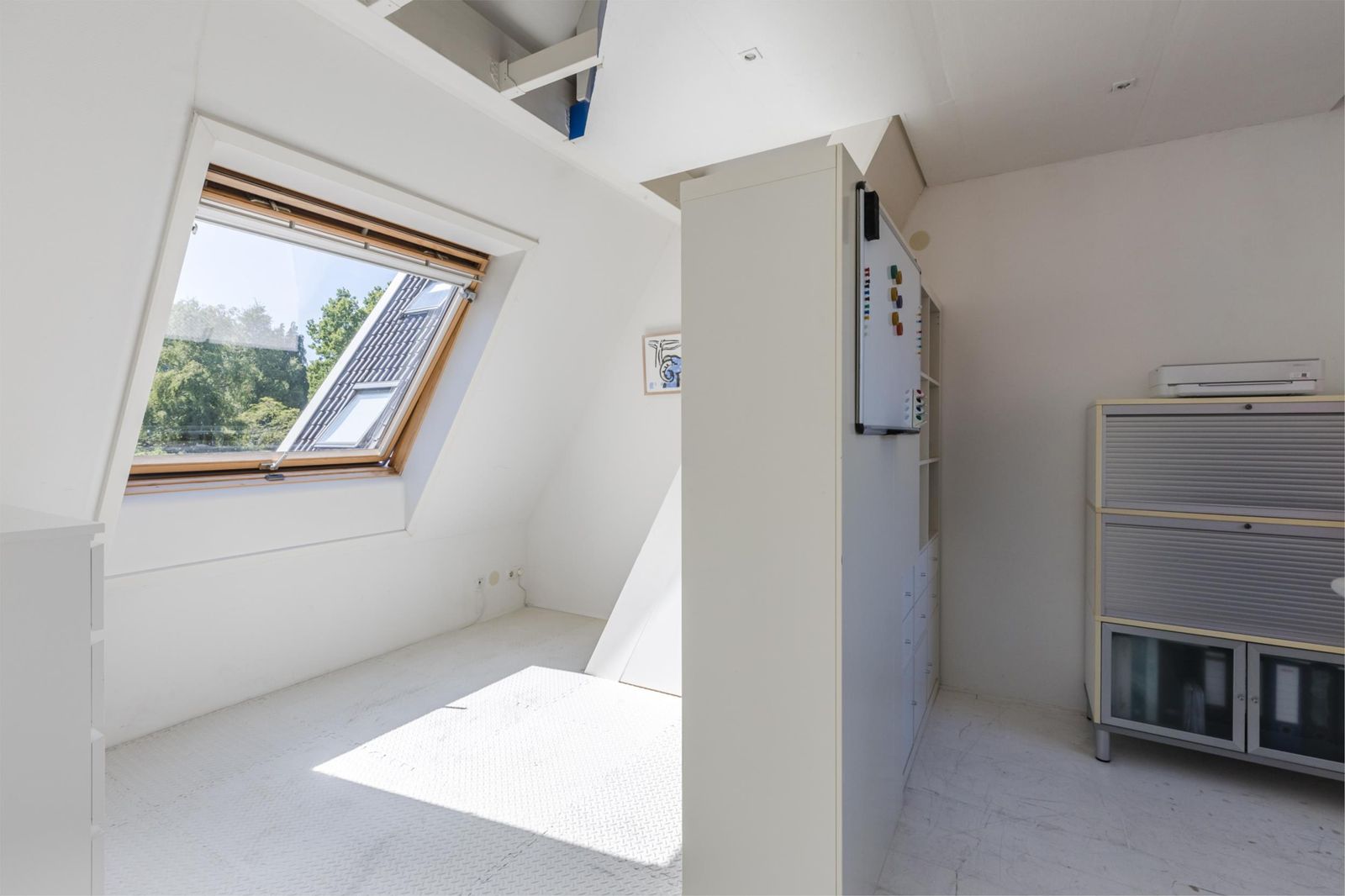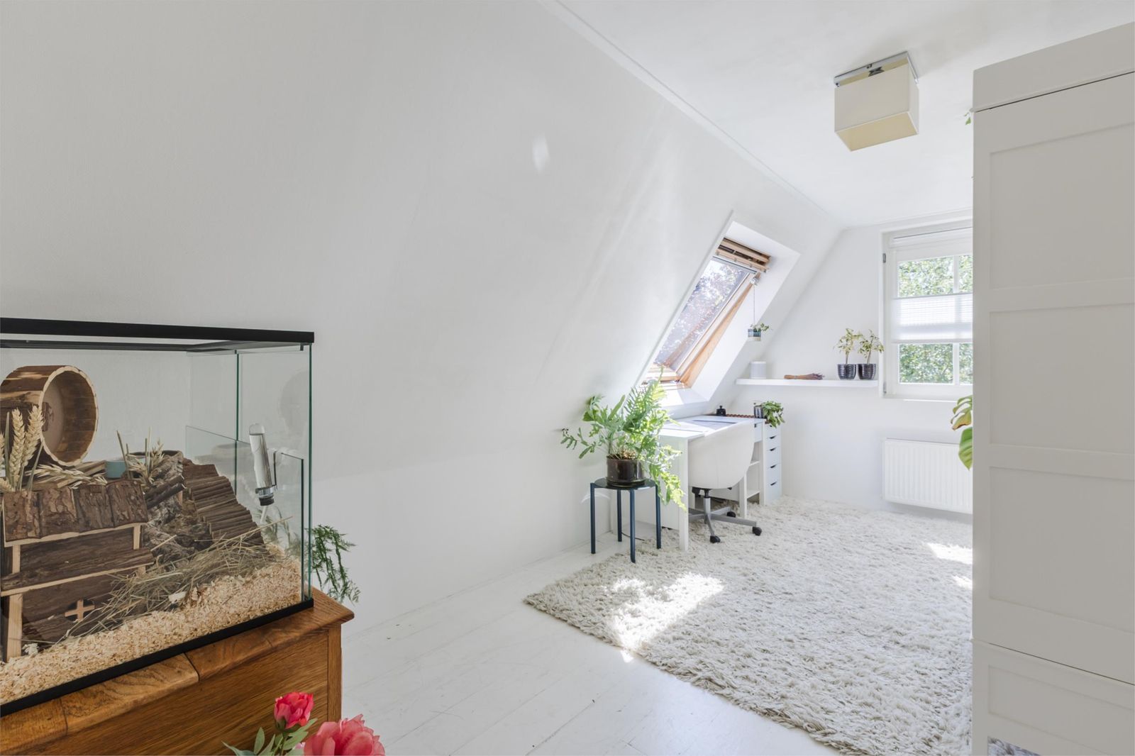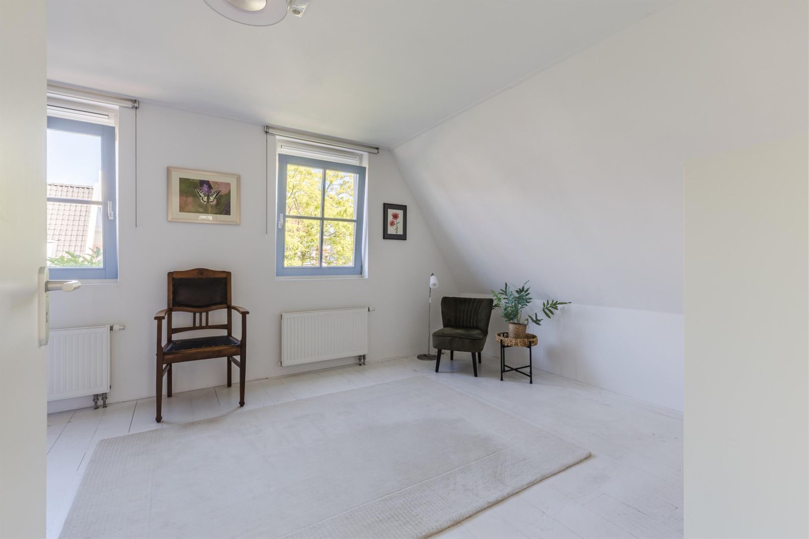 Zolderverdieping: Via een open trap bereik je twee extra kamers onder het schuine dak – momenteel in gebruik als fitnessruimte en logeerkamer. Op de overloop een nis en lage kasten onder het schuine dak.
