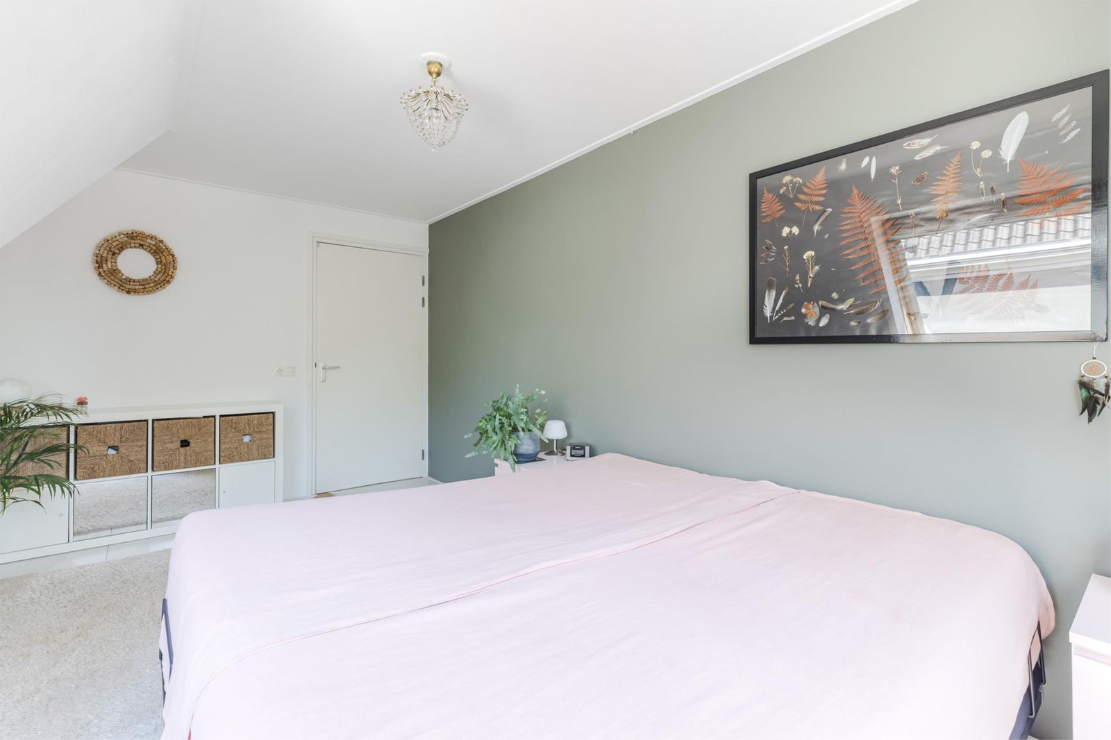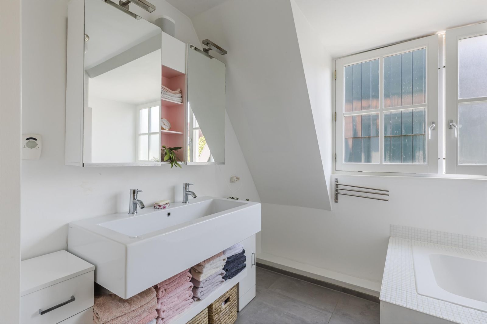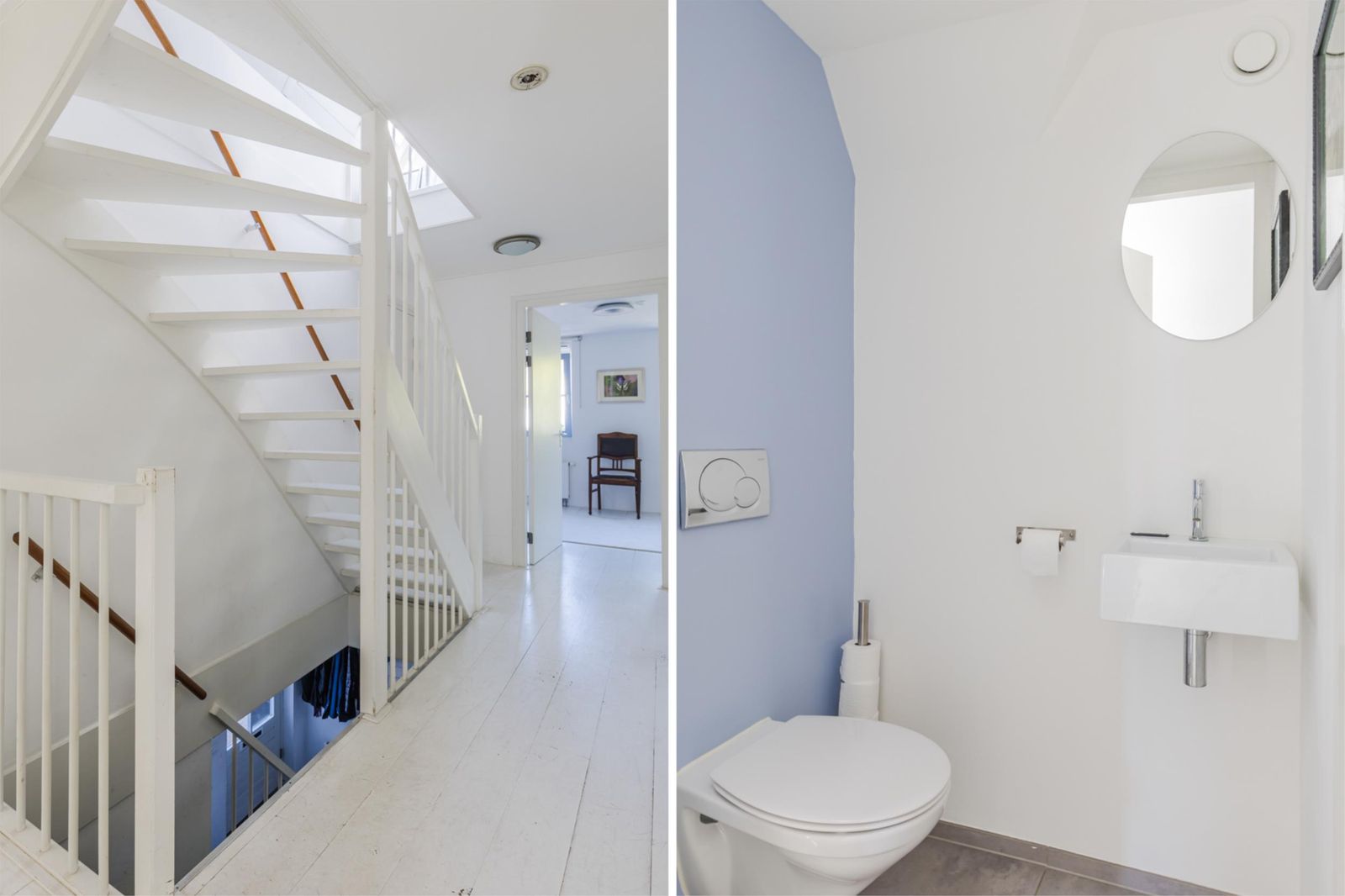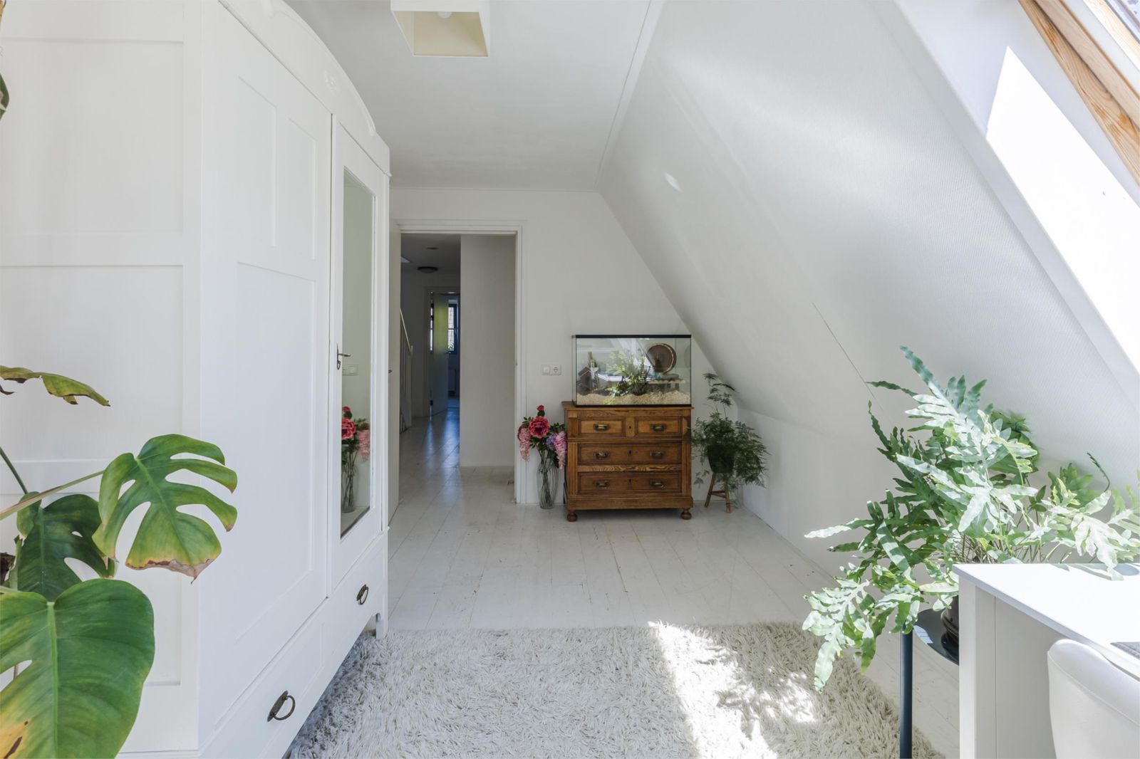 Eerste verdieping: Ruime overloop, vier slaapkamers/werkkamers, waaronder één met vide/hoogslaper. Badkamer met ligbad en aparte douche. Daarnaast een wasruimte en extra kast-/bergingsruimte. De hele verdieping heeft een wit gebeitste massief eikenvloer.