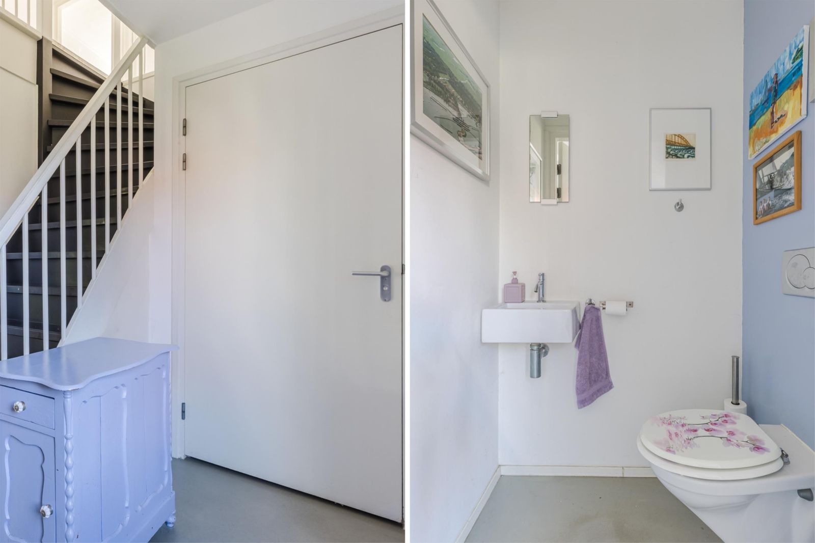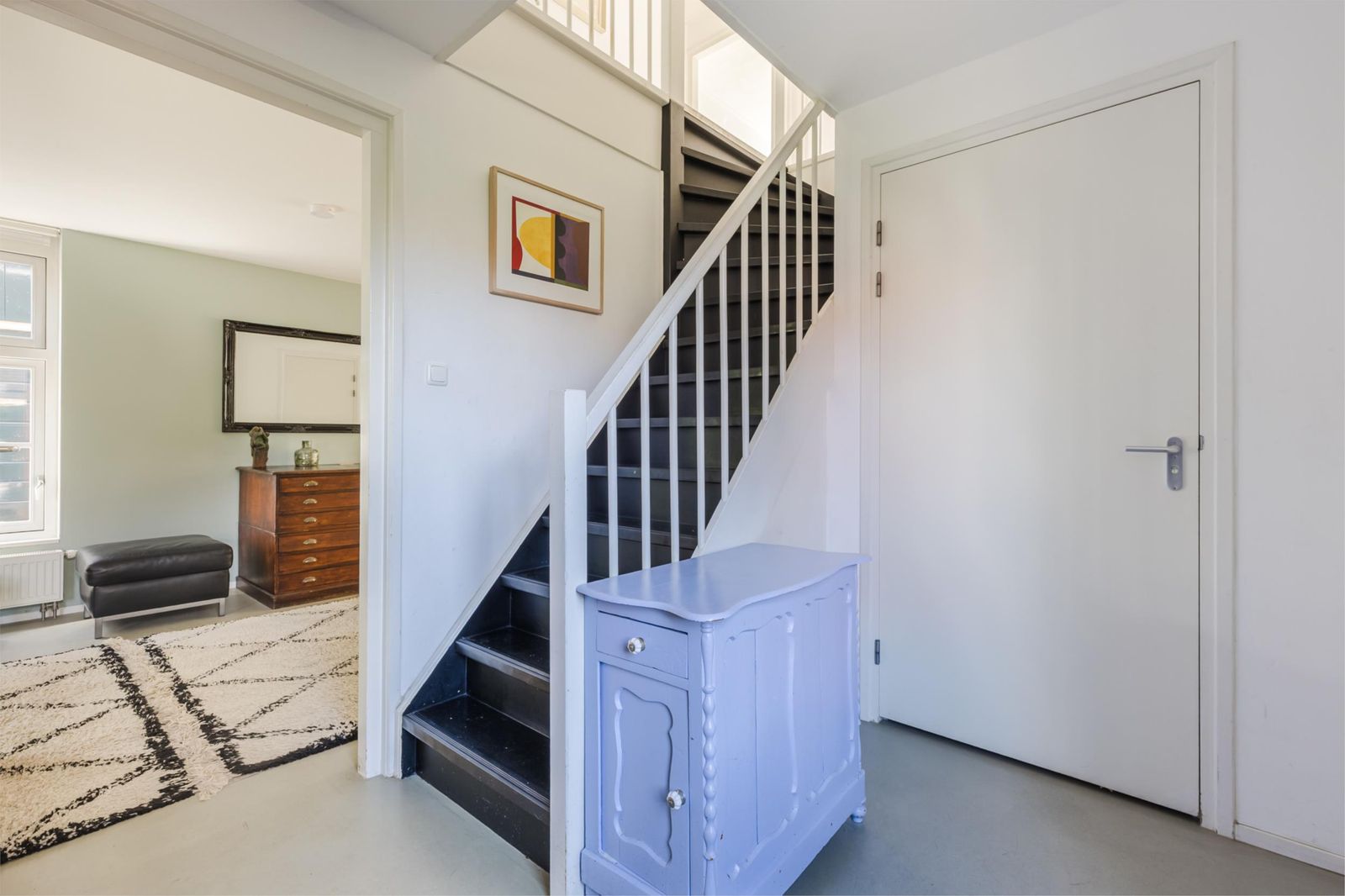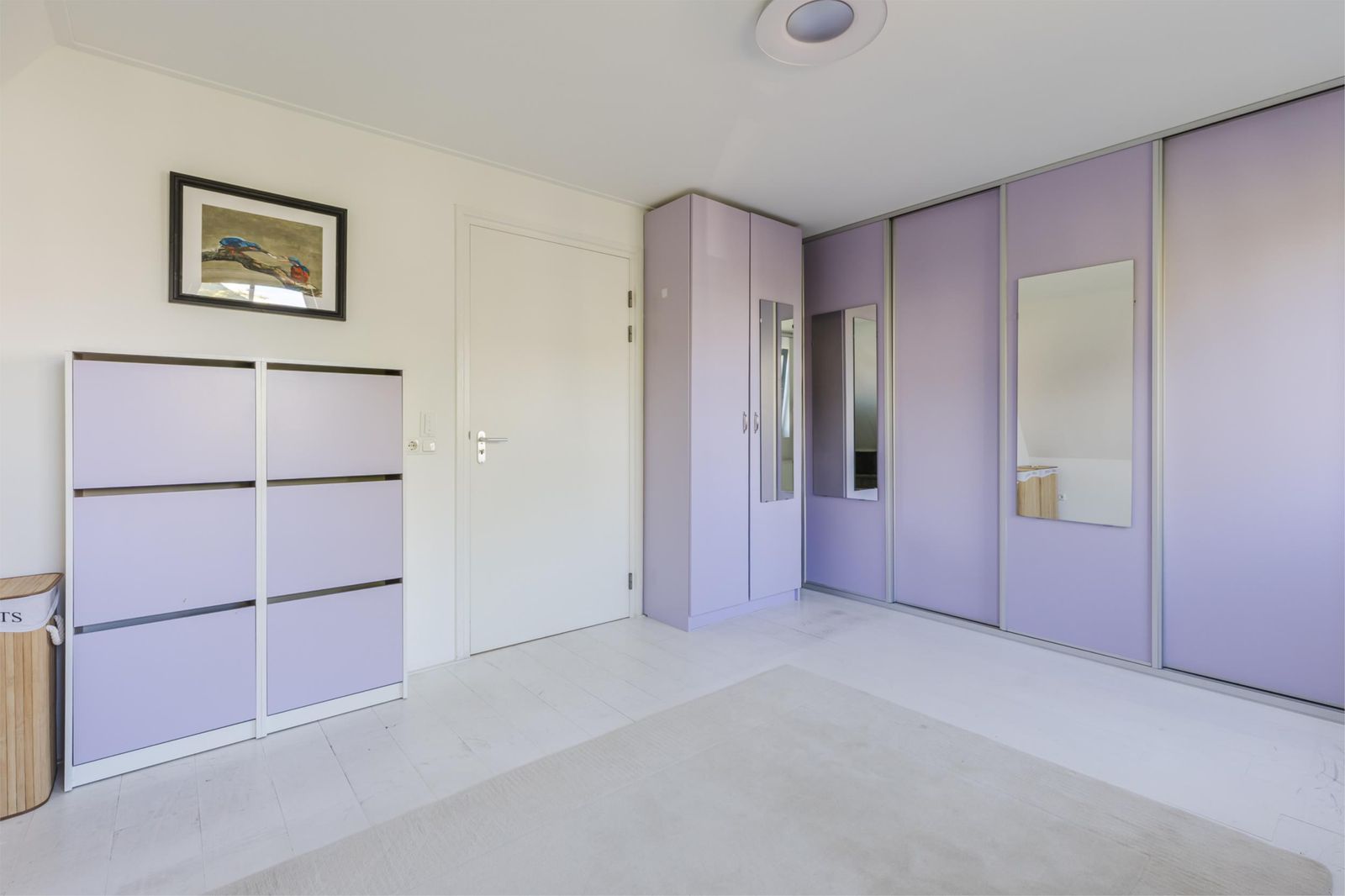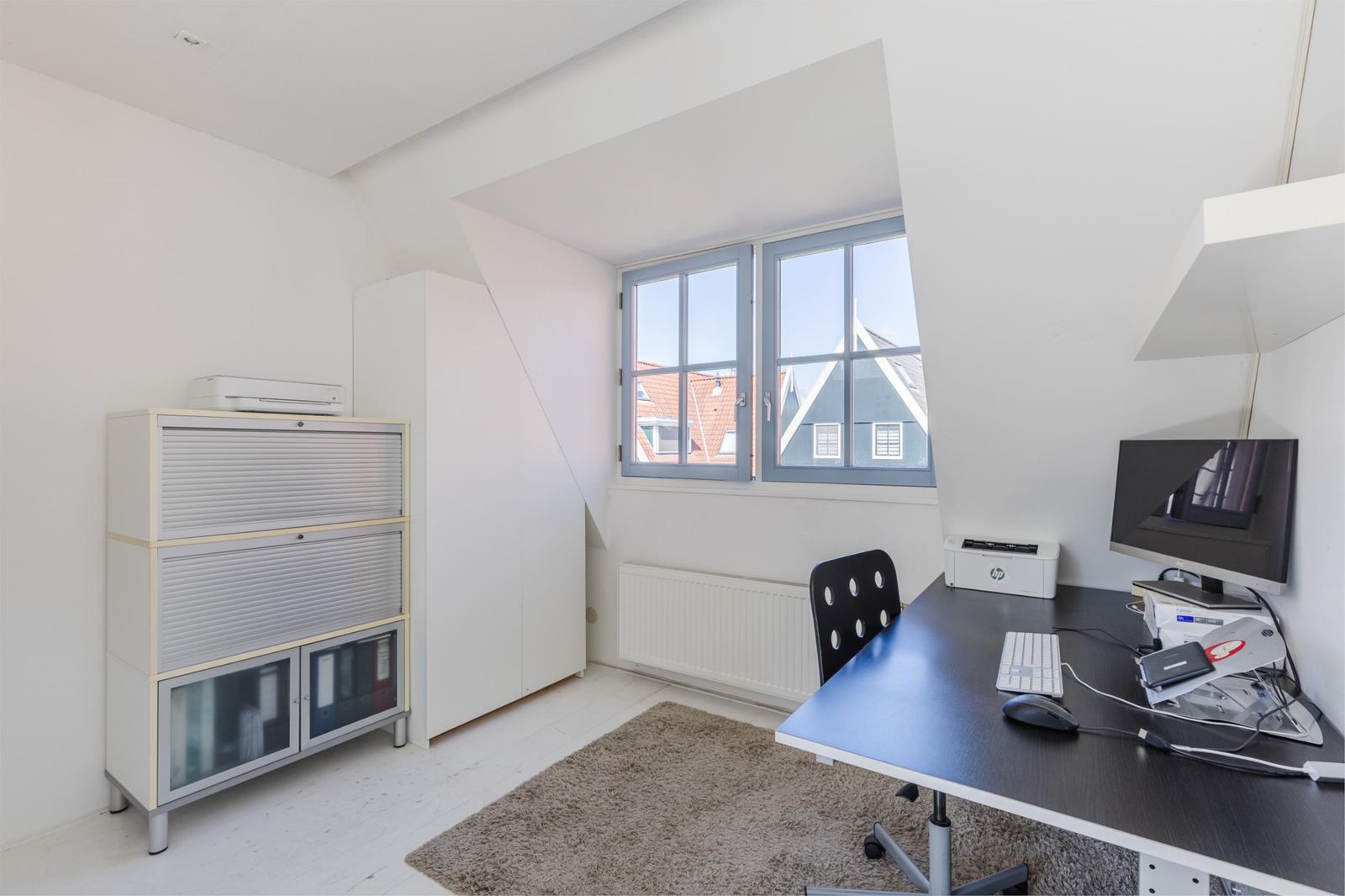 Eerste verdieping: Ruime overloop, vier slaapkamers/werkkamers, waaronder één met vide/hoogslaper. Badkamer met ligbad en aparte douche. Daarnaast een wasruimte en extra kast-/bergingsruimte. De hele verdieping heeft een wit gebeitste massief eikenvloer.
