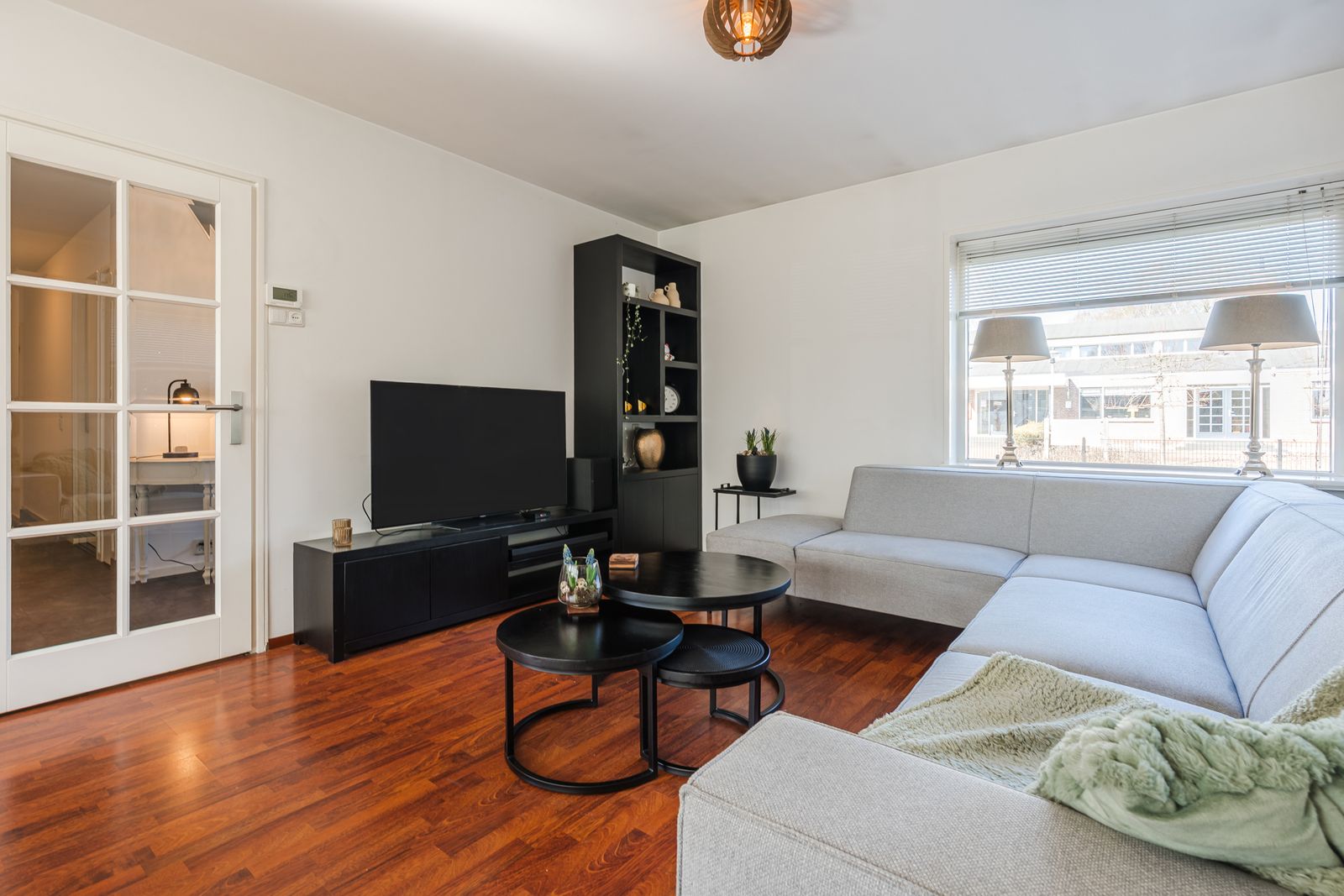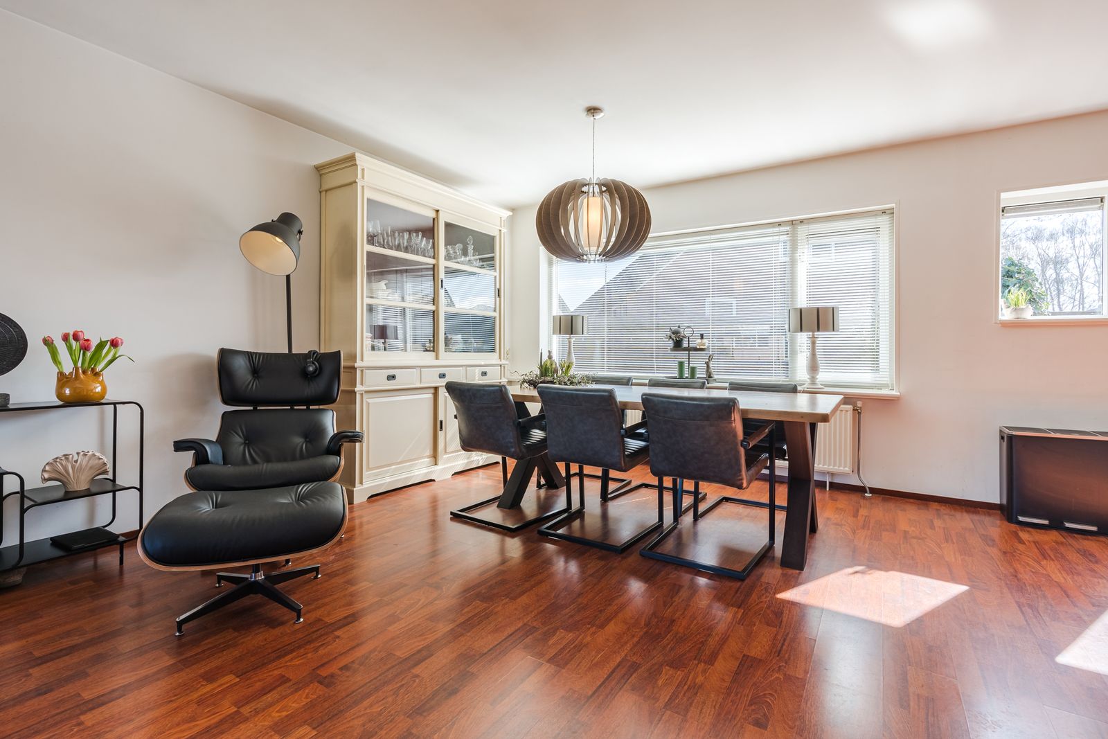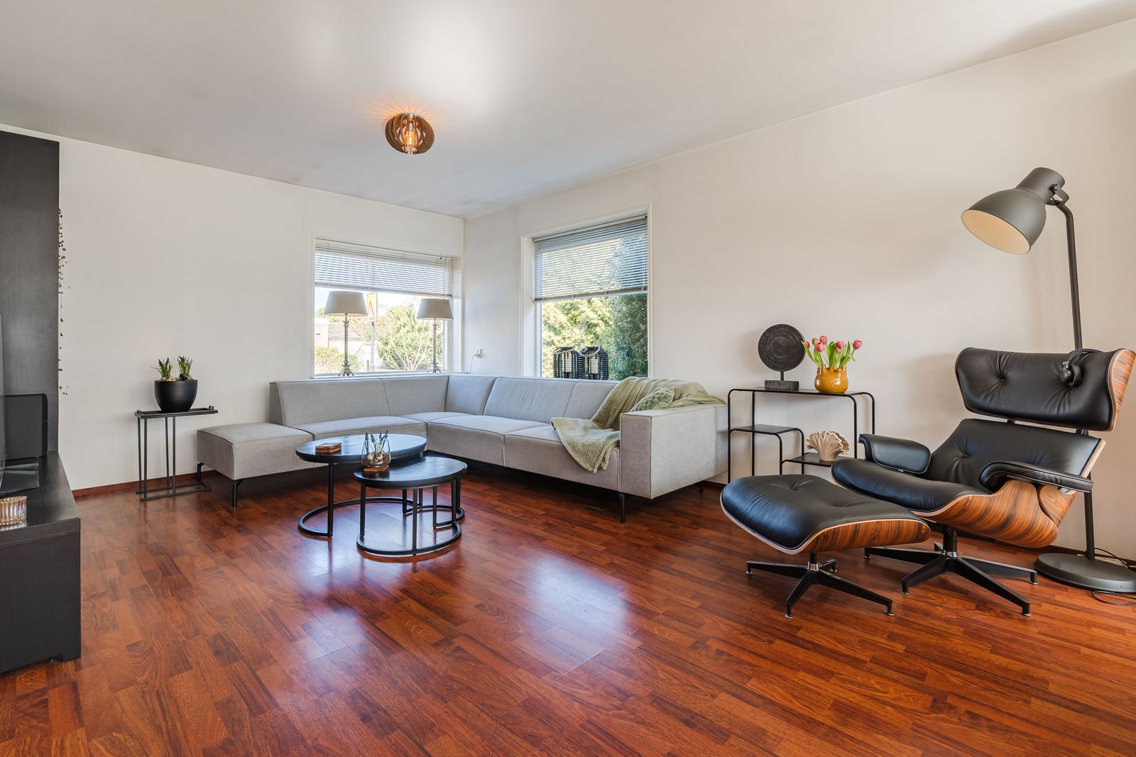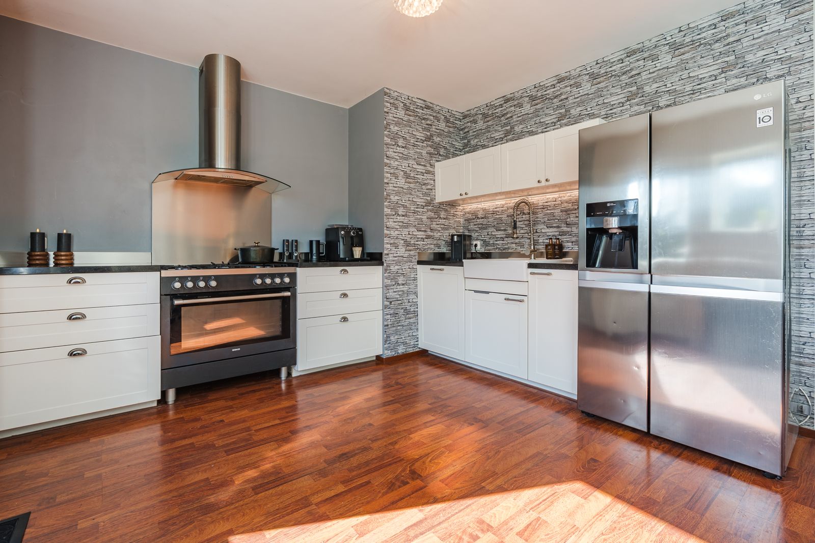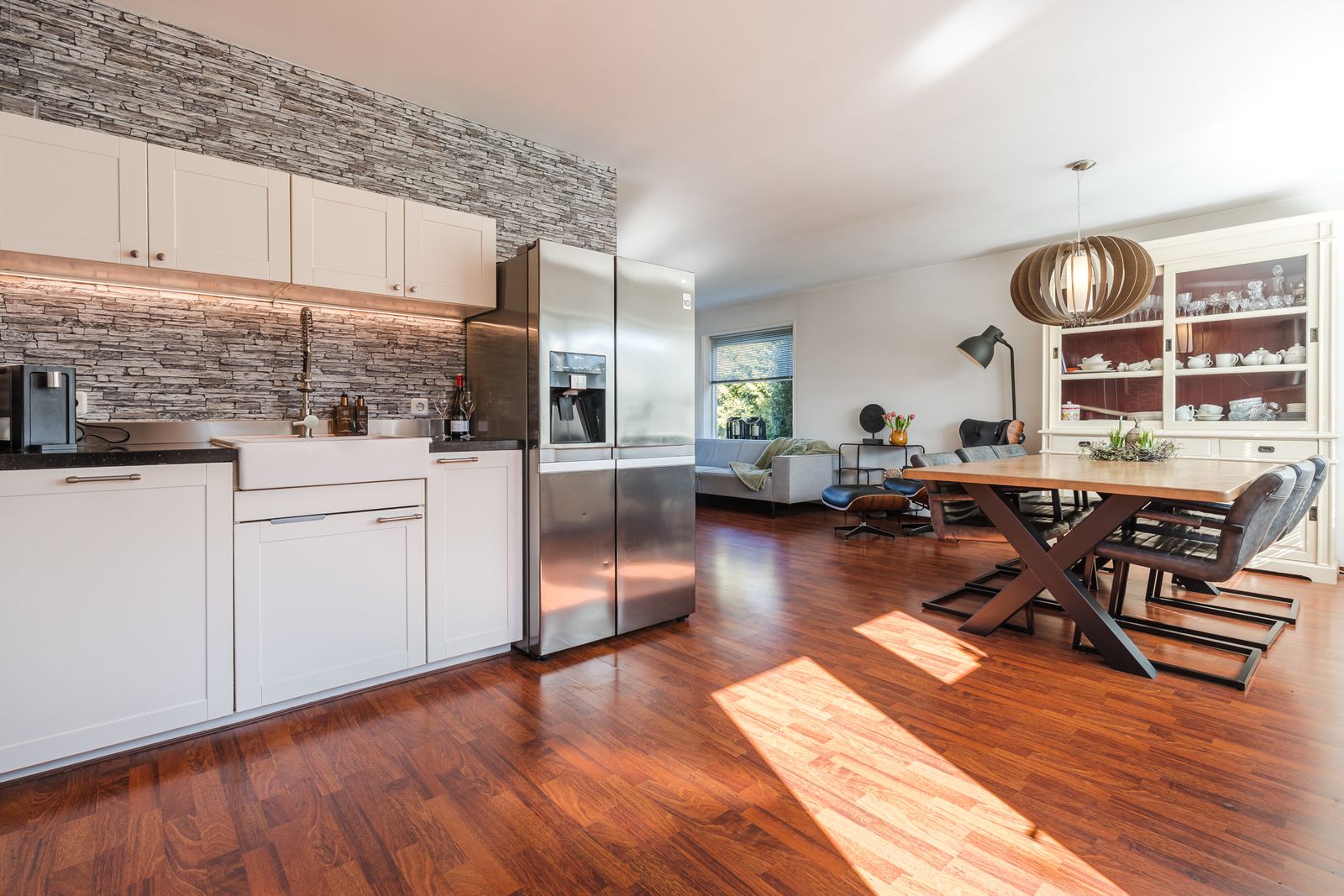 De lichte, L-vormige woonkamer is een fijne leefruimte met veel daglicht en een mooi uitzicht op de tuin. De keuken is opgesteld in een hoekopstelling en beschikt over een granieten werkblad, ruime spoelbak en diverse inbouwapparatuur. Vanuit de keuken heeft u direct toegang tot de tuin.