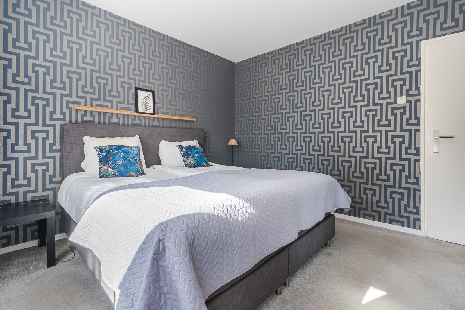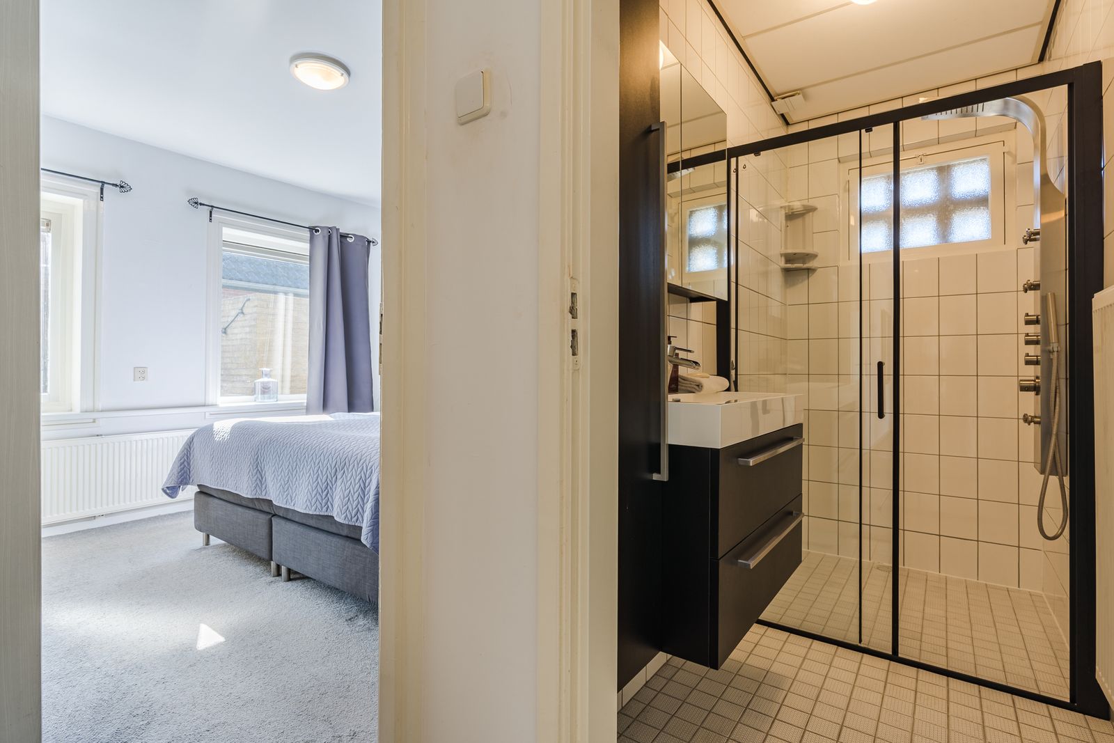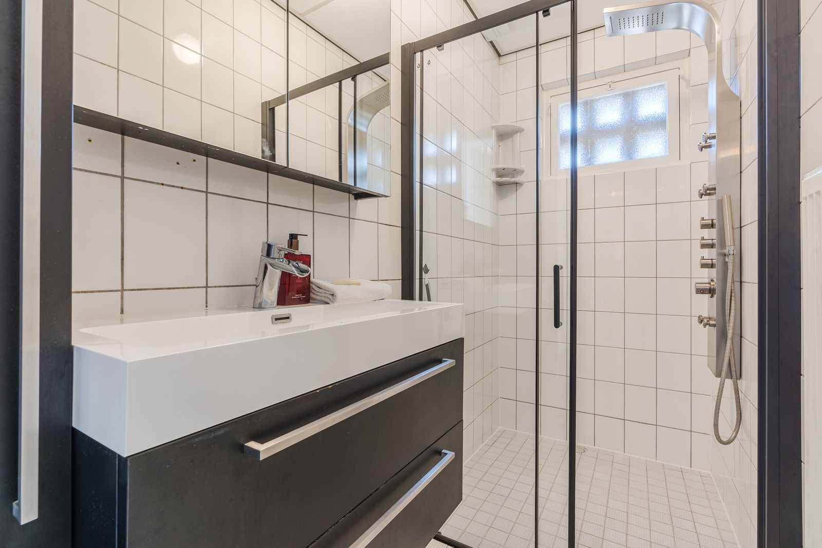 De badkamer is modern uitgevoerd en voorzien van een wastafelmeubel, kolomdouche, afzuiging en een schuifdeur.