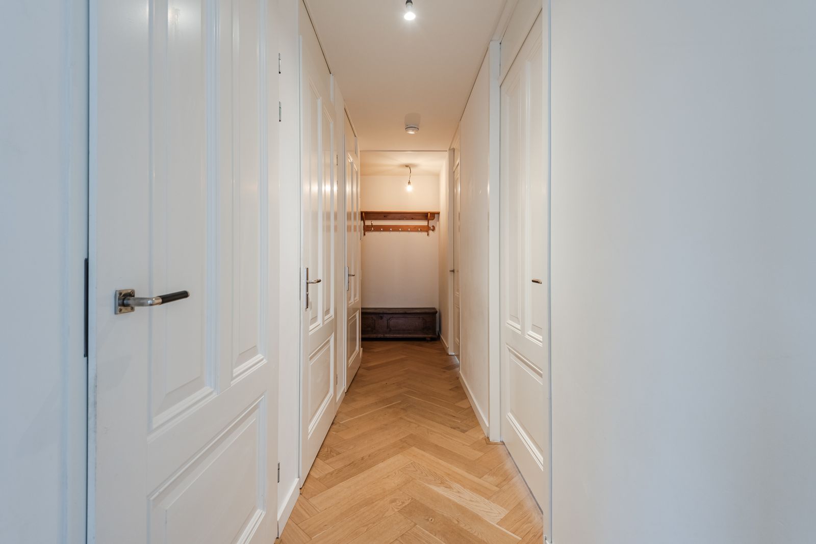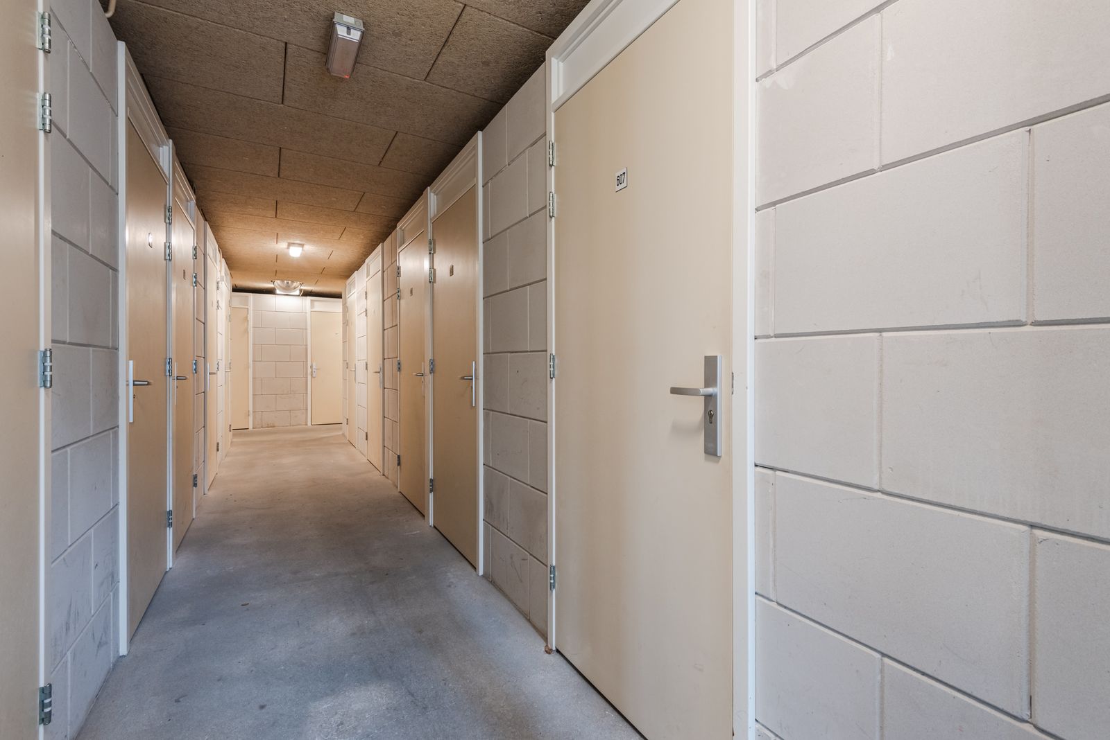 Naast de centrale voordeur is het bellentableau met intercom en brievenbussen aanwezig. De gemeenschappelijke entree geeft toegang tot de lift, n de parkeerkelder waar de eigen berging en parkeerplaats is gelegen. Lopend langs de centrale entree bereik je de voordeur van de Beneluxlaan 607.