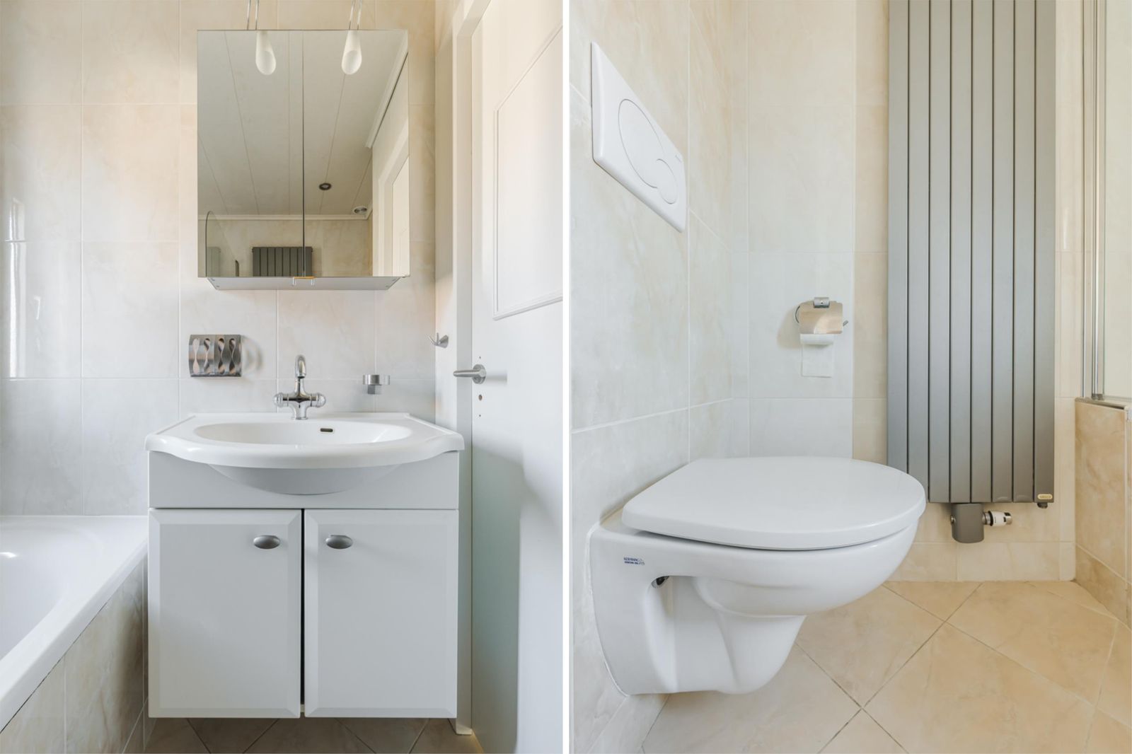 Via de hal bereik je de woonkamer en de keuken. Vanuit de woonkamer is er toegang tot de kelder, waar aansluitingen voor wasmachine en droger aanwezig zijn. Alsook ruimte voor een extra koelkast en/of vriezer.
