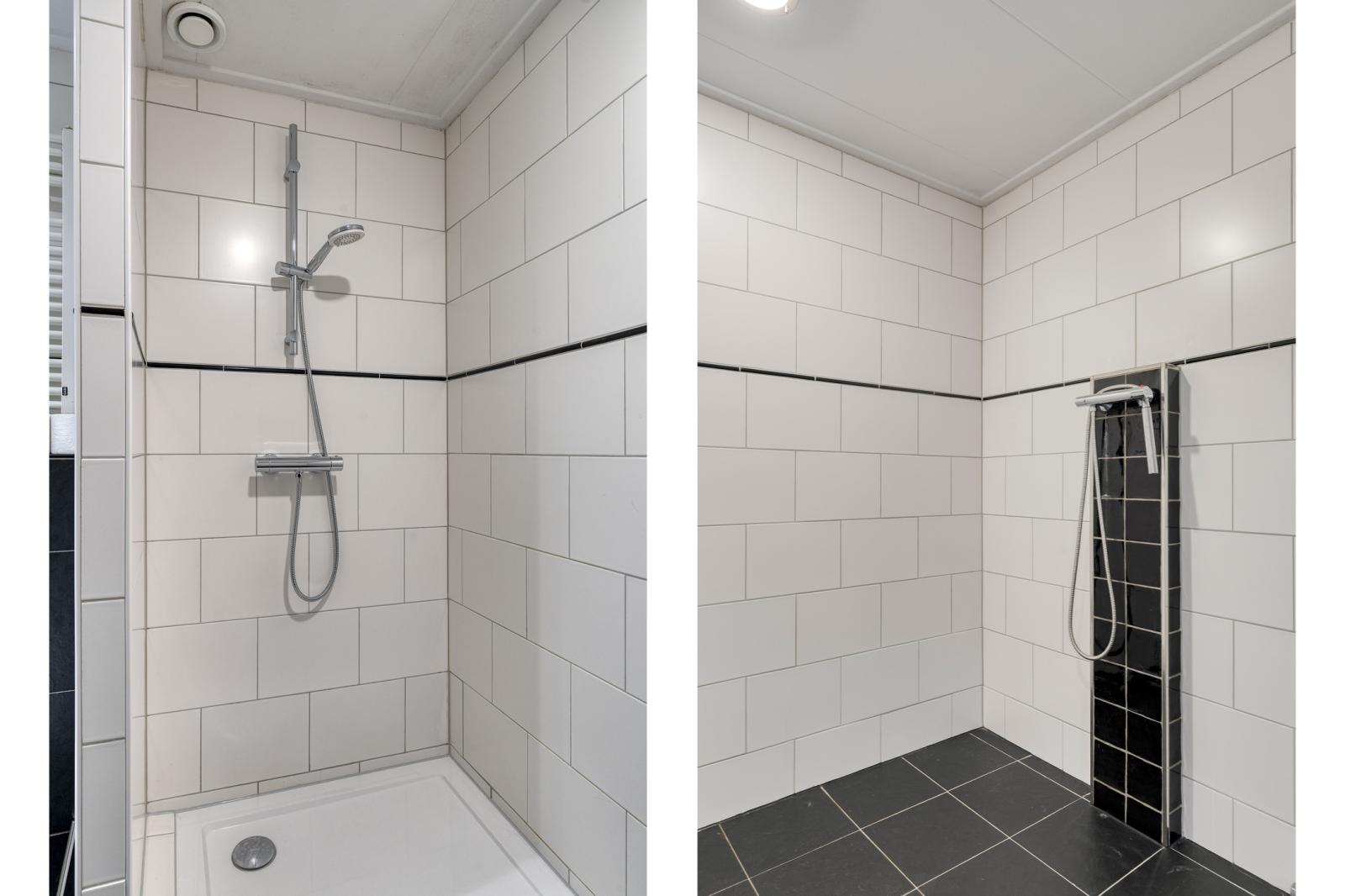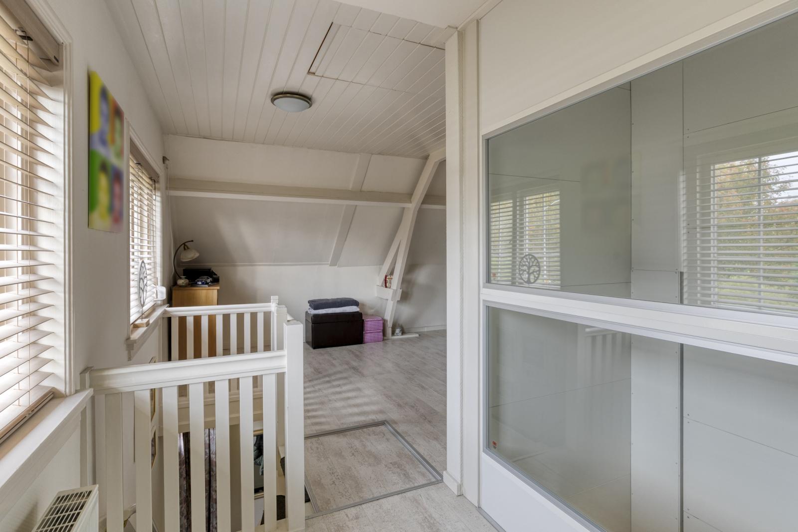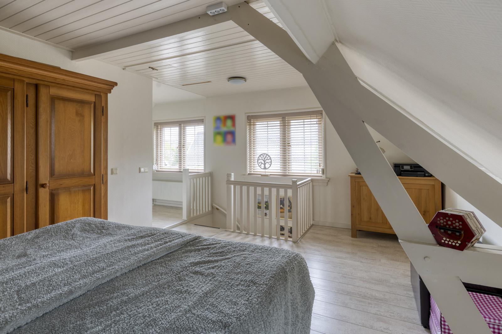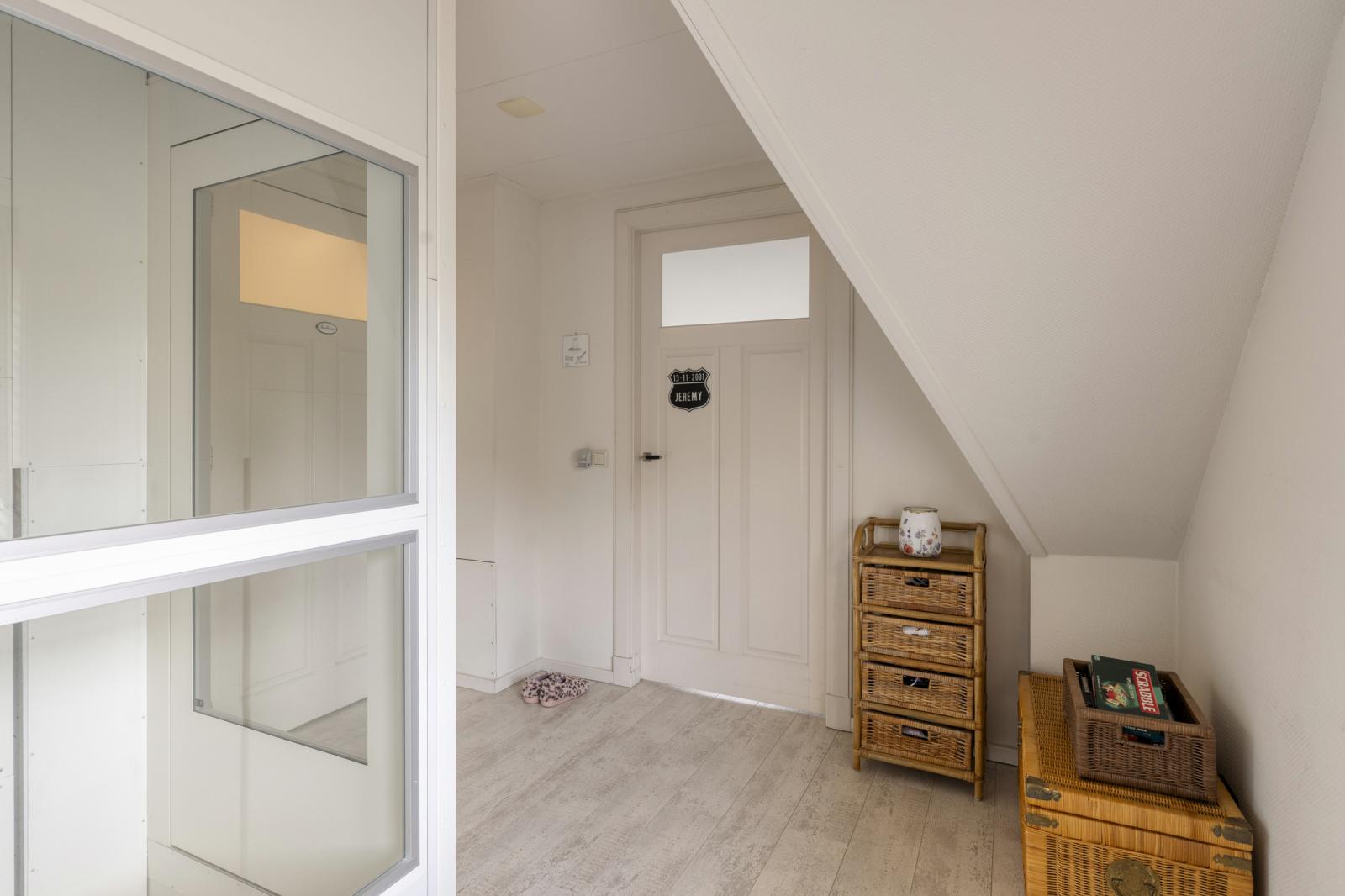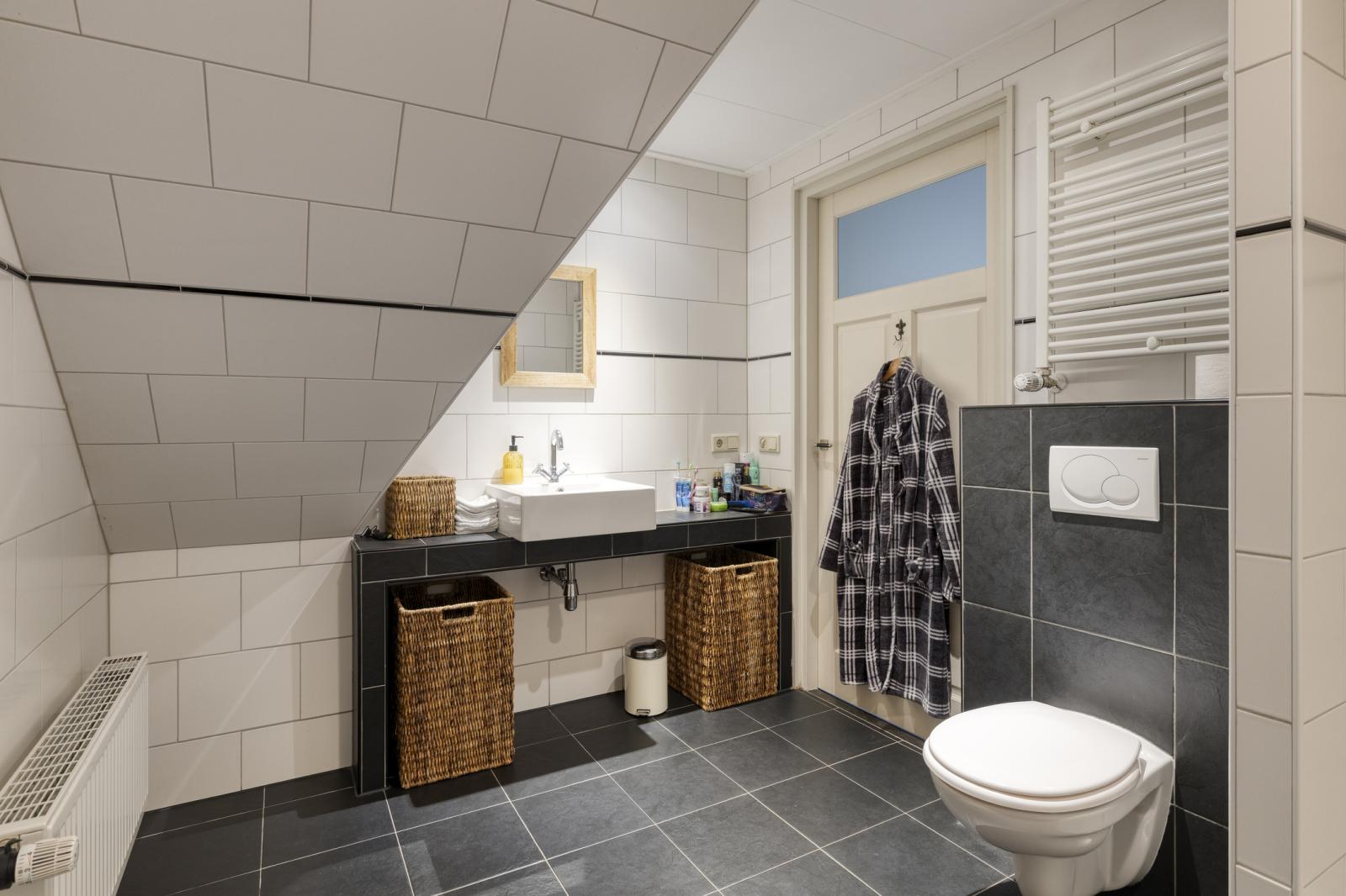 Overloop, 2 ruime slaapkamers en de badkamer voorzien van inloopdouche, toilet en wastafelmeubel.
