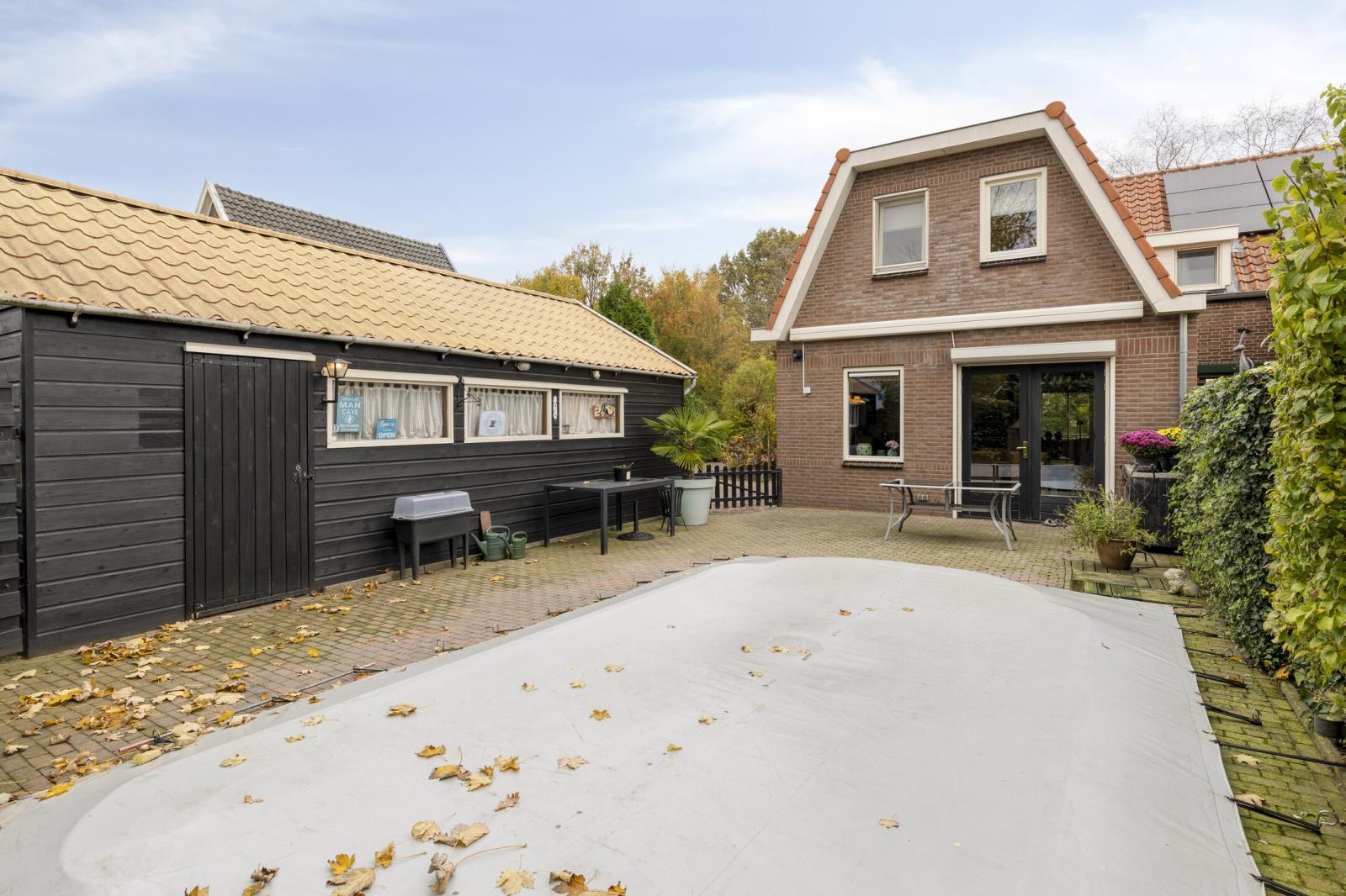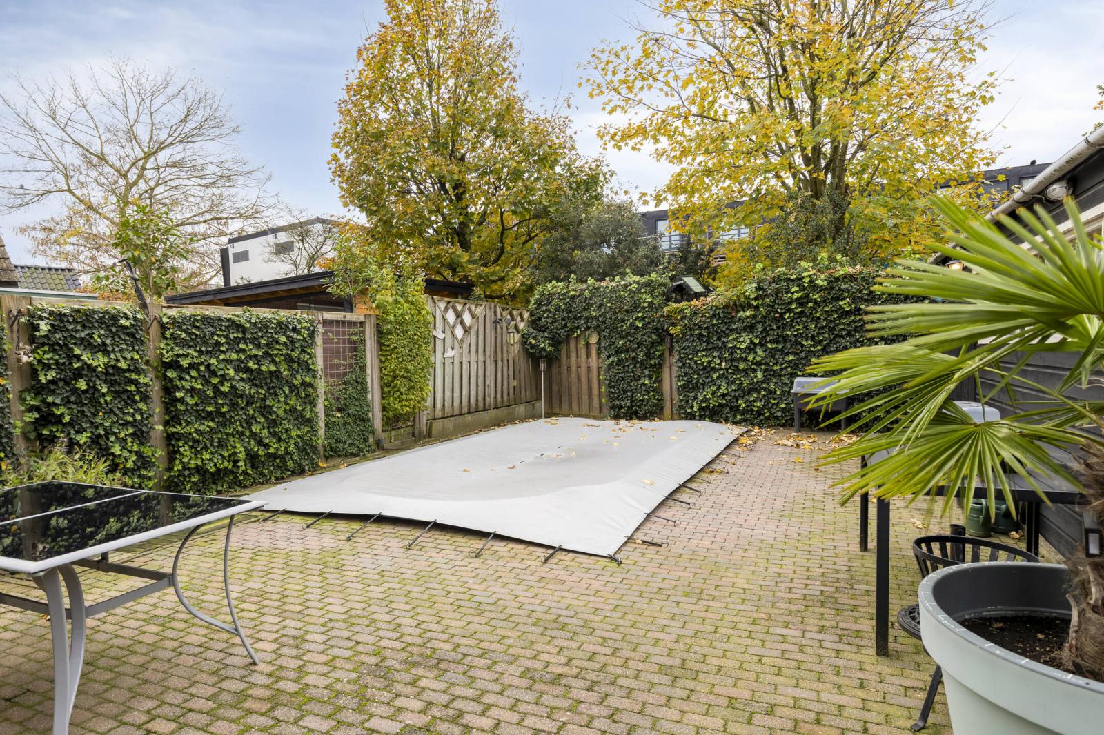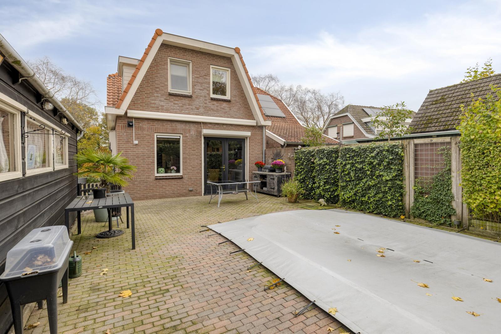 De achtertuin is met zorg aangelegd en biedt volop privacy. Hier bevindt zich een verwarmd zwembad dankzij een warmtepomp. Daarnaast is er een grote, volledig afgetimmerde garage, ideaal voor het stallen van een auto, fietsen of als hobbyruimte.