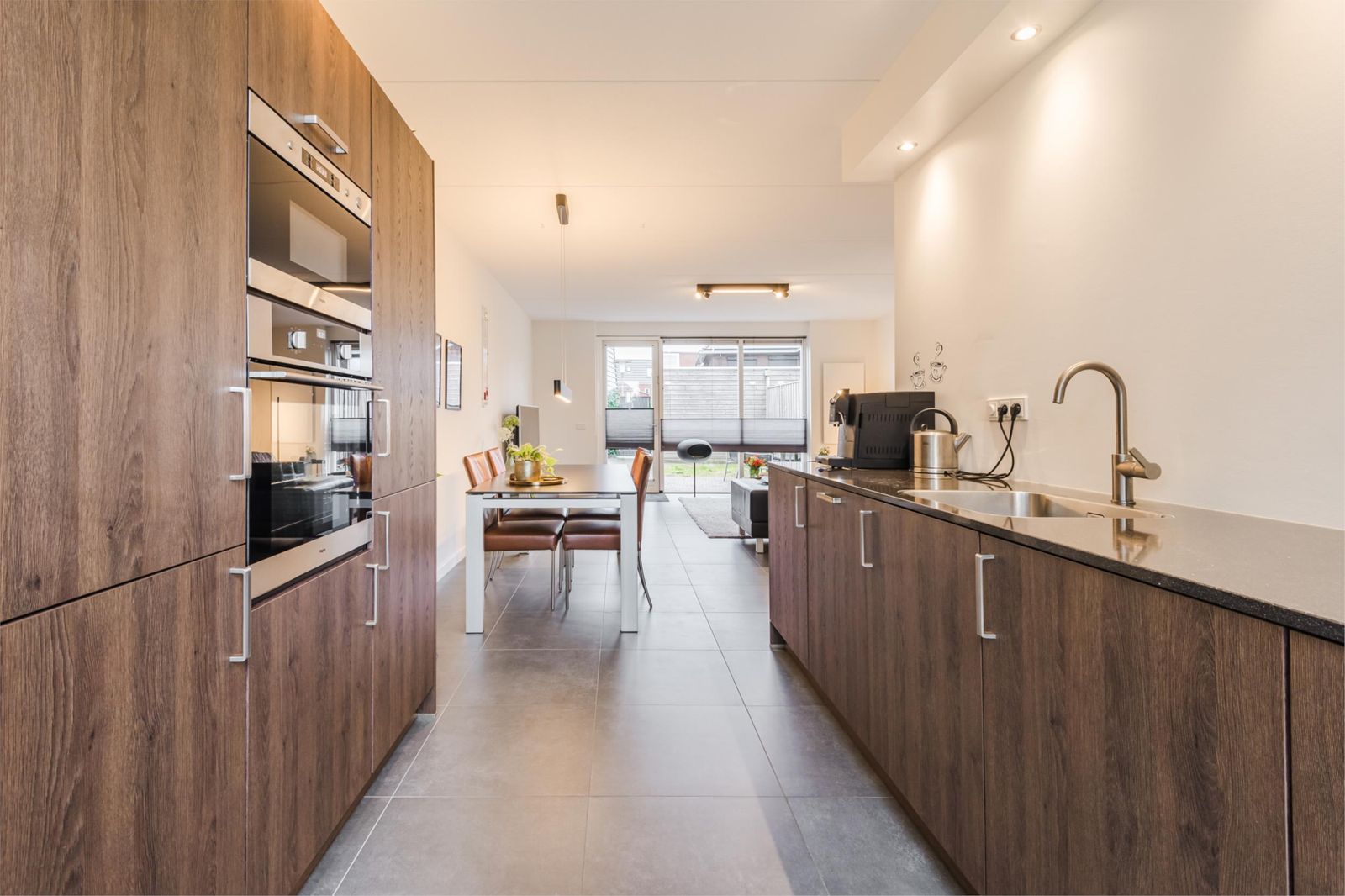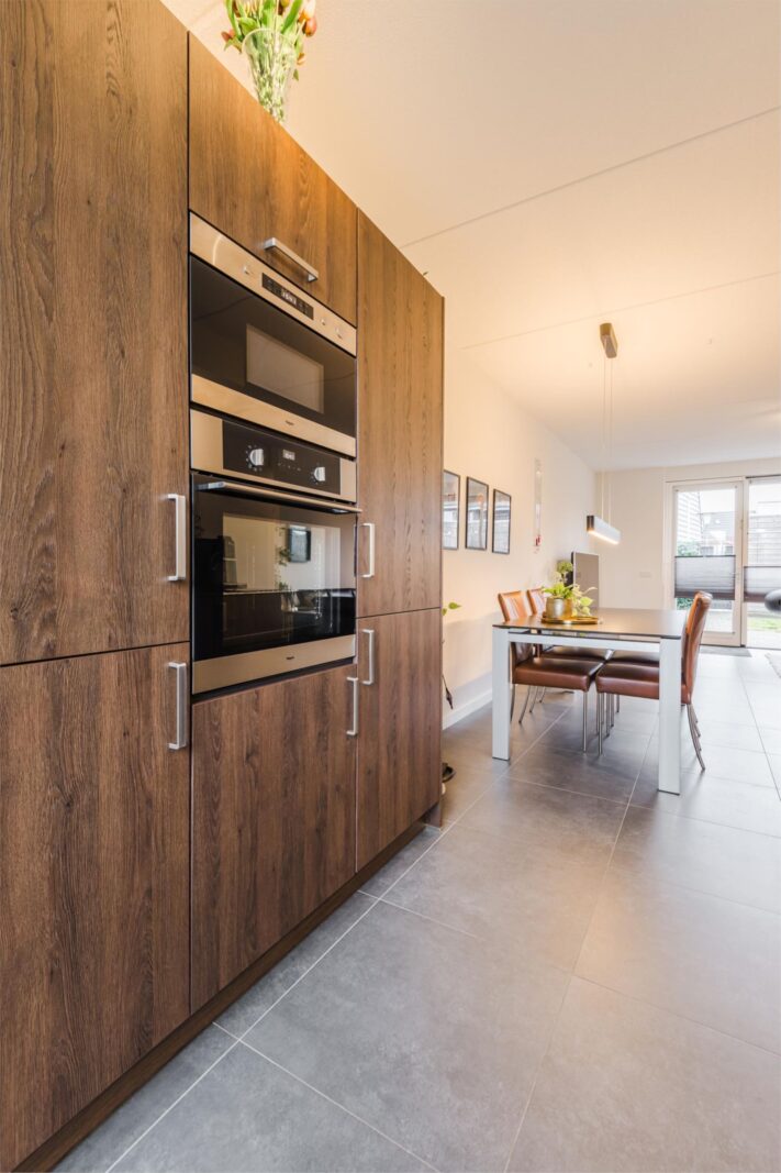 De keuken bevindt zich aan de voorzijde van de woning. Het is een open keuken met aan de ene zijde het aanrecht met een zwart composiet werkblad dat heel mooi combineert met de warme houten kastdeuren. Hier heeft u veel werkruimte, een inductiekookplaat, afzuigkap, vaatwasser en spoelbak en aan de andere kant een hoge kastenwand met daarin de koel- vrieskast, oven en magnetron. De ramen zijn voorzien van zonwering door een knik-armscherm en screen.
