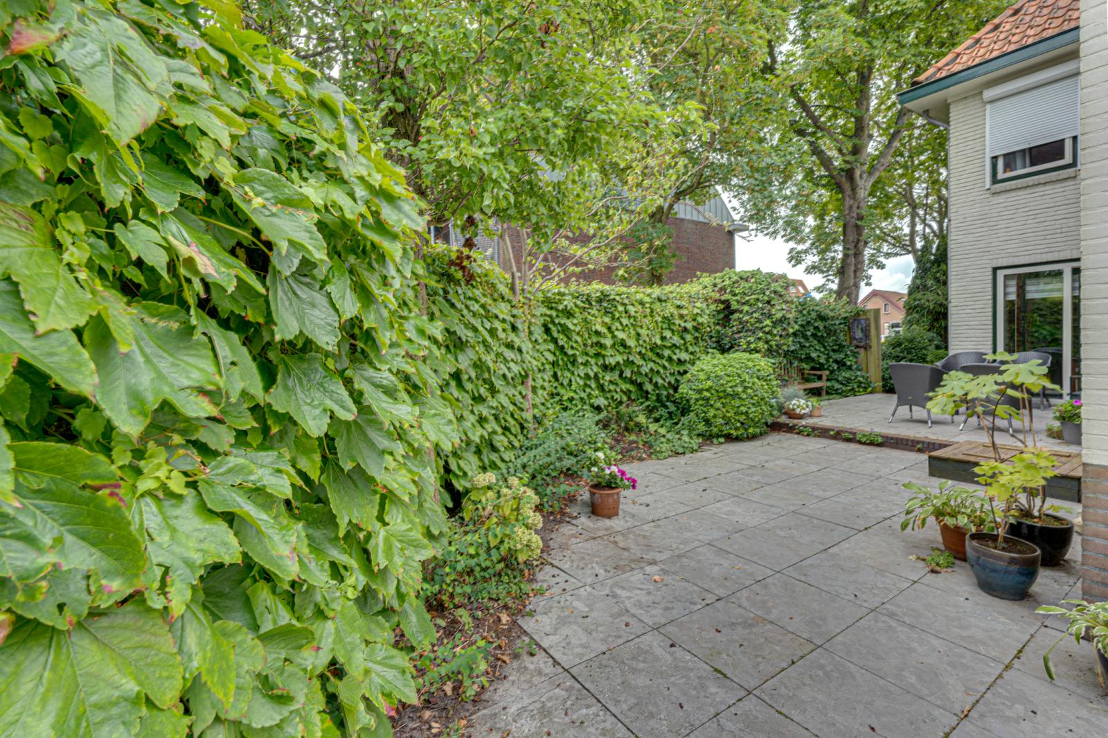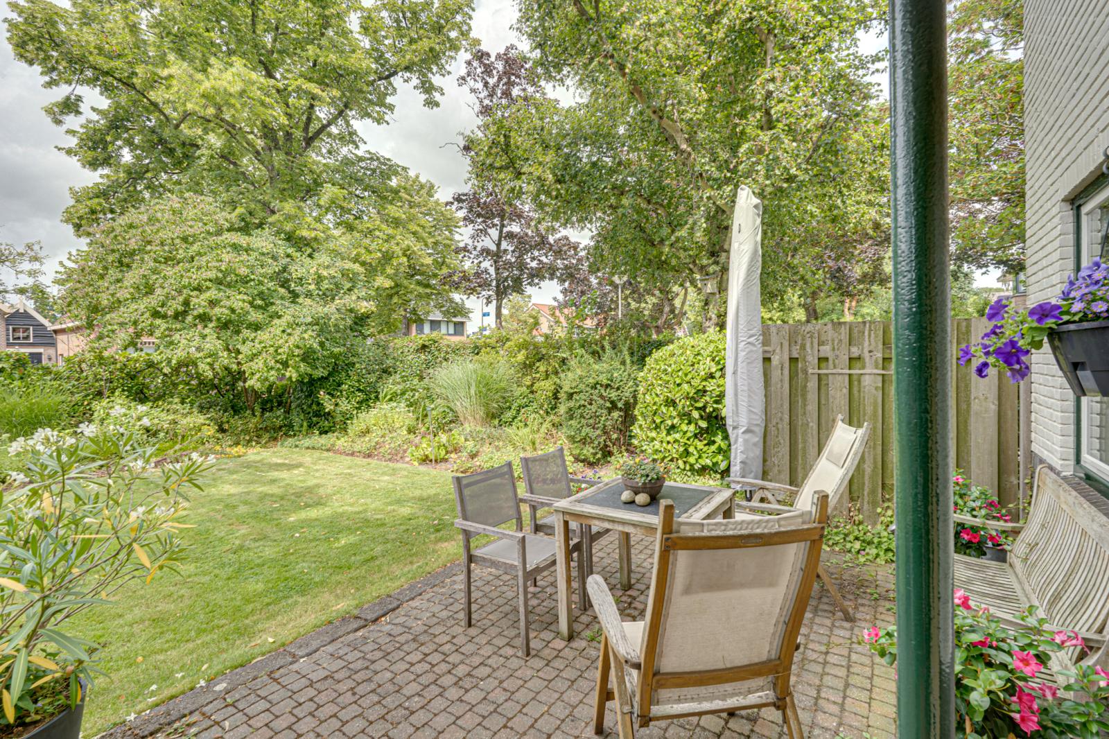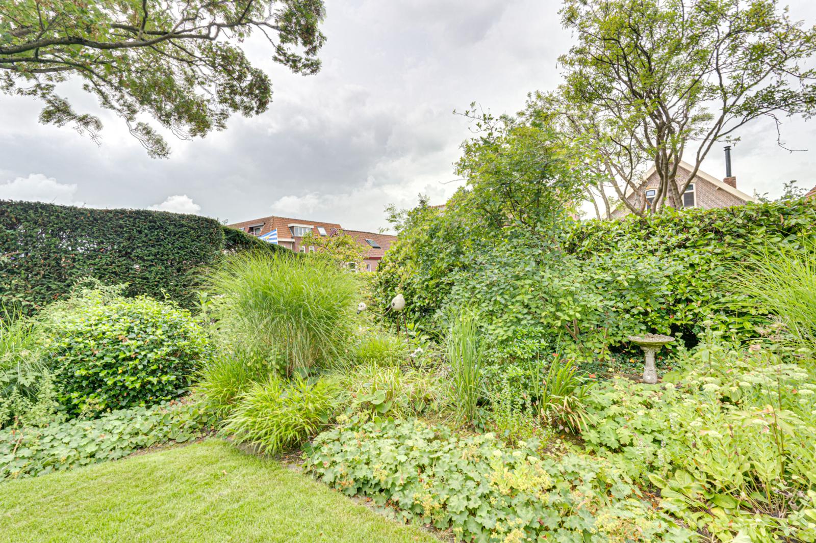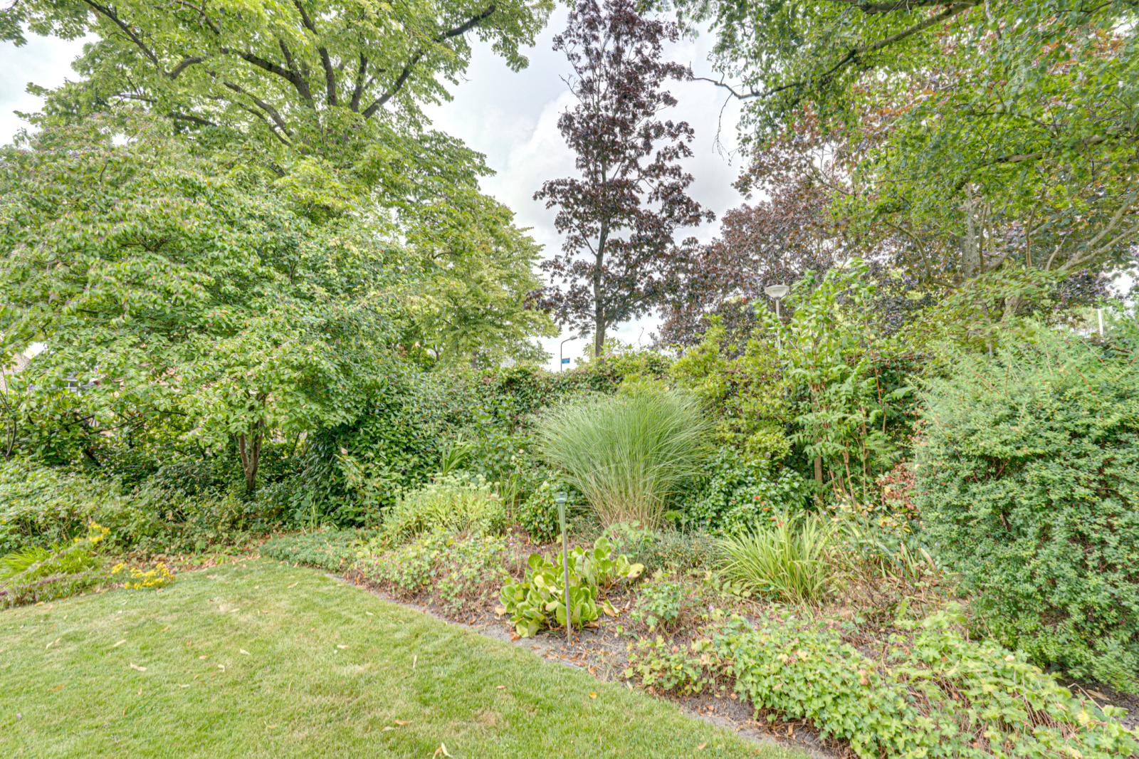Aan de voorkant van het huis is een heerlijke tuin met een gazon, borders met vaste planten en volwassen groen. De groenblijvende haag biedt veel privacy. Naast en achter de woning zijn diverse terrassen zodat er altijd wel een beschutte plek te vinden is.