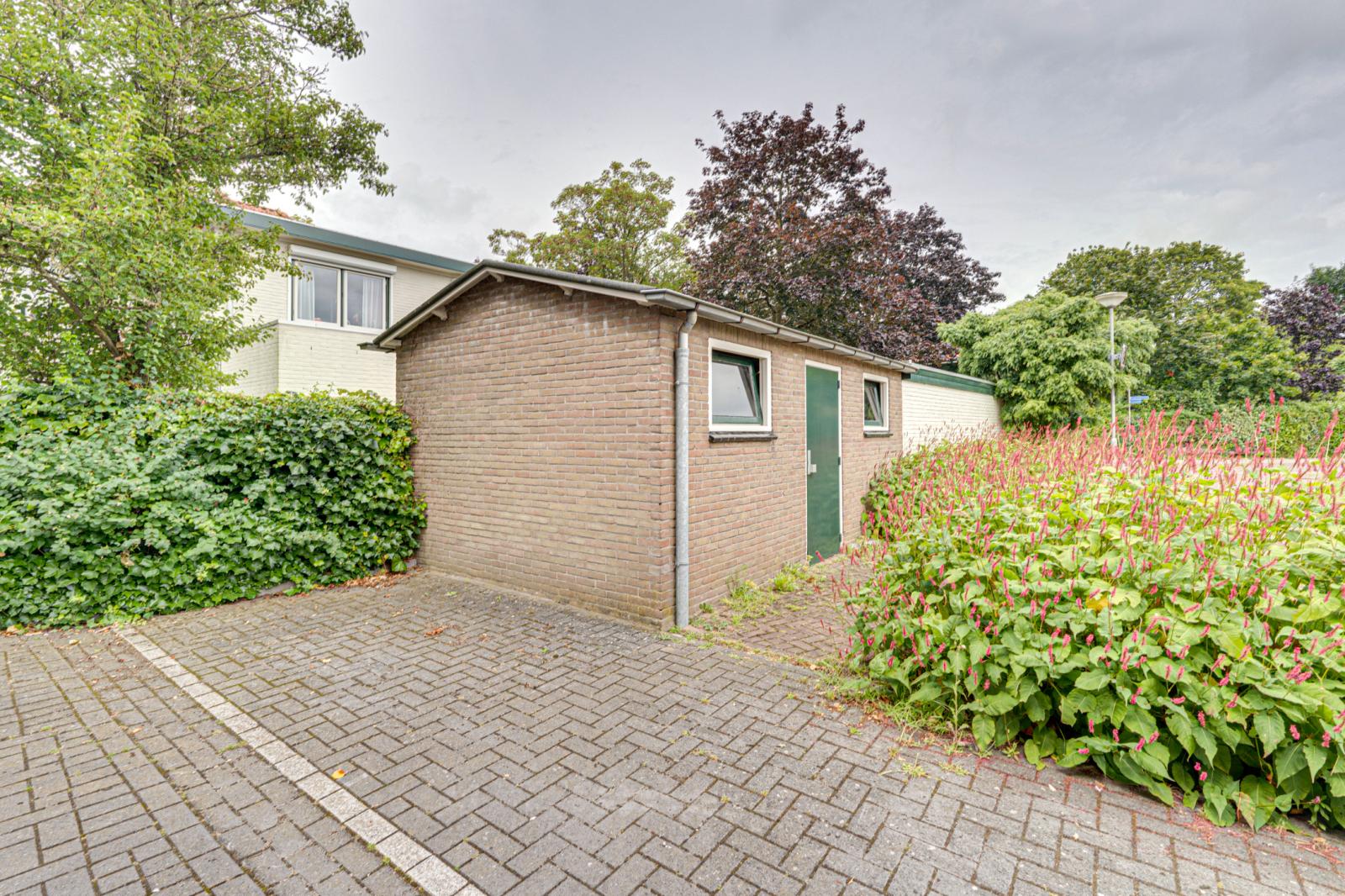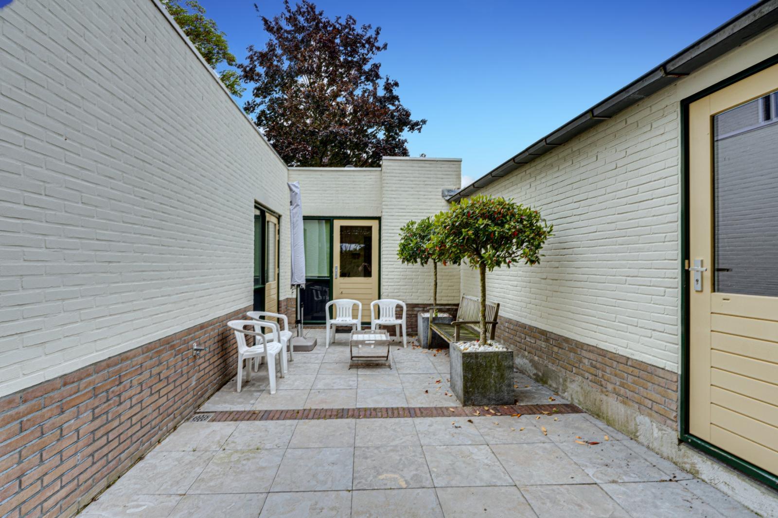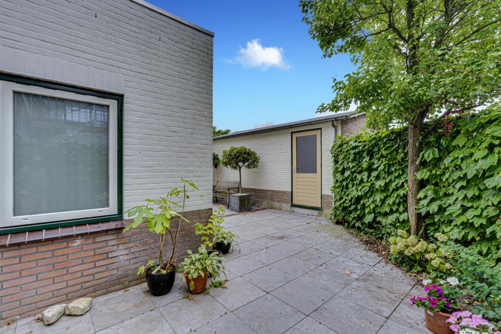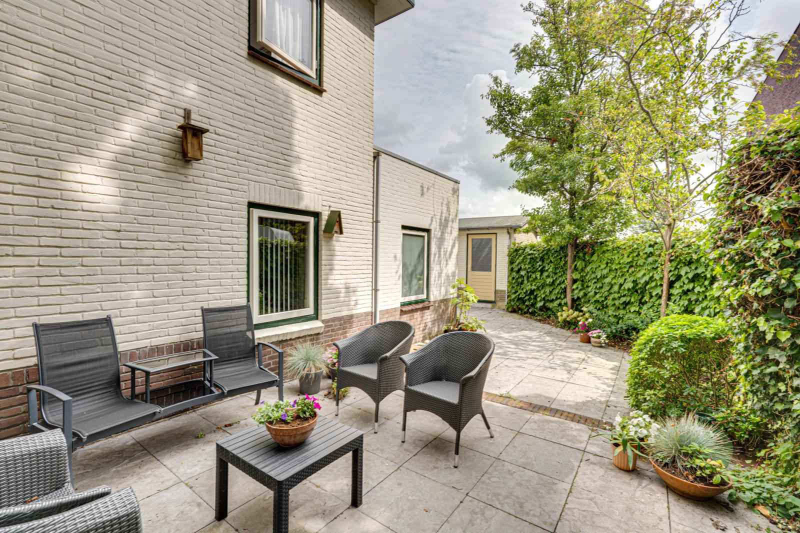 Aan de voorkant van het huis is een heerlijke tuin met een gazon, borders met vaste planten en volwassen groen. De groenblijvende haag biedt veel privacy. Naast en achter de woning zijn diverse terrassen zodat er altijd wel een beschutte plek te vinden is.
