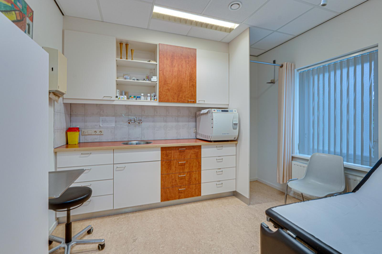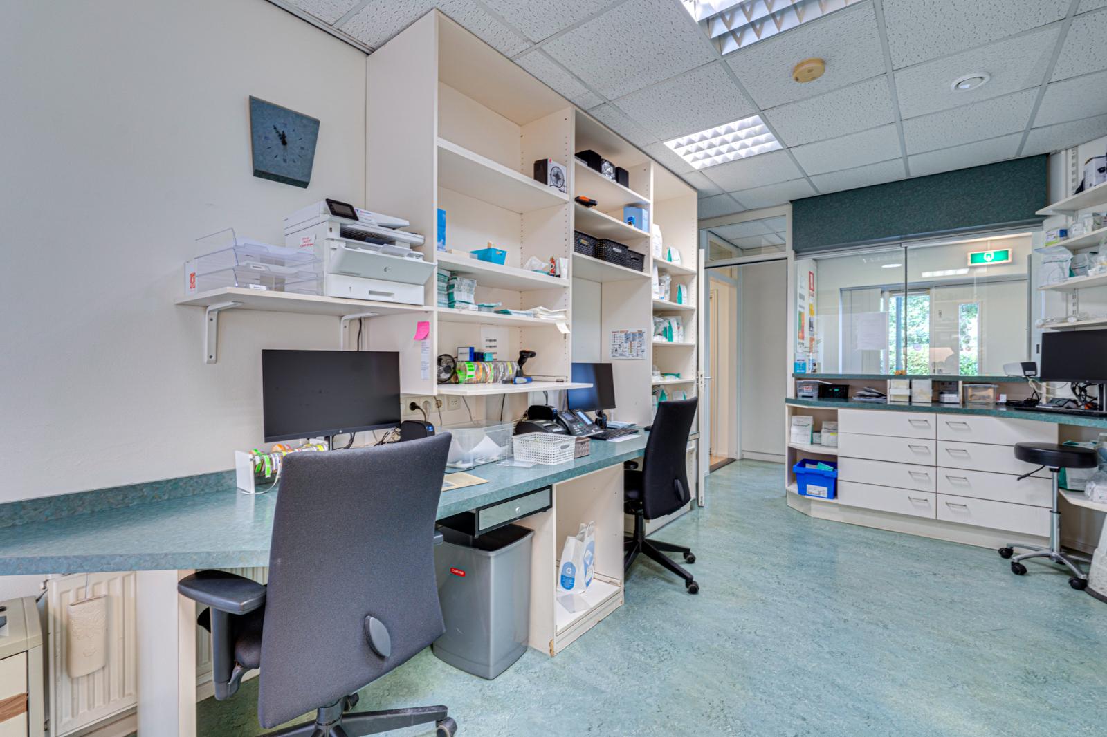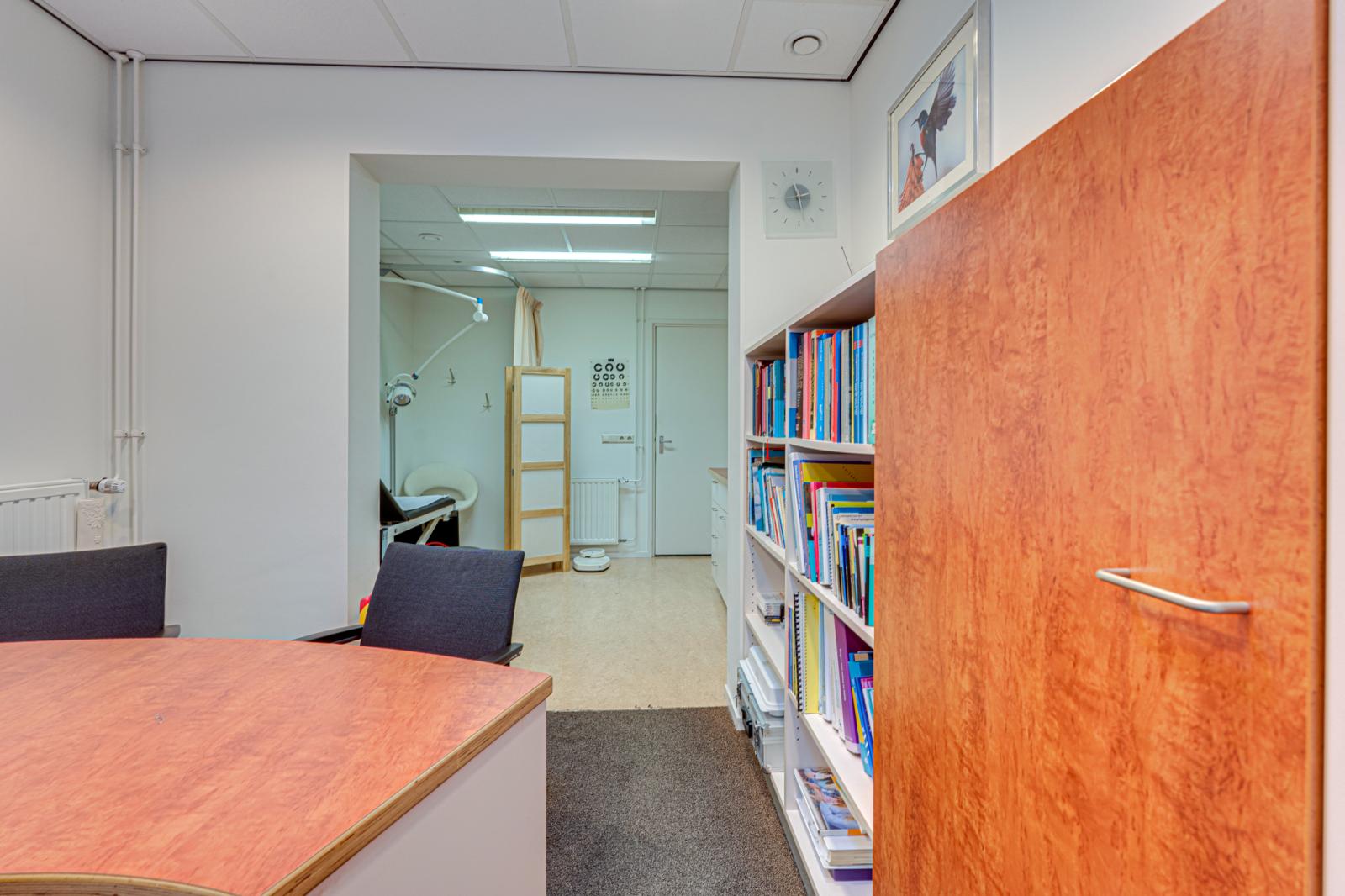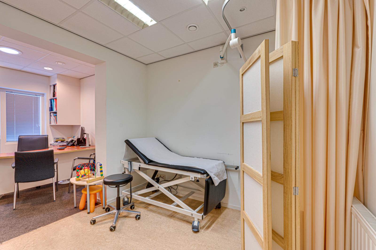 Vanuit de hal is de aangebouwde praktijk binnendoor bereikbaar. Via de rolstoel vriendelijke entree van de praktijk kom je in een ontvangstruimte met toiletgroep en toegang tot 2 praktijkruimtes, de apotheek en een behandelruimte. Hierachter is nog een kamer met een hal en een zijdeur naar buiten. De aan de achterkant aangebouwde garage is binnendoor bereikbaar en biedt toegang tot de schuur.