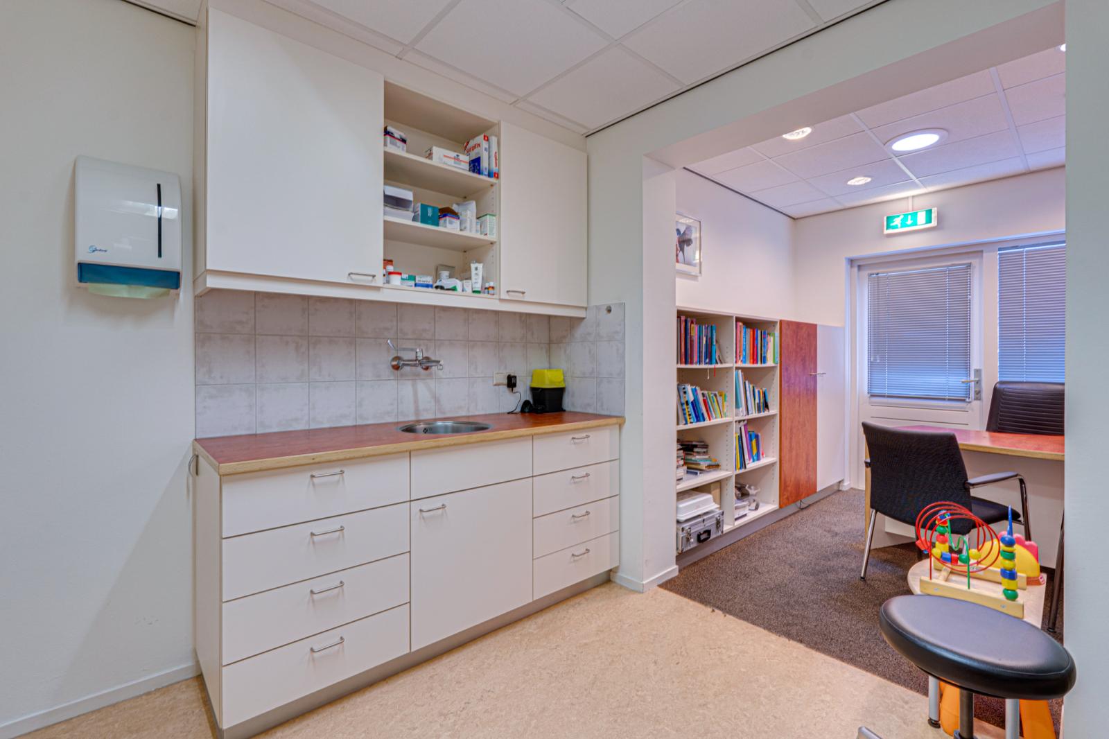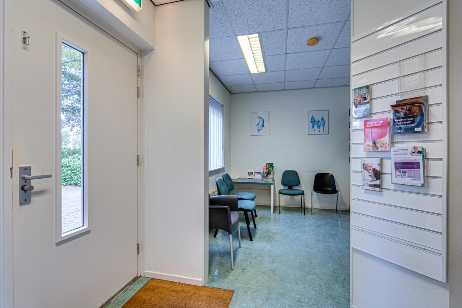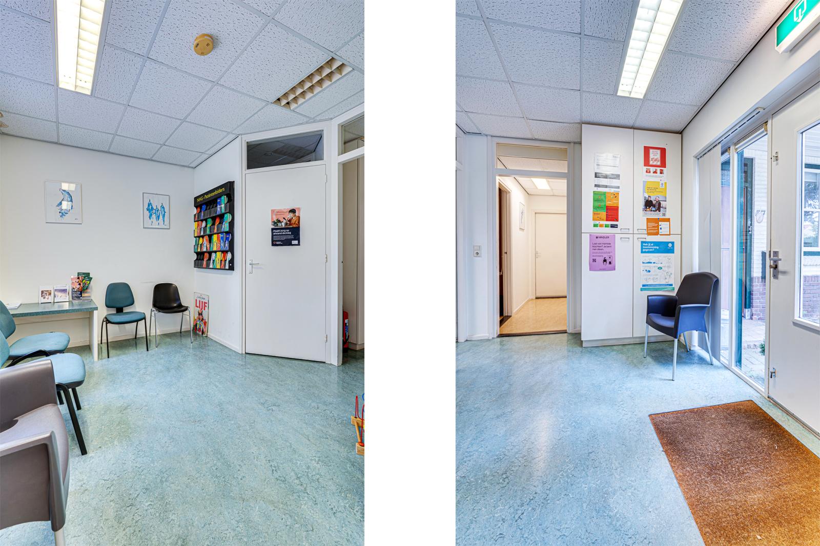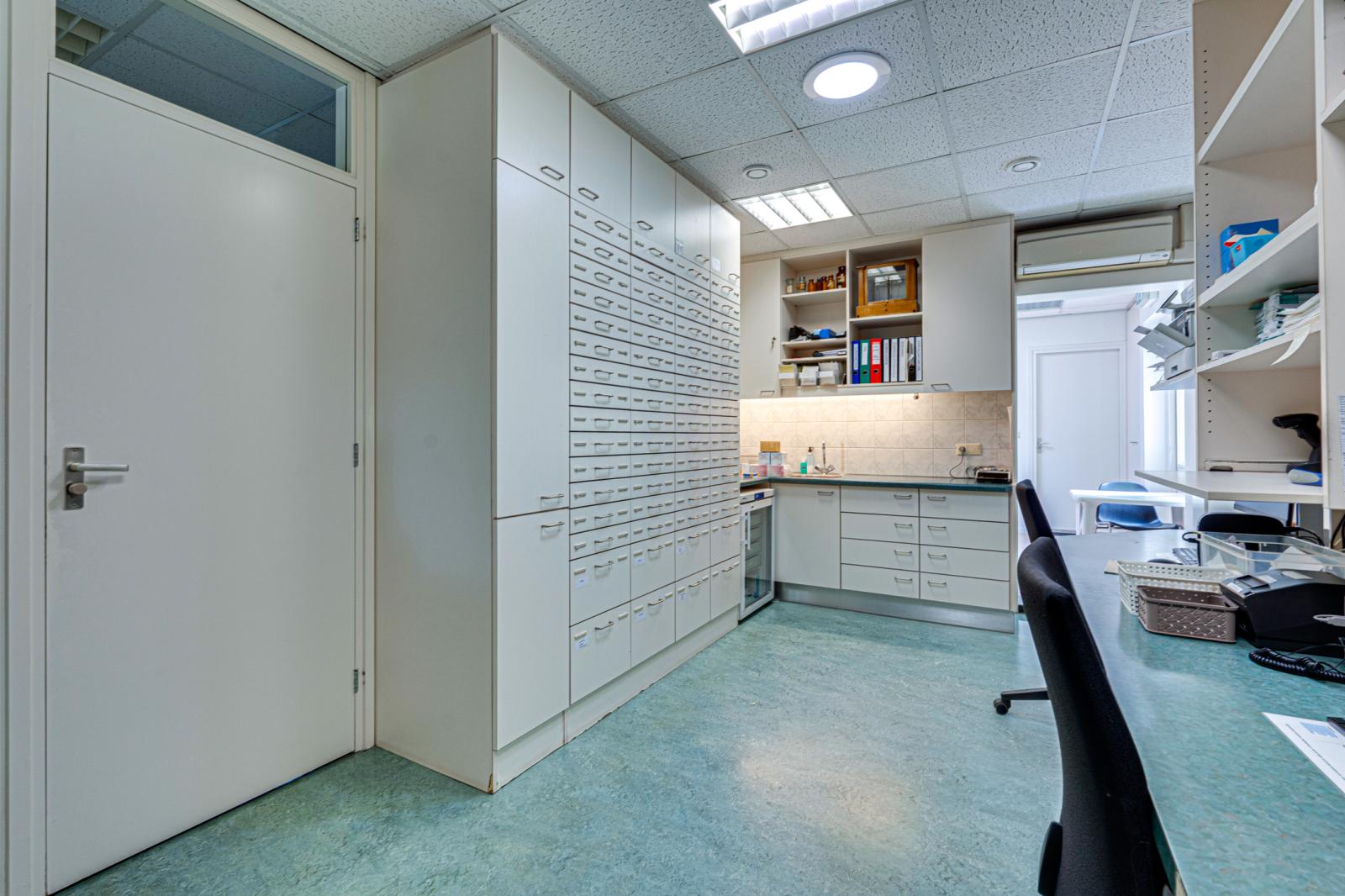 Vanuit de hal is de aangebouwde praktijk binnendoor bereikbaar. Via de rolstoel vriendelijke entree van de praktijk kom je in een ontvangstruimte met toiletgroep en toegang tot 2 praktijkruimtes, de apotheek en een behandelruimte. Hierachter is nog een kamer met een hal en een zijdeur naar buiten. De aan de achterkant aangebouwde garage is binnendoor bereikbaar en biedt toegang tot de schuur.