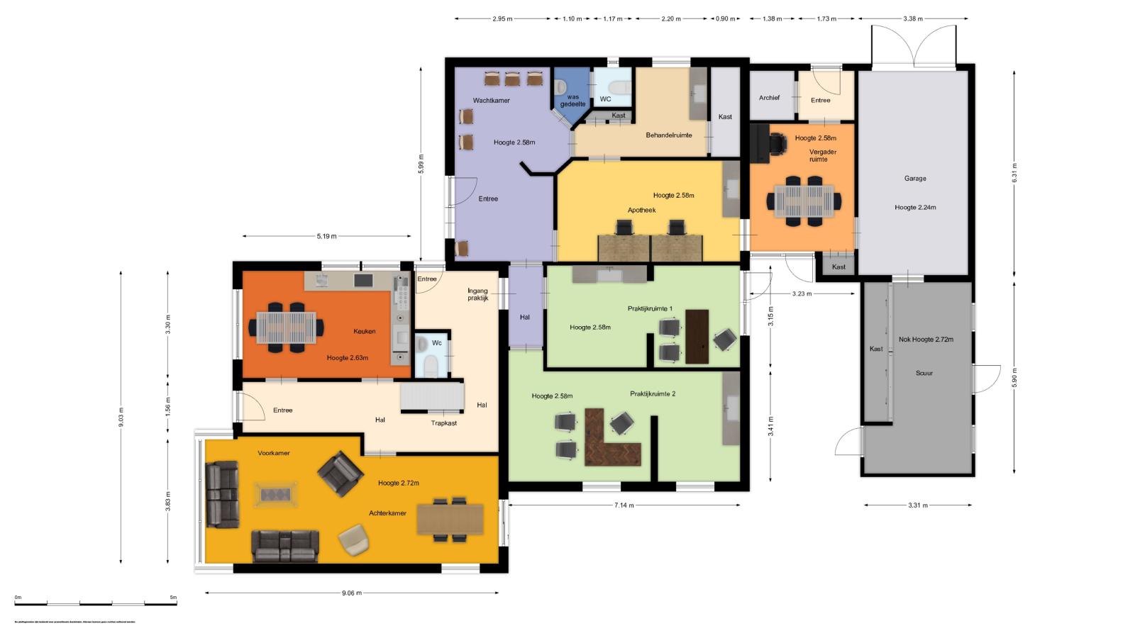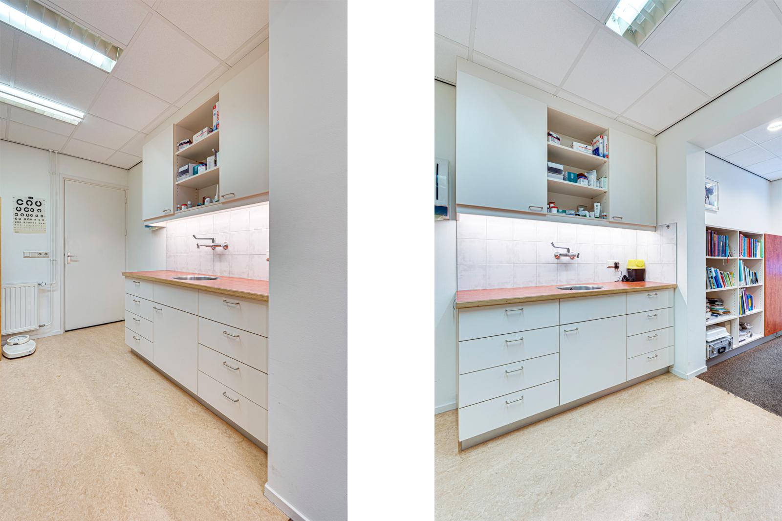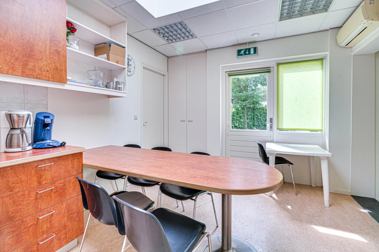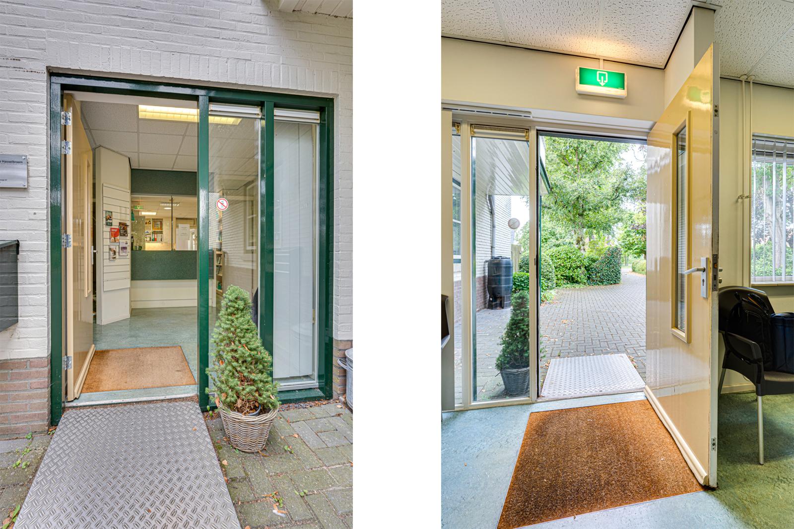 Vanuit de hal is de aangebouwde praktijk binnendoor bereikbaar. Via de rolstoel vriendelijke entree van de praktijk kom je in een ontvangstruimte met toiletgroep en toegang tot 2 praktijkruimtes, de apotheek en een behandelruimte. Hierachter is nog een kamer met een hal en een zijdeur naar buiten. De aan de achterkant aangebouwde garage is binnendoor bereikbaar en biedt toegang tot de schuur.
