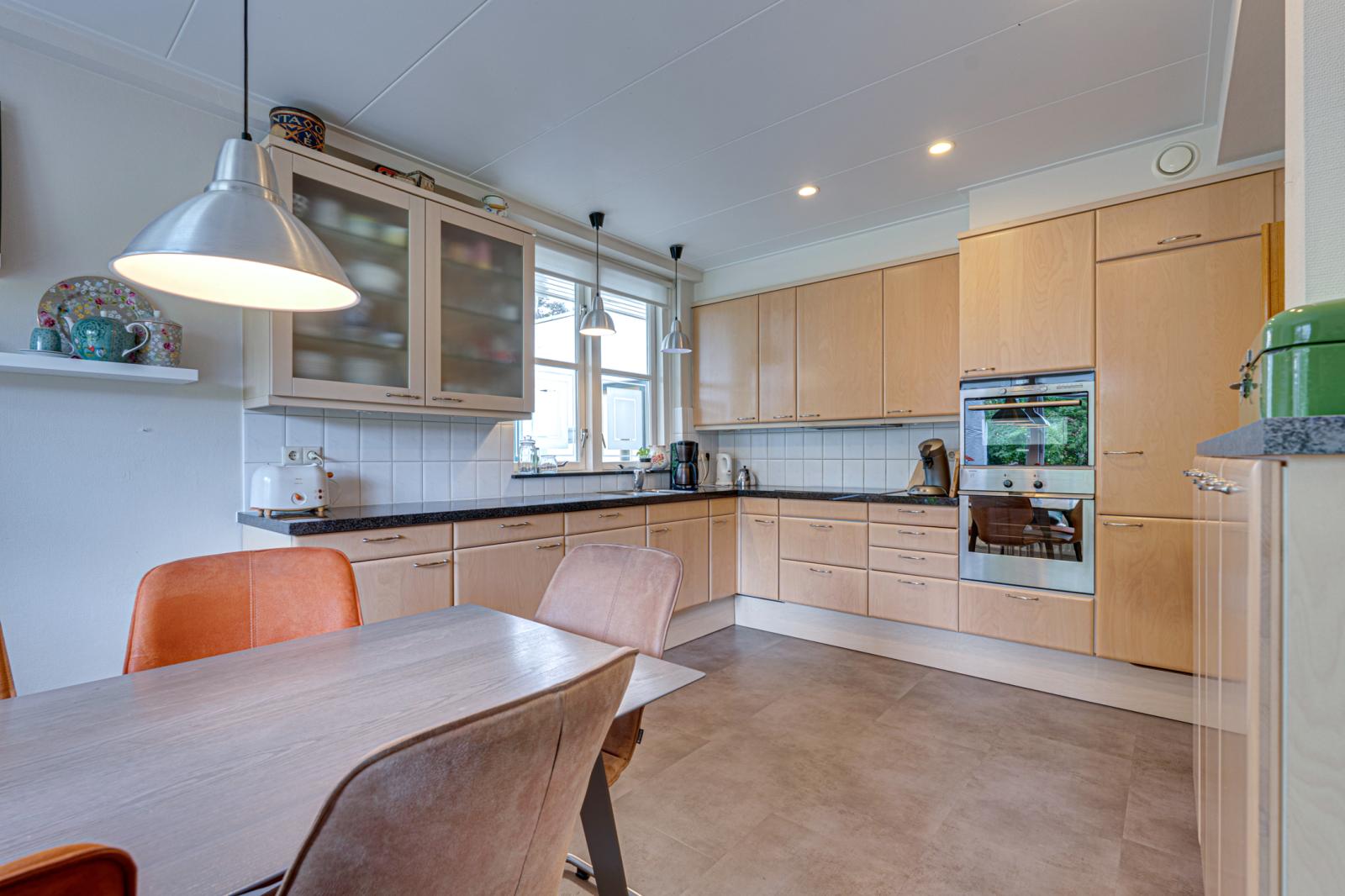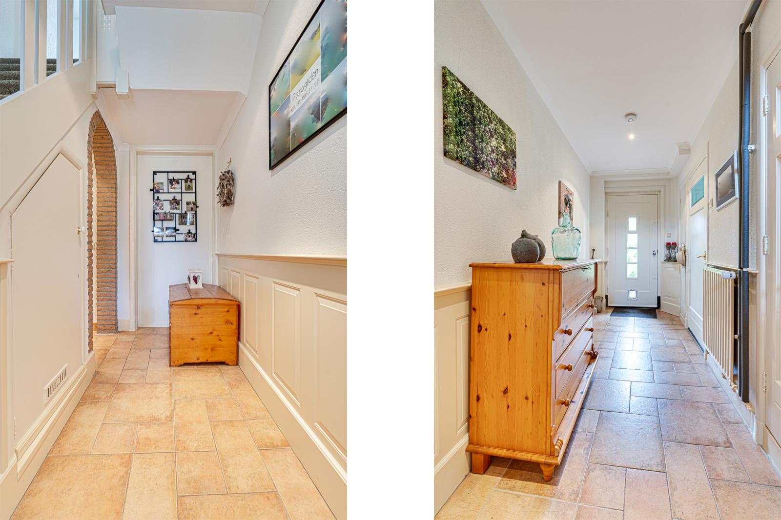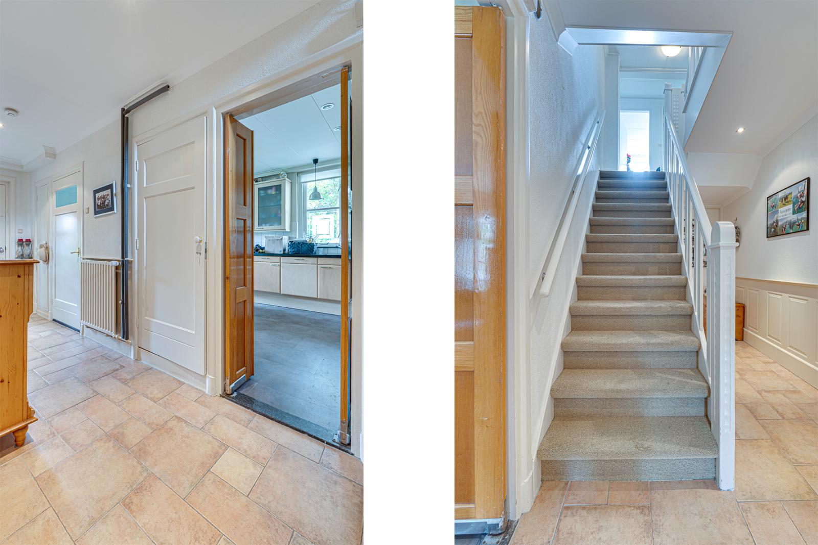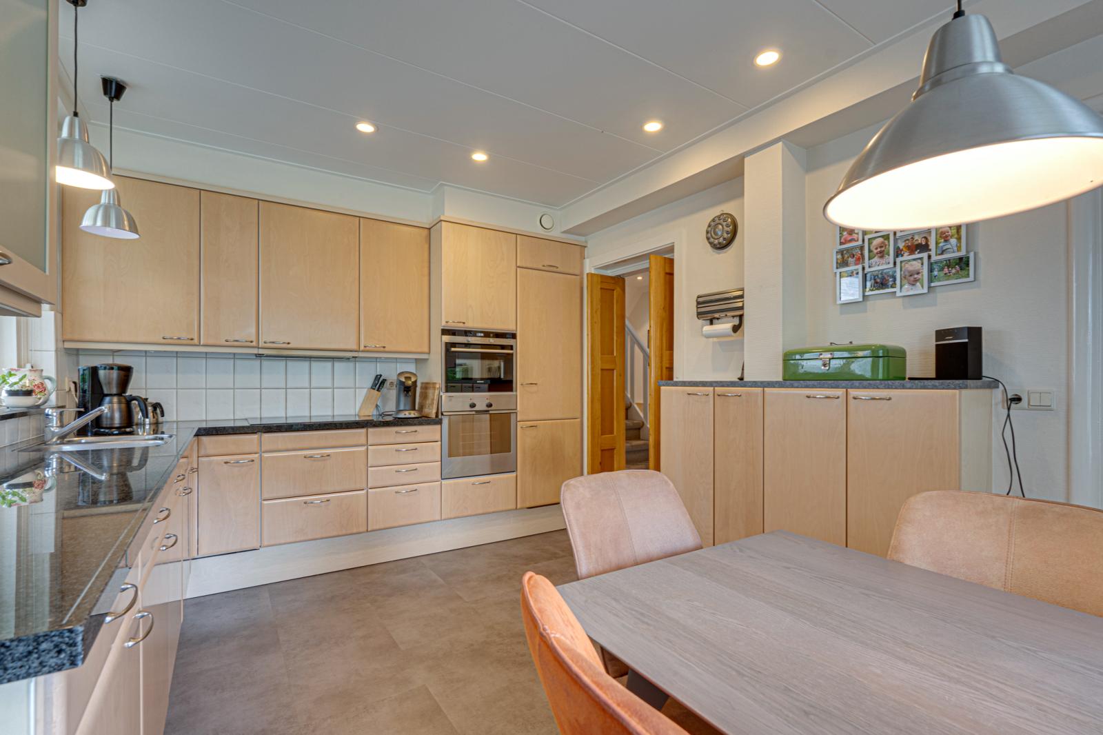 Zowel de voordeur als de deur aan de zijkant bieden toegang tot de grote hal. Hier vinden we de meterkast, een trapkast en een toilet. Links van de hal is de woonkeuken. Deze is ca. 17m2. Er is dus voldoende ruimte voor een grote eettafel. De keuken heeft een L-opstelling en beschikt over veel kast- en werkruimte met de nodige inbouwapparatuur. Rechts van de hal is de woonkamer. Door de erker aan de voorkant, de schuifpui aan de achterkant en de ramen in de zijgevel is de woonkamer opvallend licht.