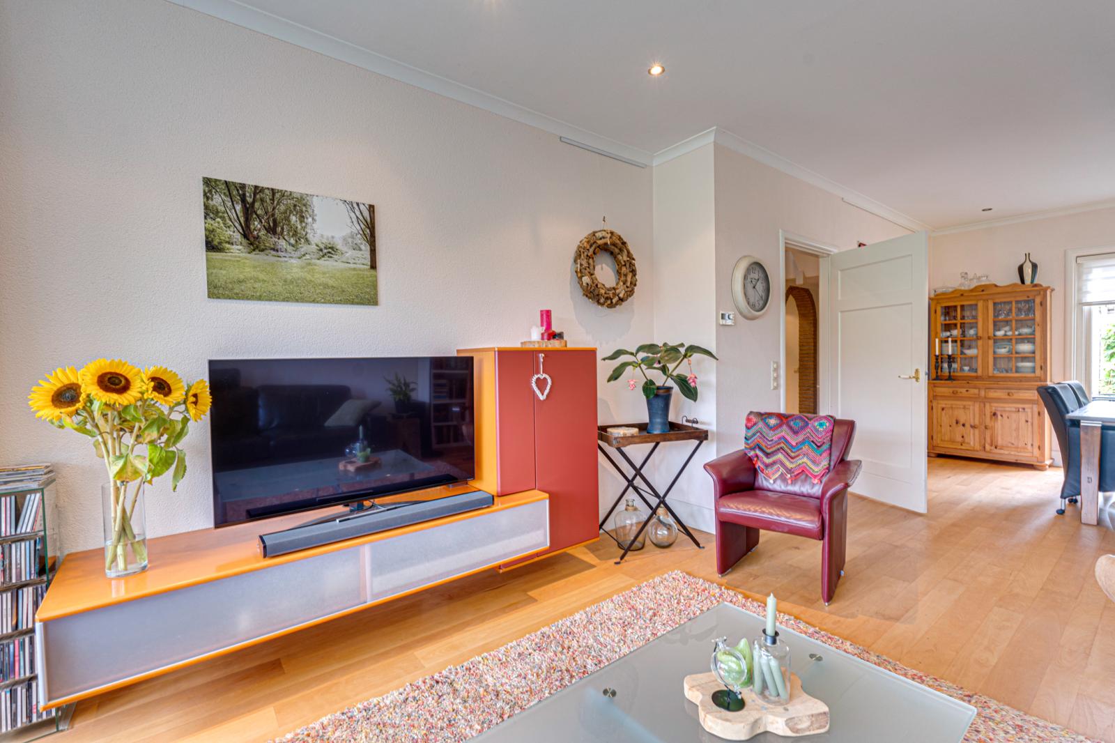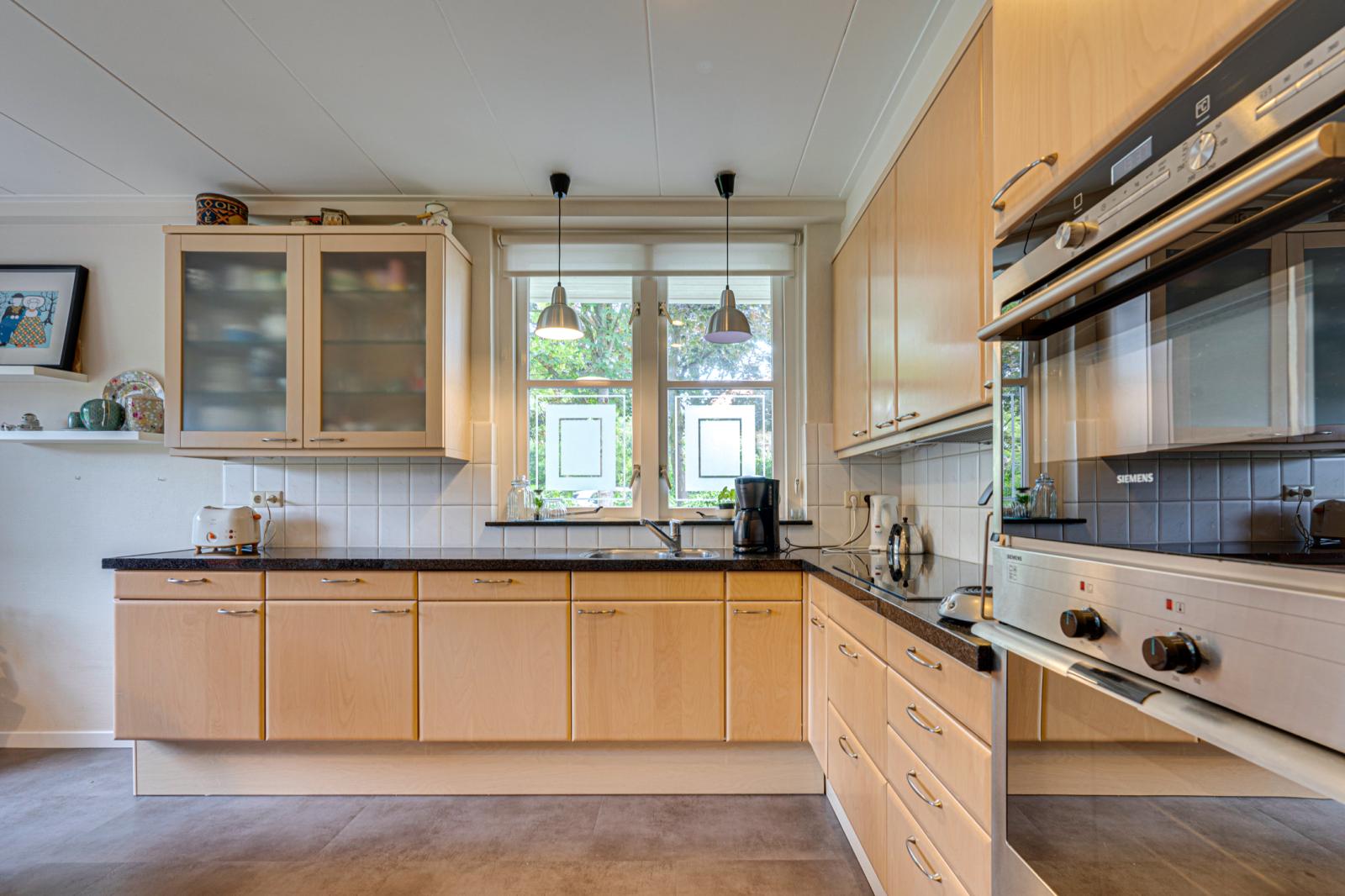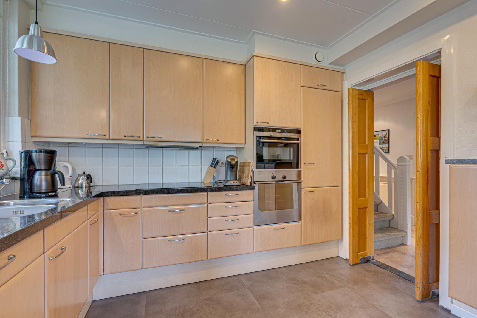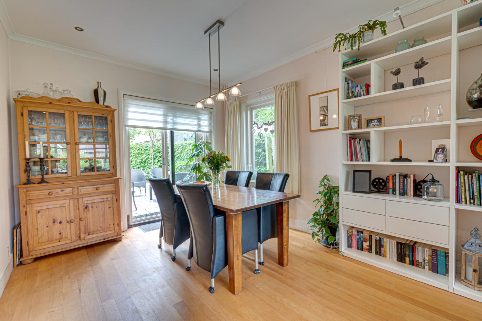 Zowel de voordeur als de deur aan de zijkant bieden toegang tot de grote hal. Hier vinden we de meterkast, een trapkast en een toilet. Links van de hal is de woonkeuken. Deze is ca. 17m2. Er is dus voldoende ruimte voor een grote eettafel. De keuken heeft een L-opstelling en beschikt over veel kast- en werkruimte met de nodige inbouwapparatuur. Rechts van de hal is de woonkamer. Door de erker aan de voorkant, de schuifpui aan de achterkant en de ramen in de zijgevel is de woonkamer opvallend licht.