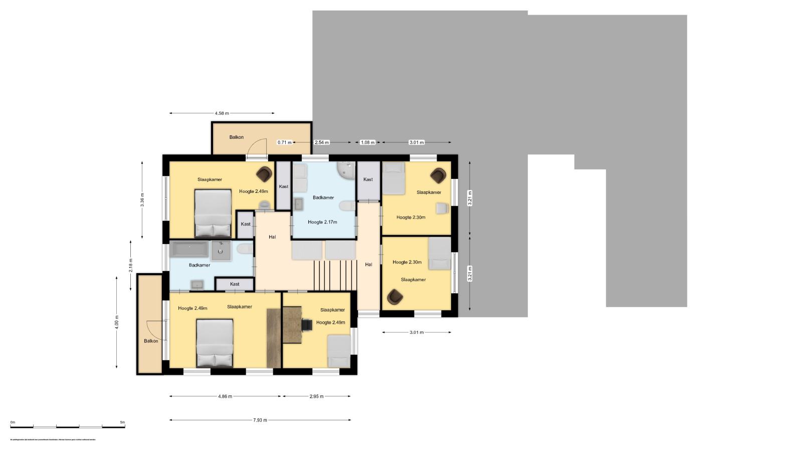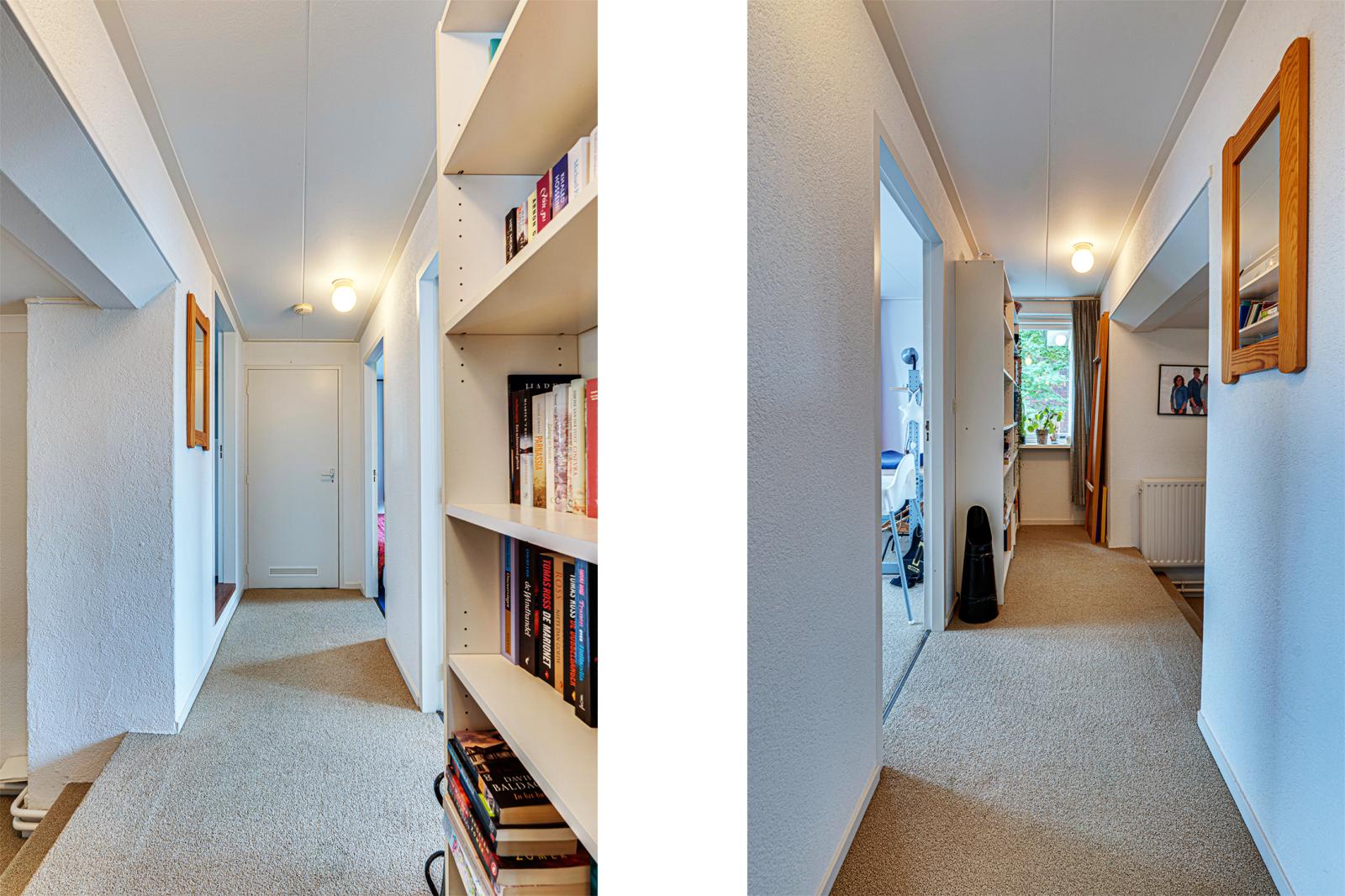Er is een grote overloop met toegang tot de 2 badkamers en 5 slaapkamers.