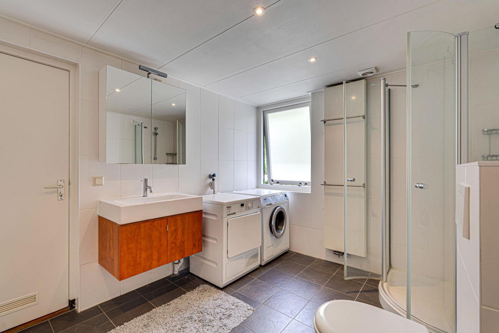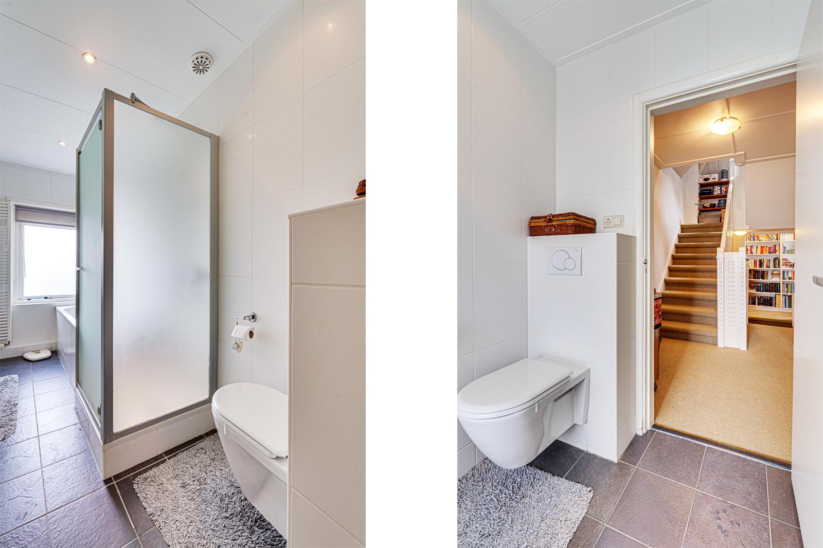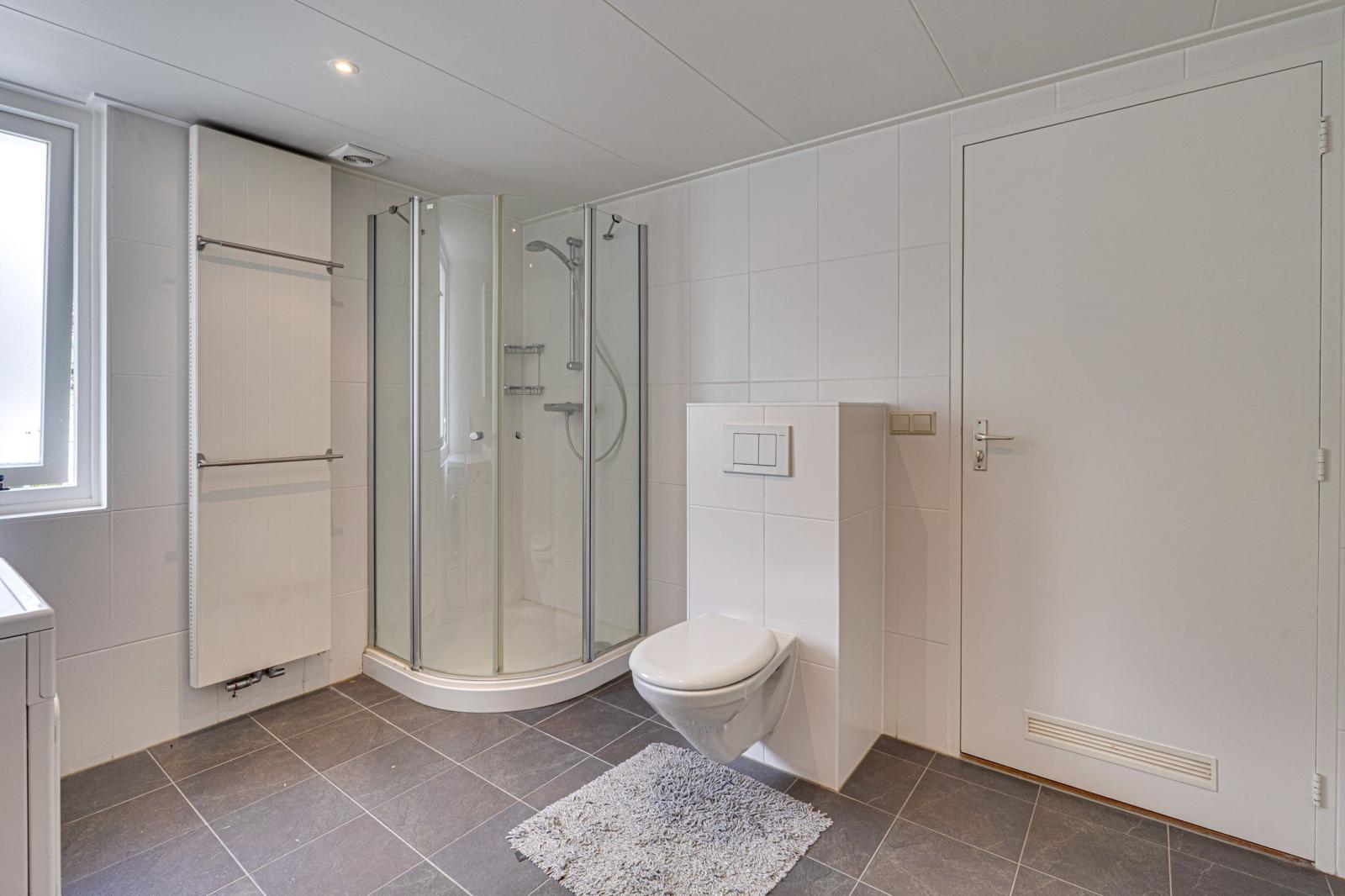 De tweede badkamer is vanaf de overloop toegankelijk. Deze badkamer beschikt over een wastafelmeubel, toilet en douchecabine.
