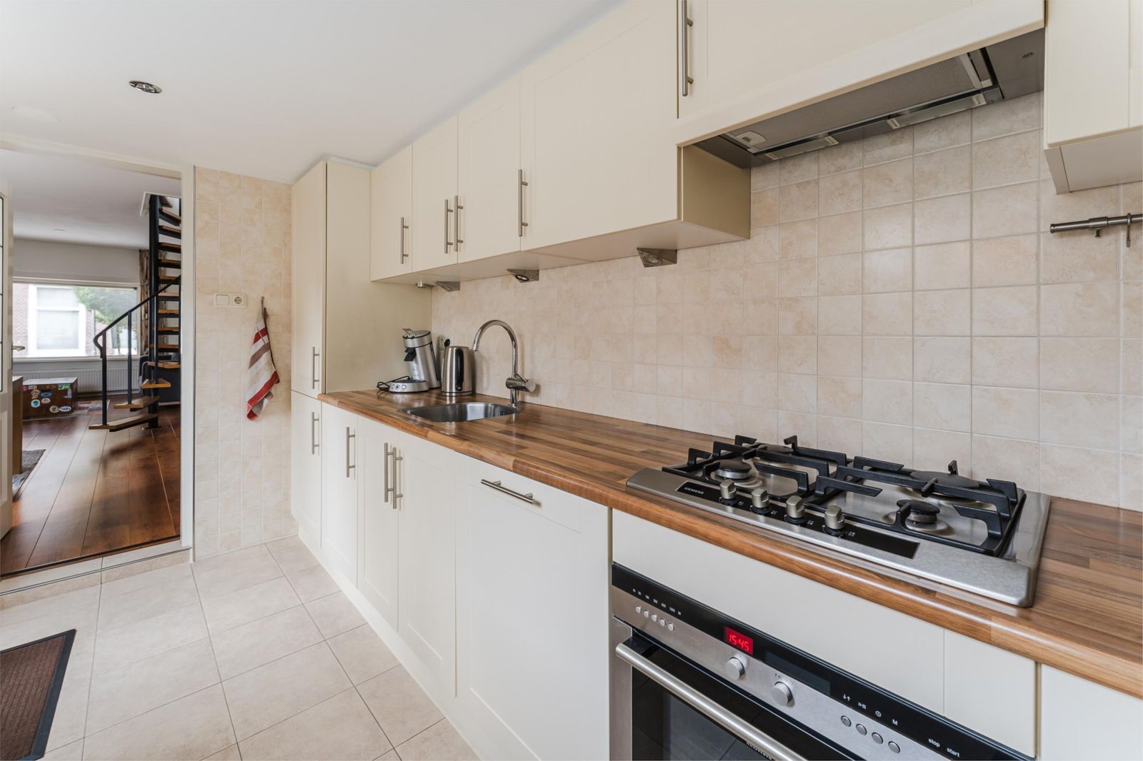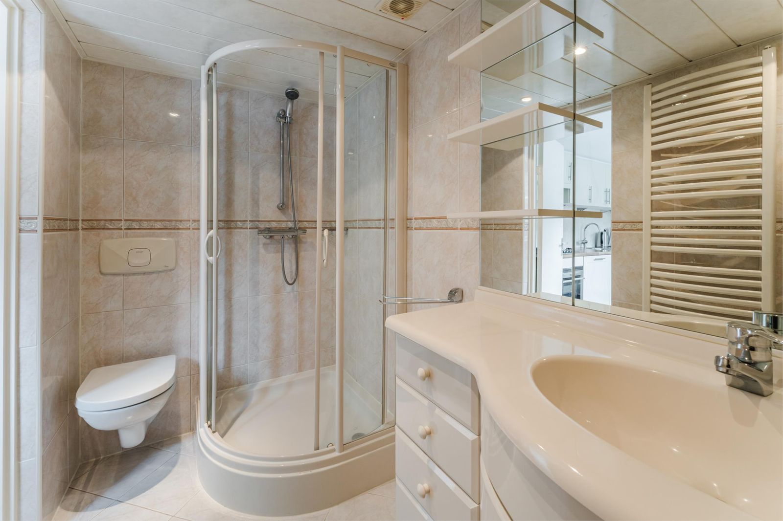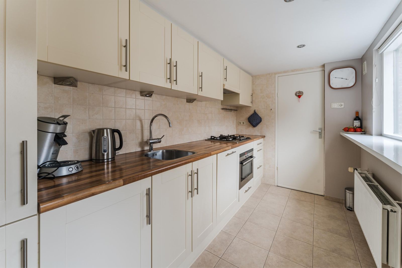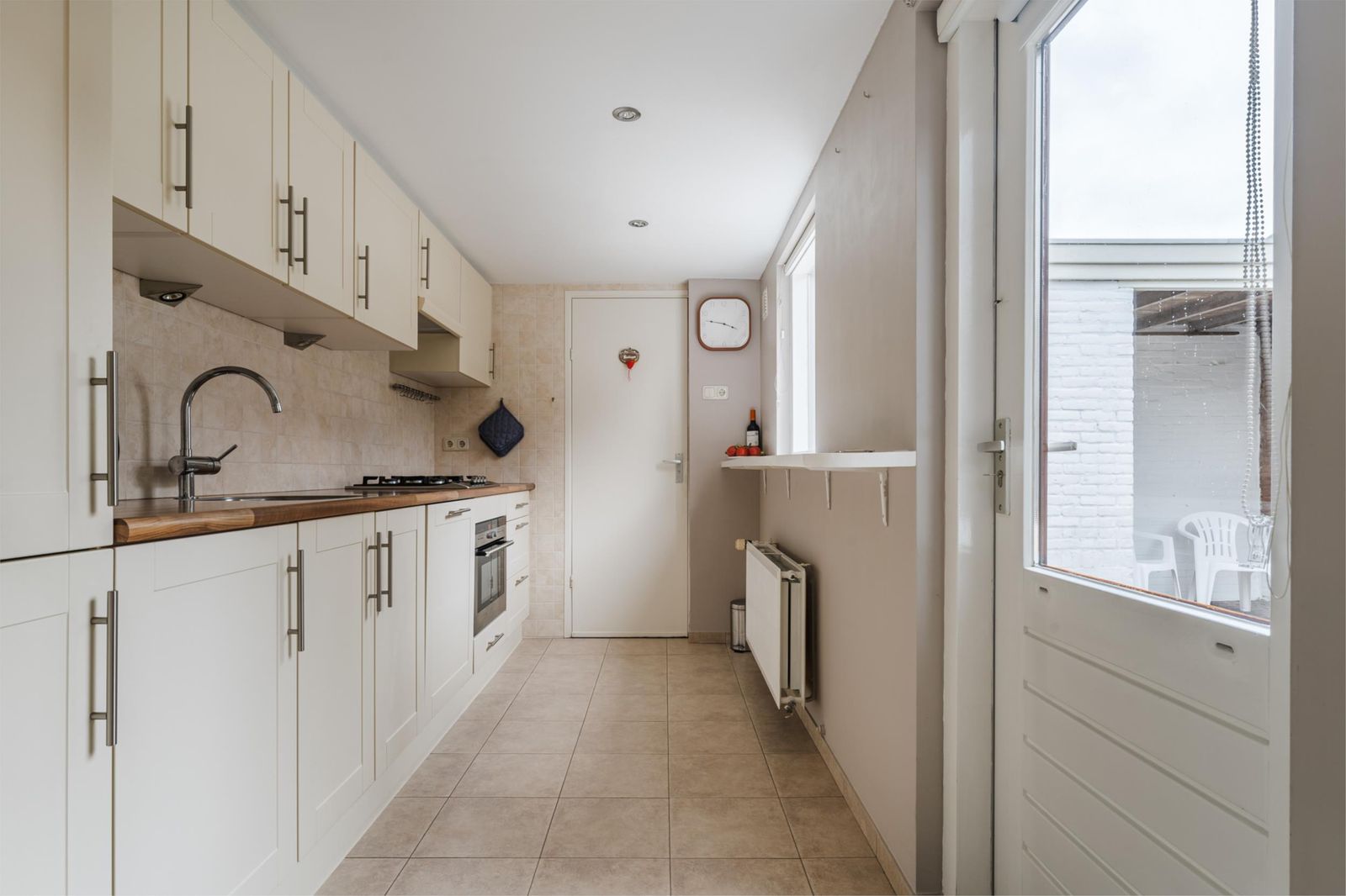 - keuken met inbouwapparatuur (koel/vries, vaatwasser, combimagnetron, kookplaat);