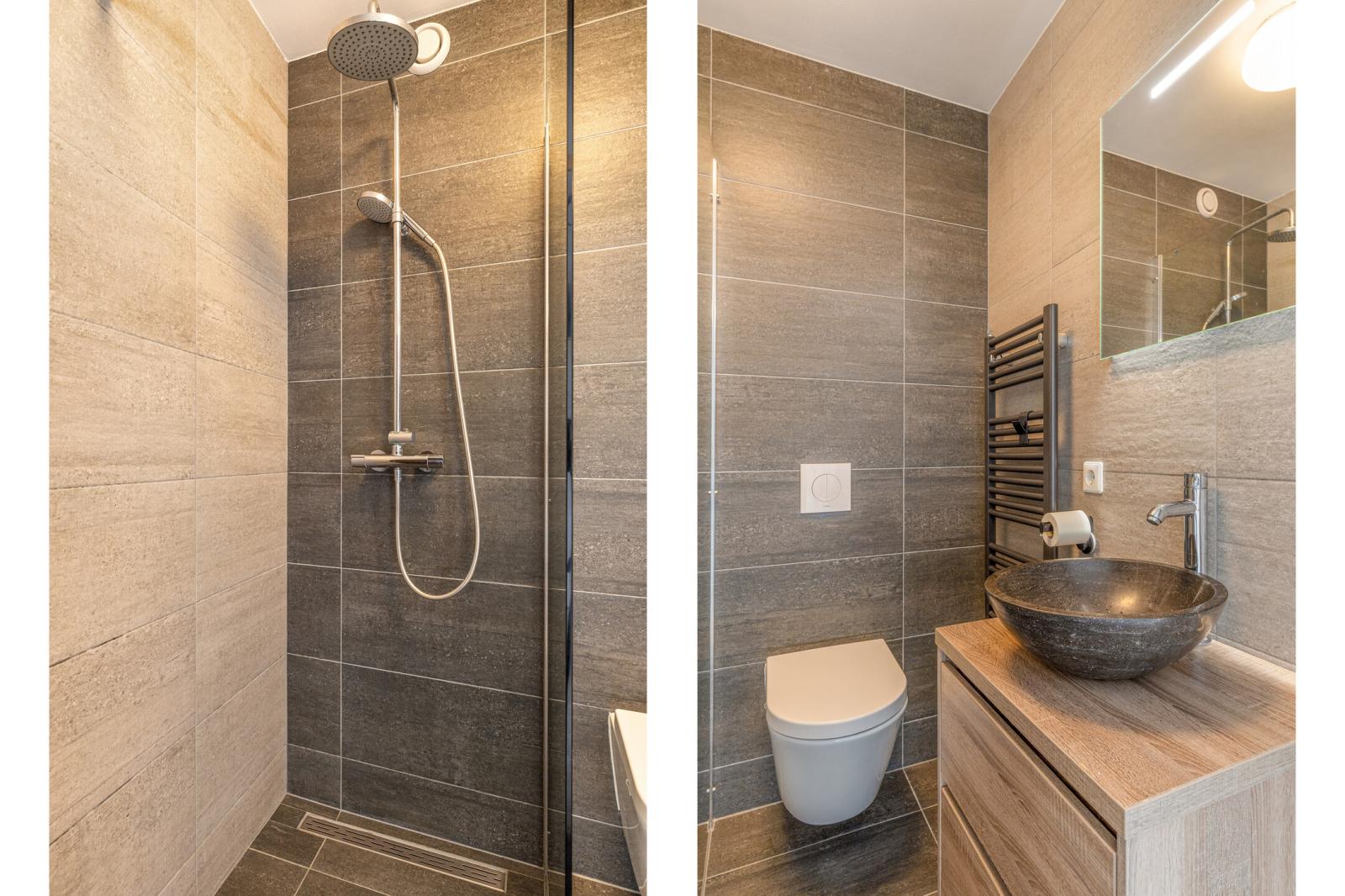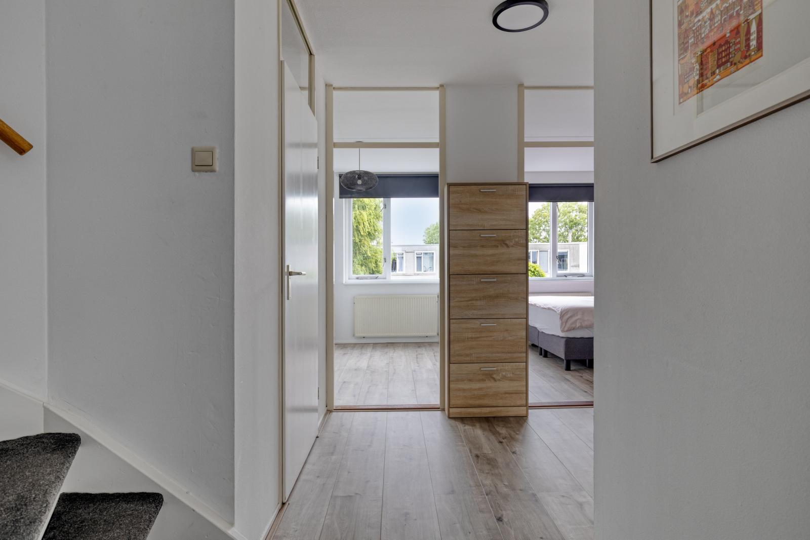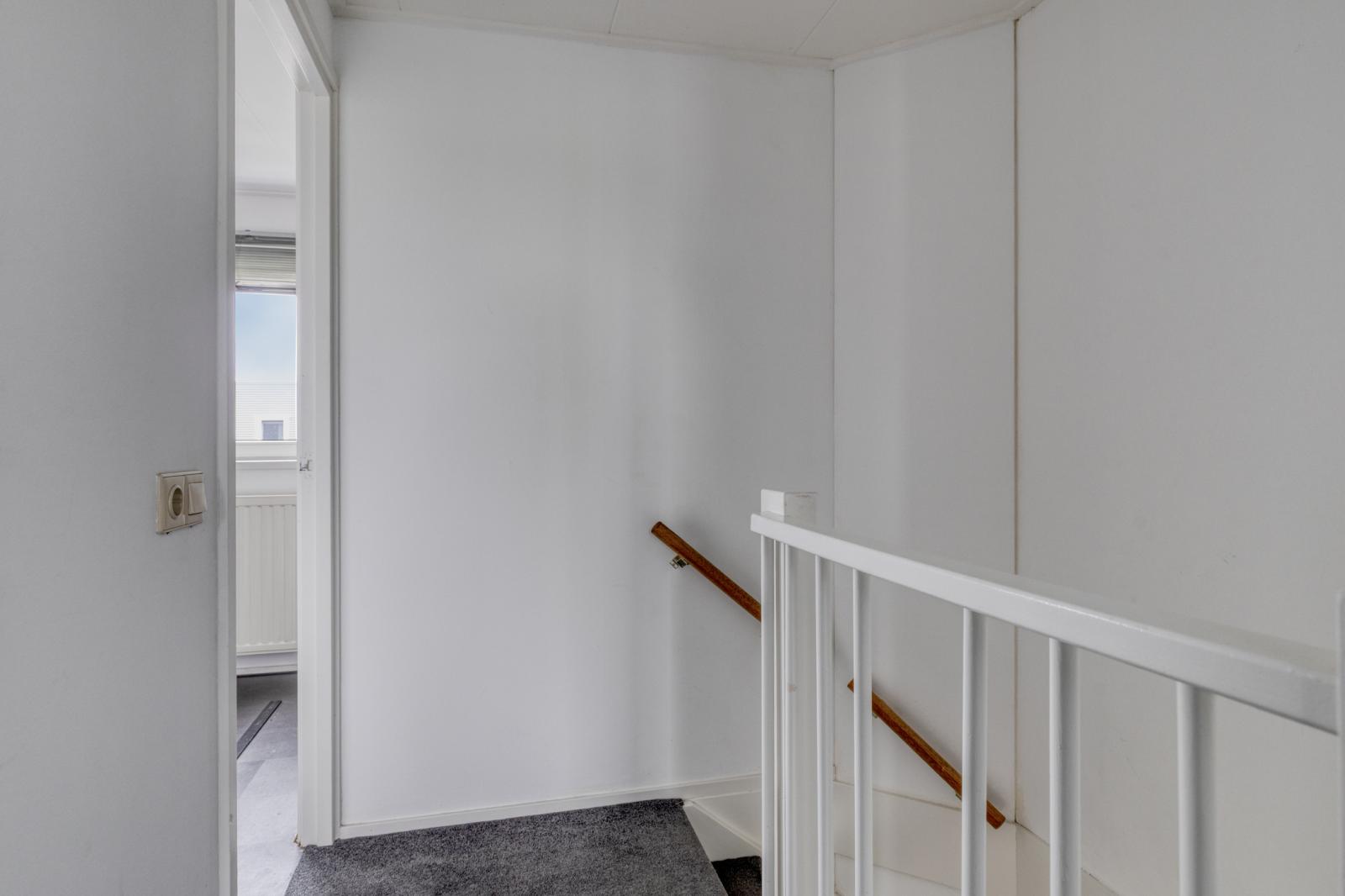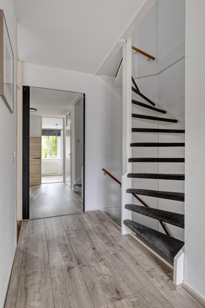 Eerste verdieping: overloop met vaste trap naar de tweede verdieping. Aan de voorzijde van de woning een slaapkamer van ca. 17 m². Een moderne badkamer voorzien van inloopdouche, wastafel(meubel) en toilet. Aan de achterzijde twee slaapkamers respectievelijk ca. 6,8 m² en ca. 9 m². Tevens is er nog een handige ruimte voor de wasmachine en de droger, hier bevindt zich ook de CV-ketel (2021).