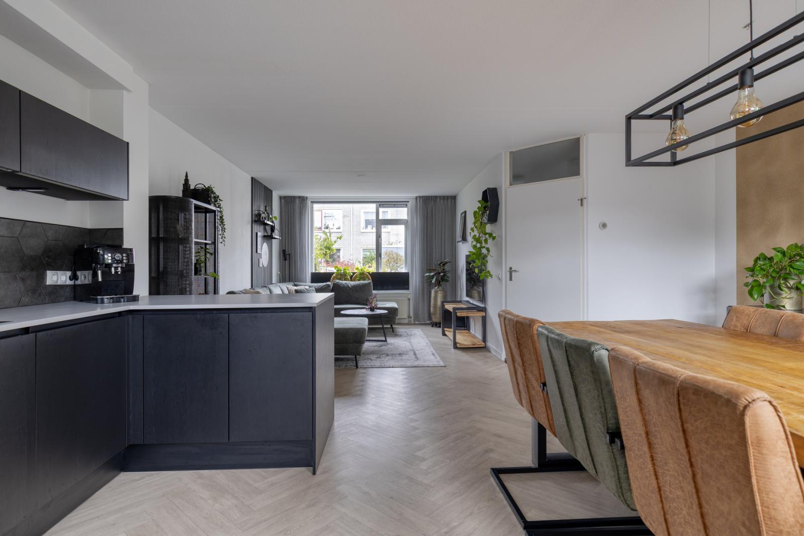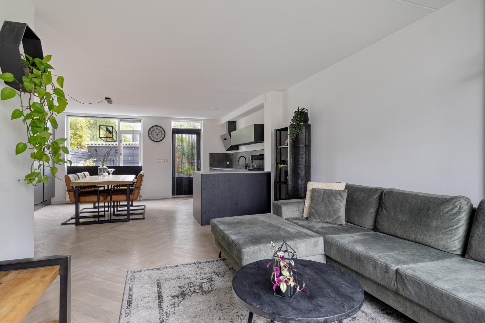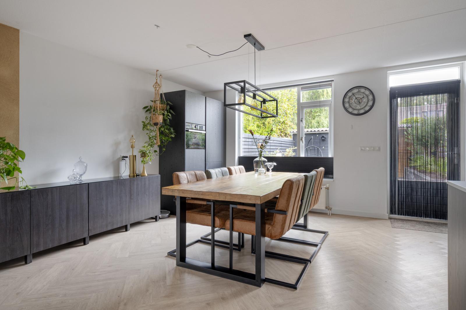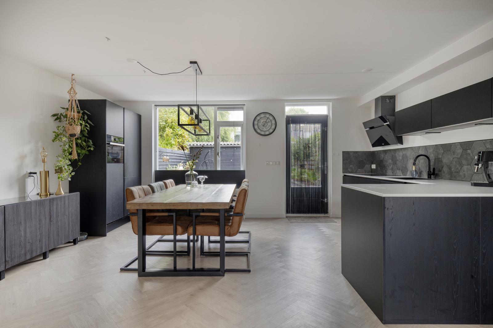 Begane grond: entree/hal met meterkast, toilet en trap naar de eerste verdieping. De ruime en sfeervolle woonkamer met open keuken heeft veel lichtinval. De open keuken is in 2021 geplaatst en is zeer compleet uitgerust en beschikt over diverse inbouwapparatuur, zoals vaatwasser, inductiekooplaat, afzuigkap, vriezer, combi-oven, een zeer grote koelkast en een elektrische boiler. Vanuit de keuken bereik je de achtertuin gelegen op het noordwesten. Woonkamer en open keuken zijn gezamenlijk ca. 41 m².