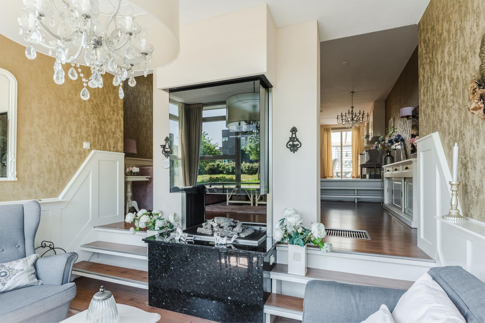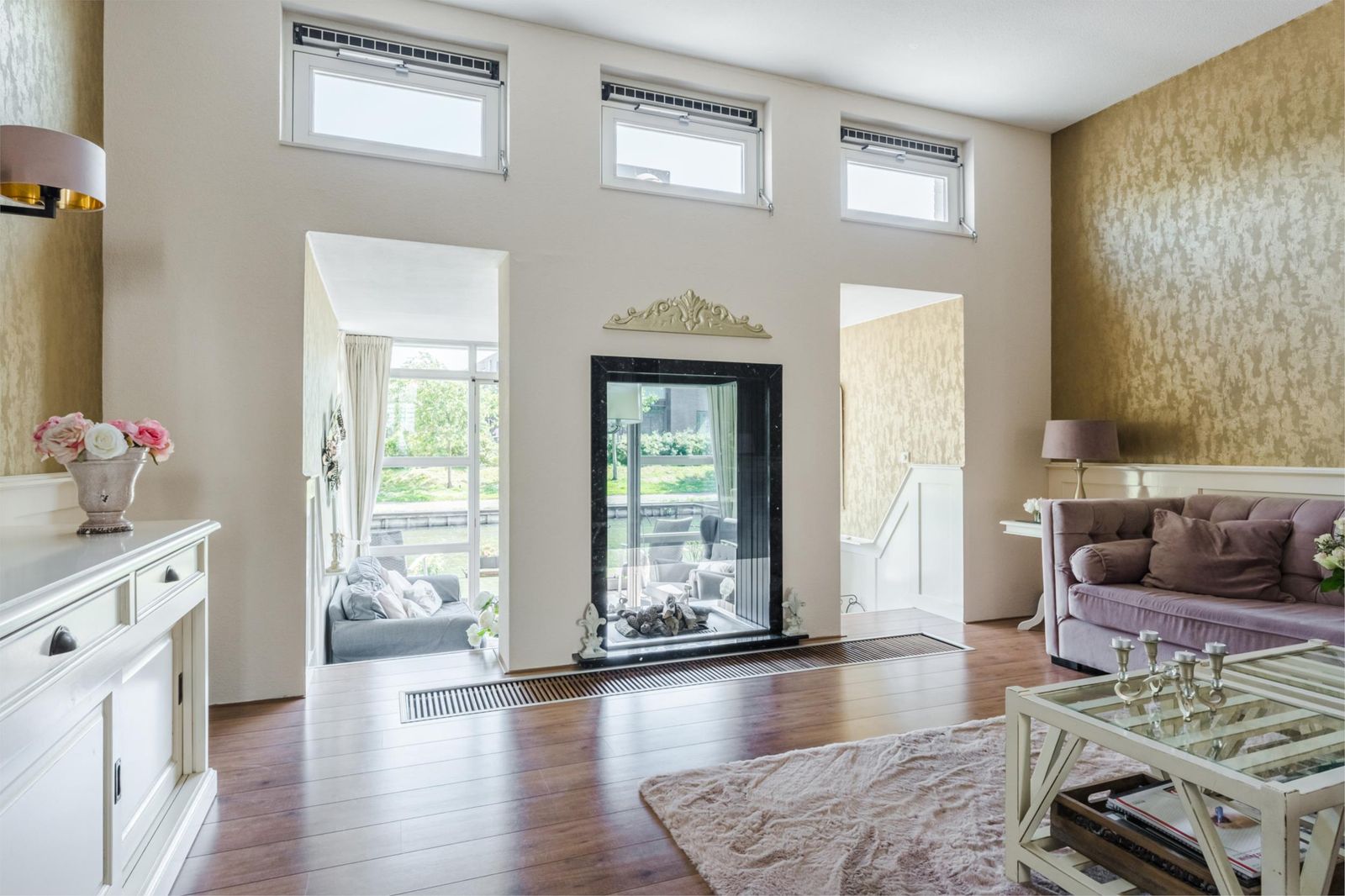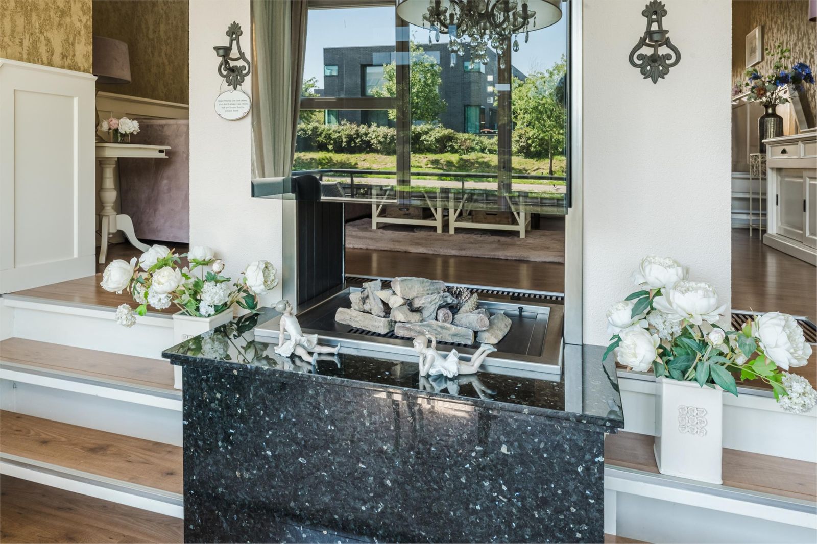 Woonkamer: Via een trap met 2 treden komt u op het 2e niveau, waar de living zich bevindt. De tunnel gas openhaard en de vele raampartijen, deels in de woonkamer en Serre, zorgen voor een prachtige lichtinval.