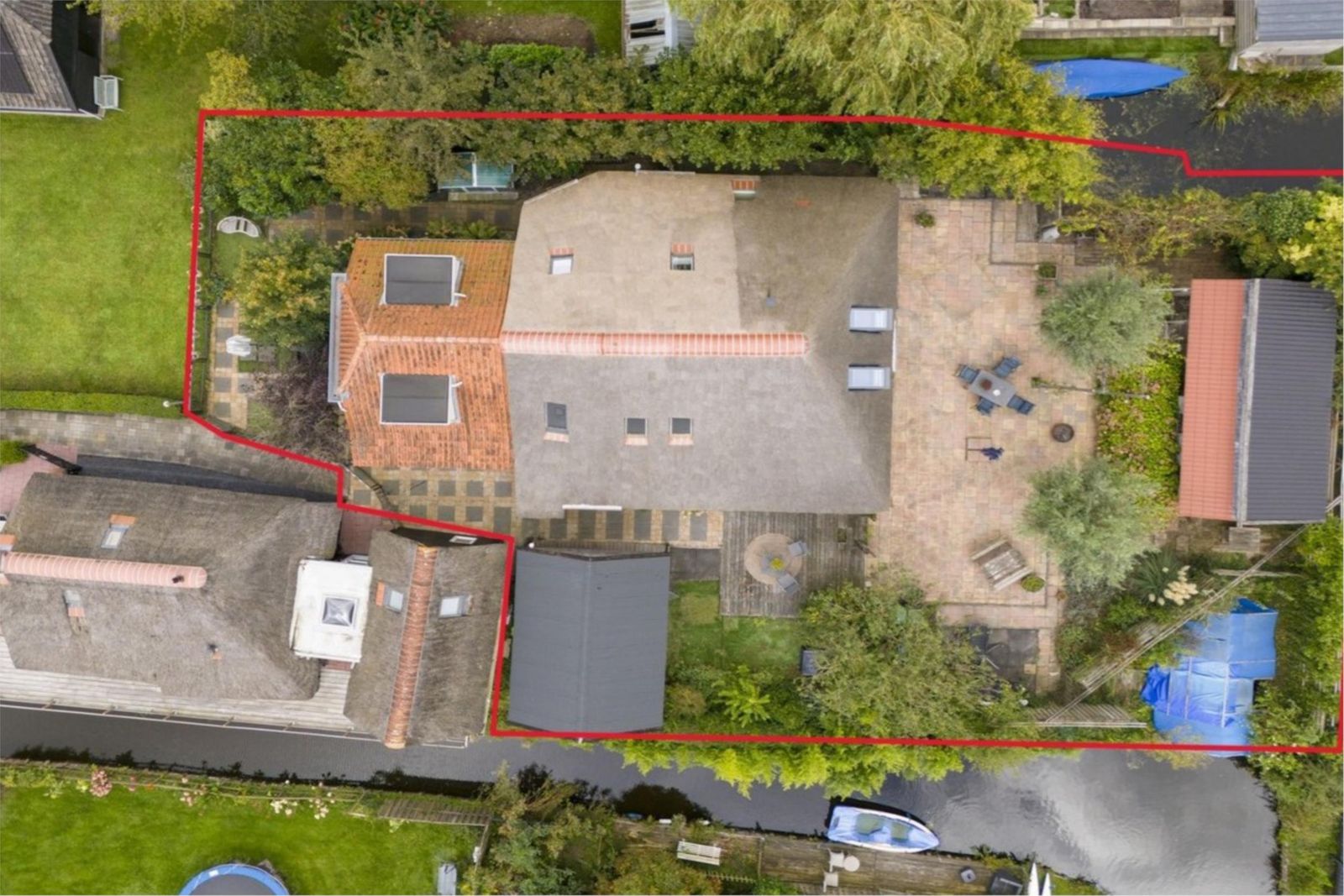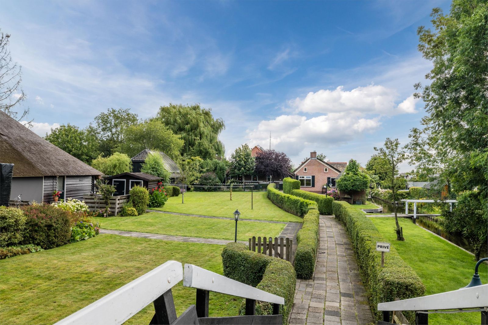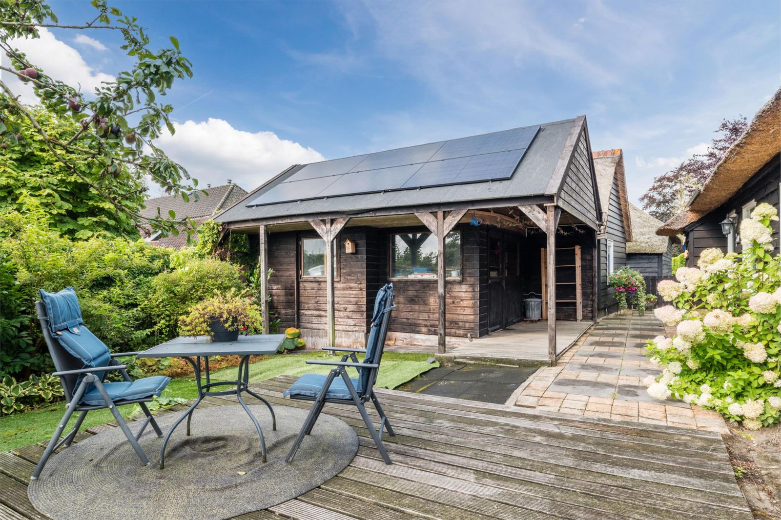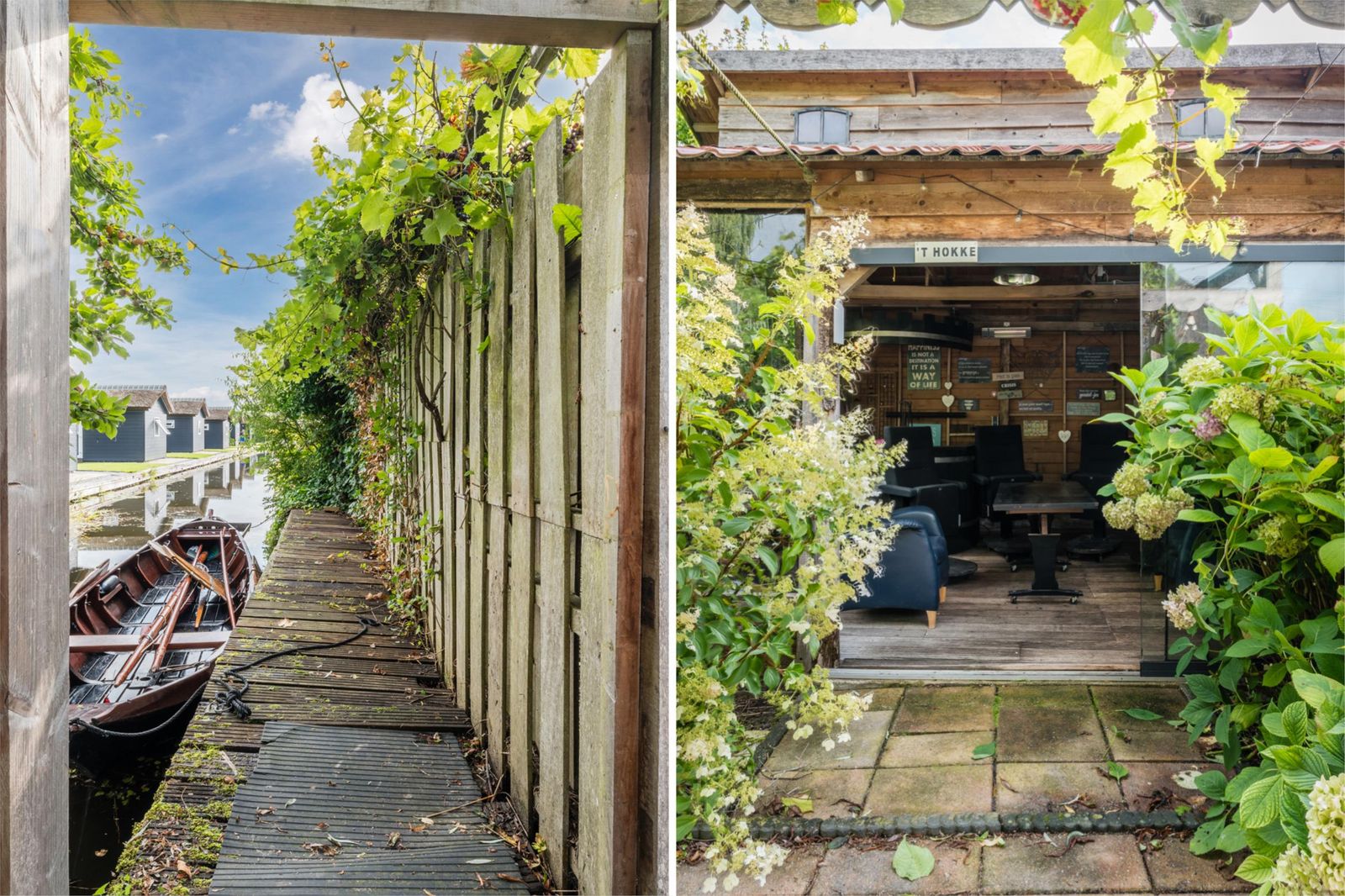Het buitenleven is hier minstens zo bijzonder als het huis zelf. Vanuit je eigen haven vaar je direct richting natuurgebieden of naar het centrum van Giethoorn. De tuin biedt meerdere terrassen met zon en schaduw, omringd door groen en fruitbomen. Daarnaast zijn er diverse bijgebouwen, waaronder een schuur met nieuwe kap en zonnepanelen, een tuinhuis met mancave en sauna, een overdekte botenligplaats en een eigen aanlegsteiger voor één tot twee boten.