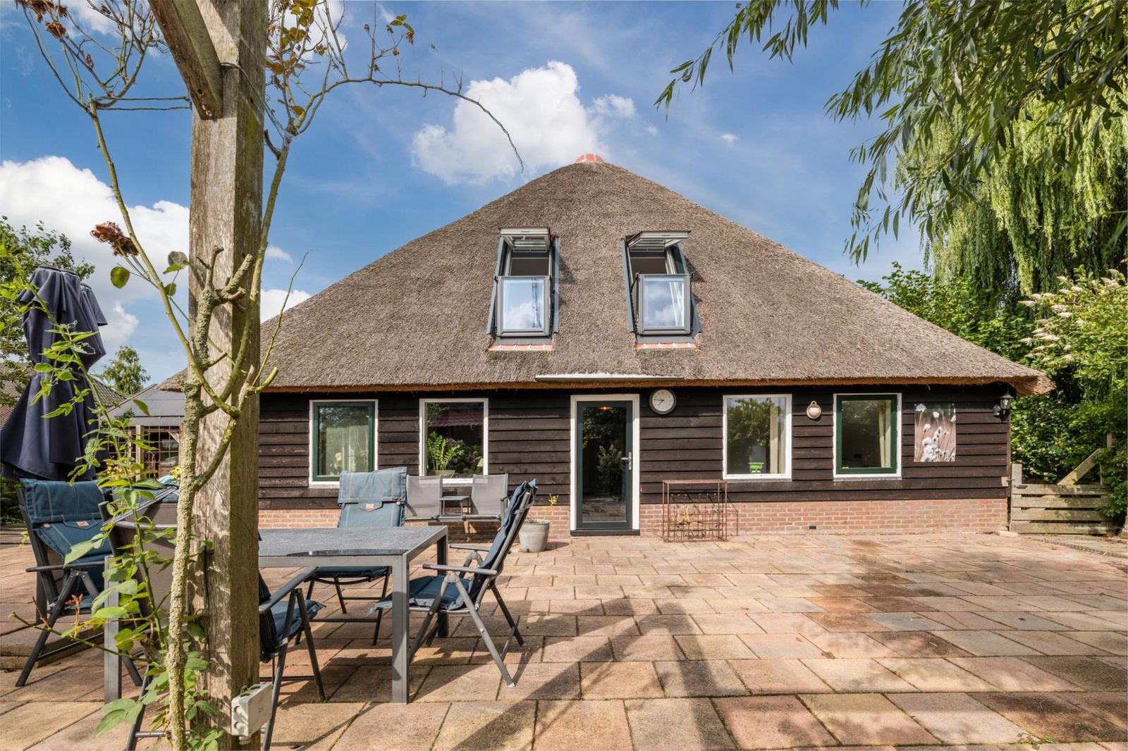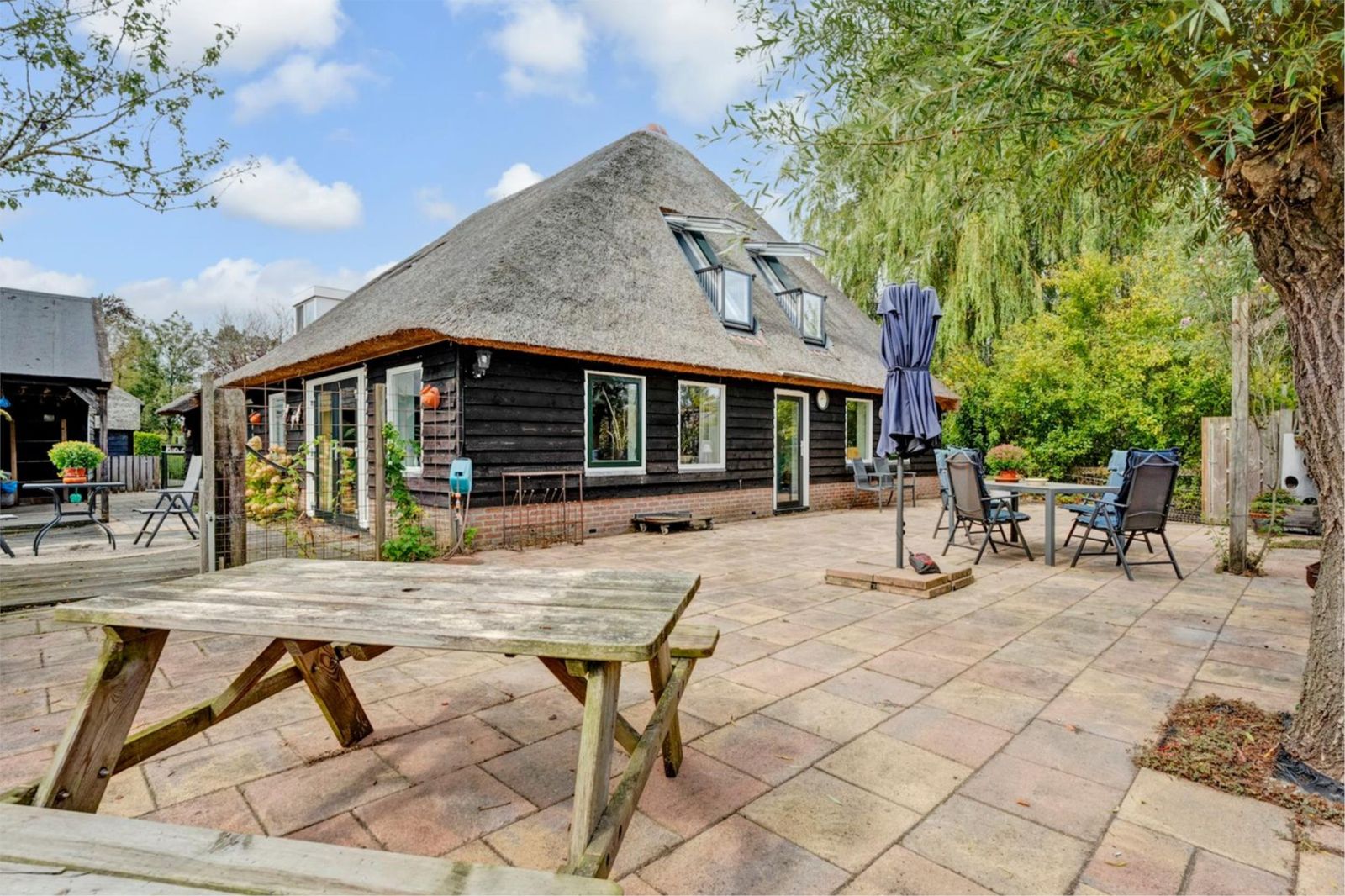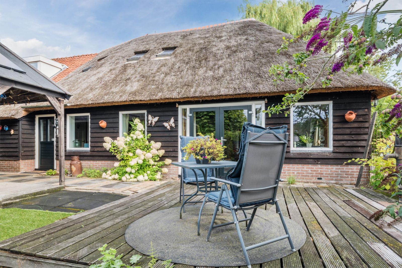 Het achterhuis is royaal, licht en met zorg verbouwd, waarbij authentieke details zoals zichtbare balken, houten gebinten en het vernieuwde rieten dak behouden zijn gebleven. De ruime woonkamer met openslaande deuren naar het zonnige terras vormt het hart van het huis. De luxe woonkeuken, aparte kantoorruimte met uitzicht over het Bovenwiede en de comfortabele slaapkamers maken dit deel uitermate geschikt voor permanent en comfortabel wonen. Op de verdieping bevindt zich onder andere een indrukwekkende, zeer grote master bedroom met uniek uitzicht via Velux cabrio balkonvensters met inloopkast en een badkamer met whirlpool.