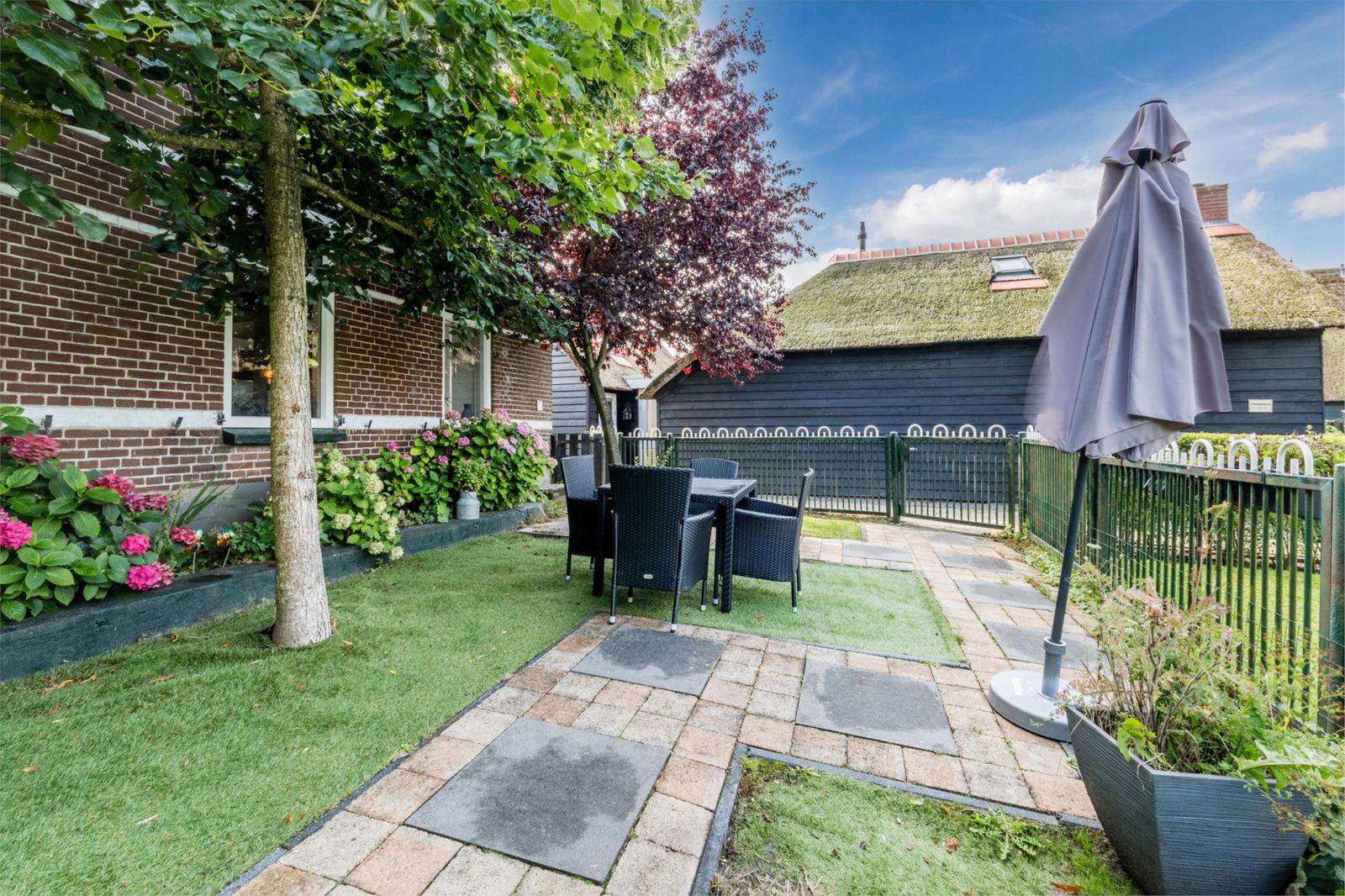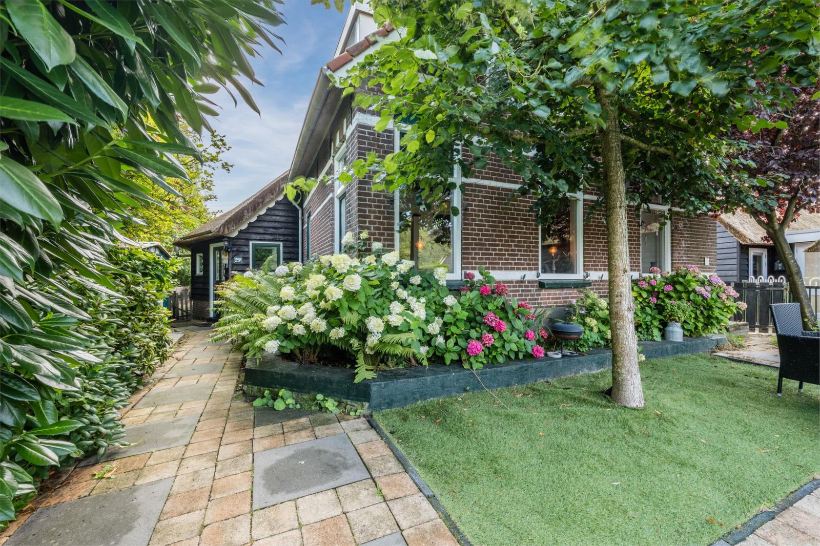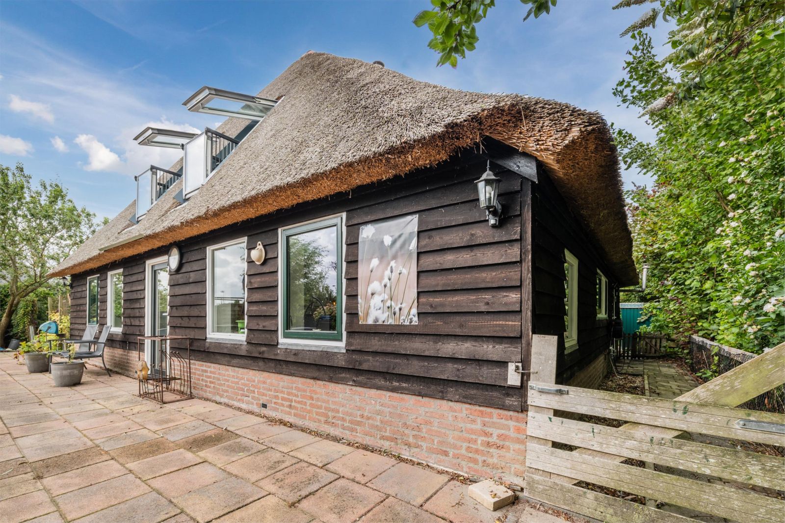Het achterhuis is royaal, licht en met zorg verbouwd, waarbij authentieke details zoals zichtbare balken, houten gebinten en het vernieuwde rieten dak behouden zijn gebleven. De ruime woonkamer met openslaande deuren naar het zonnige terras vormt het hart van het huis. De luxe woonkeuken, aparte kantoorruimte met uitzicht over het Bovenwiede en de comfortabele slaapkamers maken dit deel uitermate geschikt voor permanent en comfortabel wonen. Op de verdieping bevindt zich onder andere een indrukwekkende, zeer grote master bedroom met uniek uitzicht via Velux cabrio balkonvensters met inloopkast en een badkamer met whirlpool.