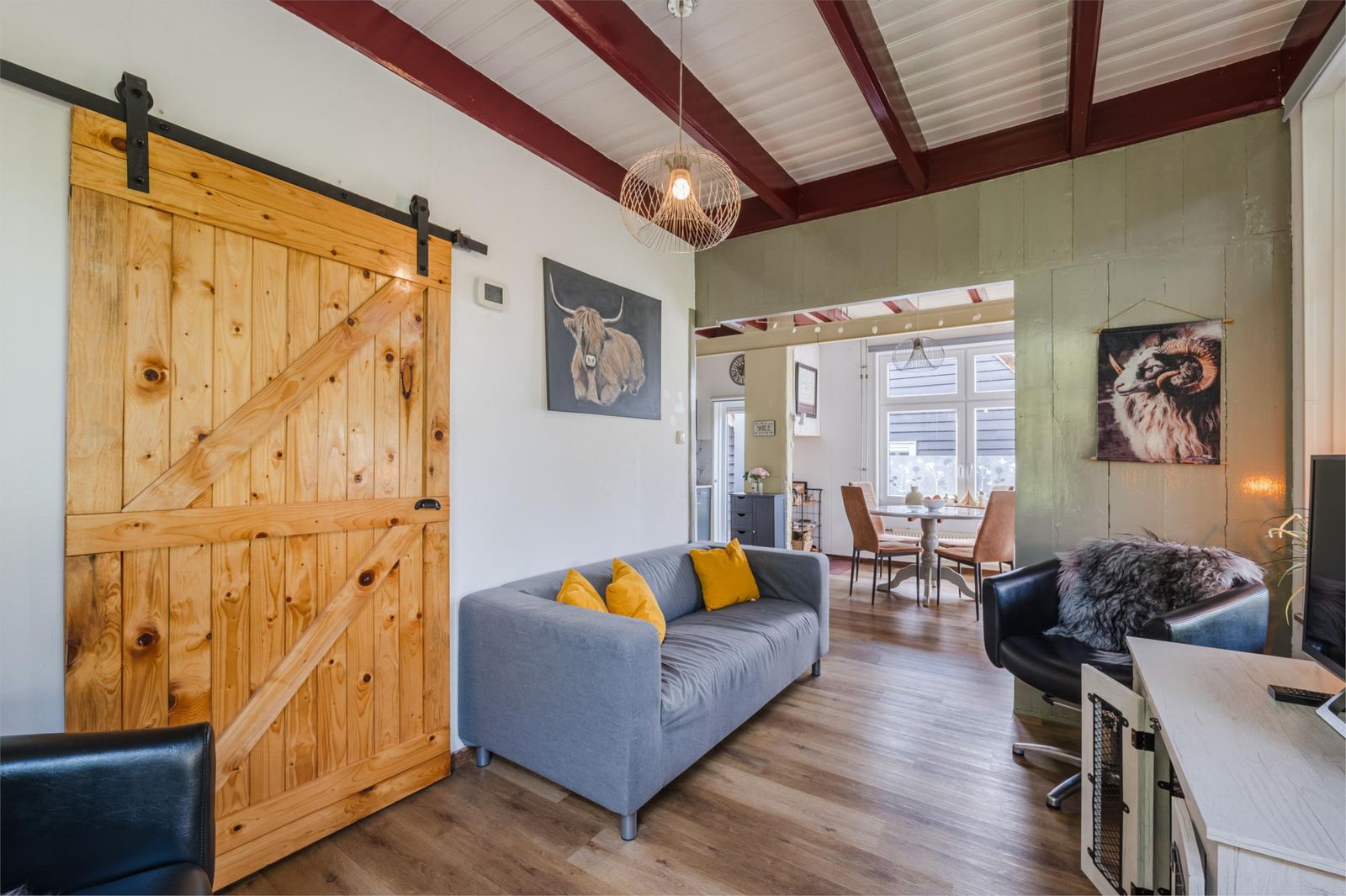 Doorloop naar sfeervolle woonkamer met loftdeur naar de slaapkamer