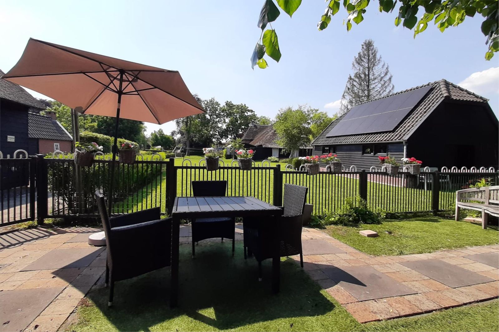 Buiten genieten op een van de terrassen, de keuze uit zon of schaduw. Omringd door groen en fruitbomen