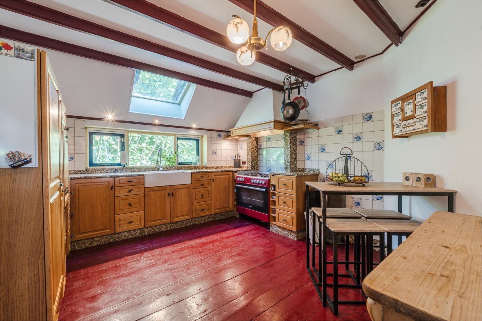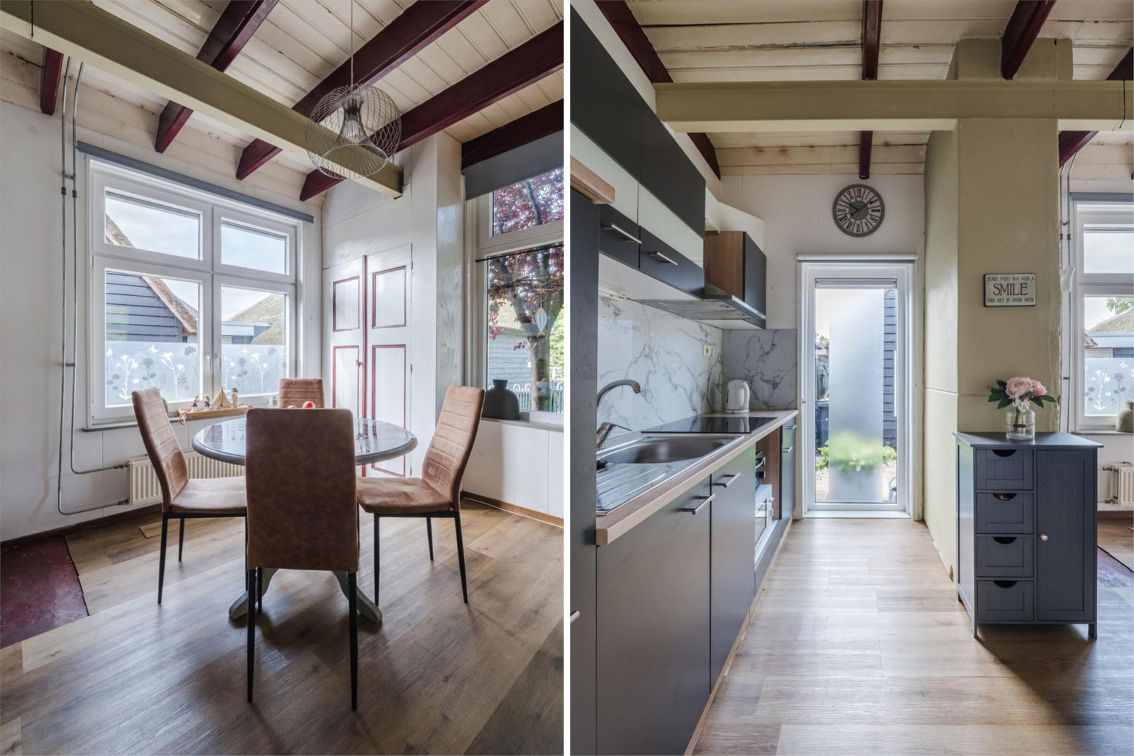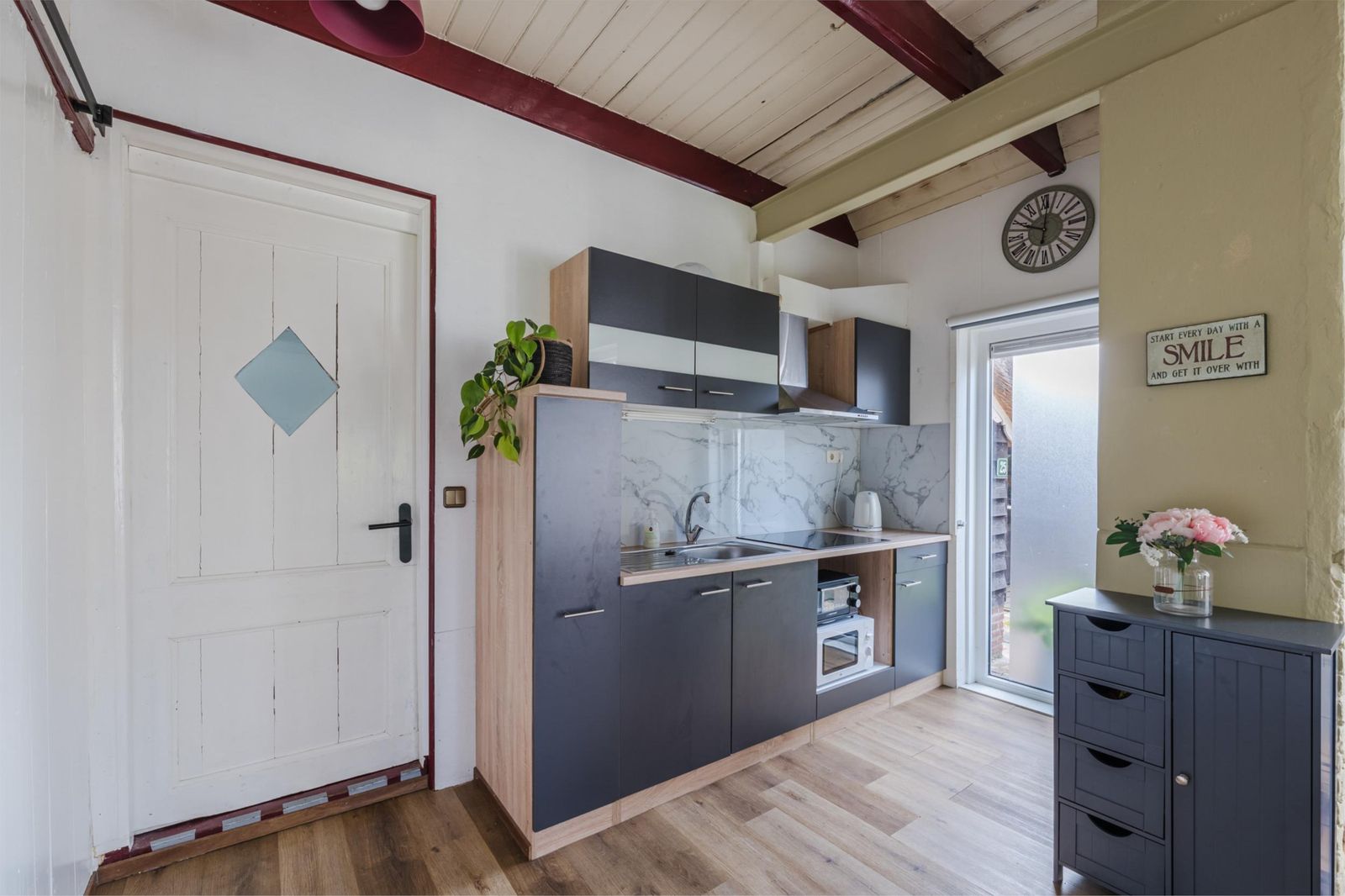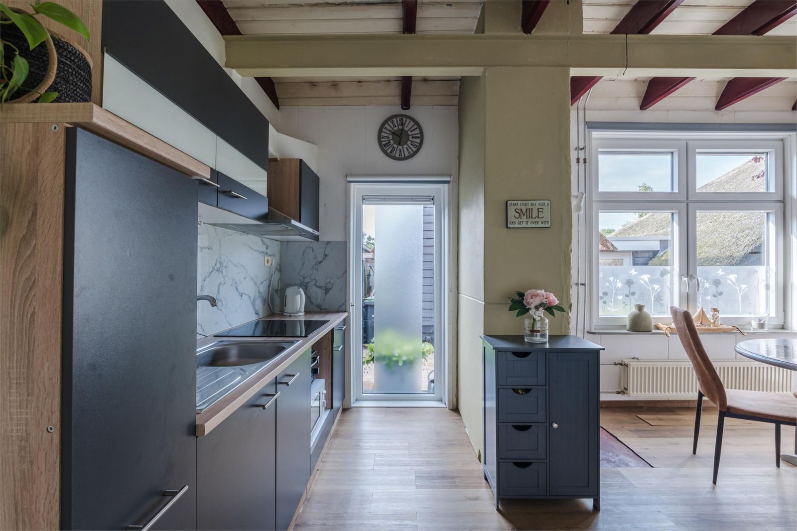 Zonnige eetkamer met moderne keuken (2021) voorzien van boiler (10 L), apothekerskast, ruim aanrechtblad met inductiekookplaat. Loftdeur naar de trapopgang.