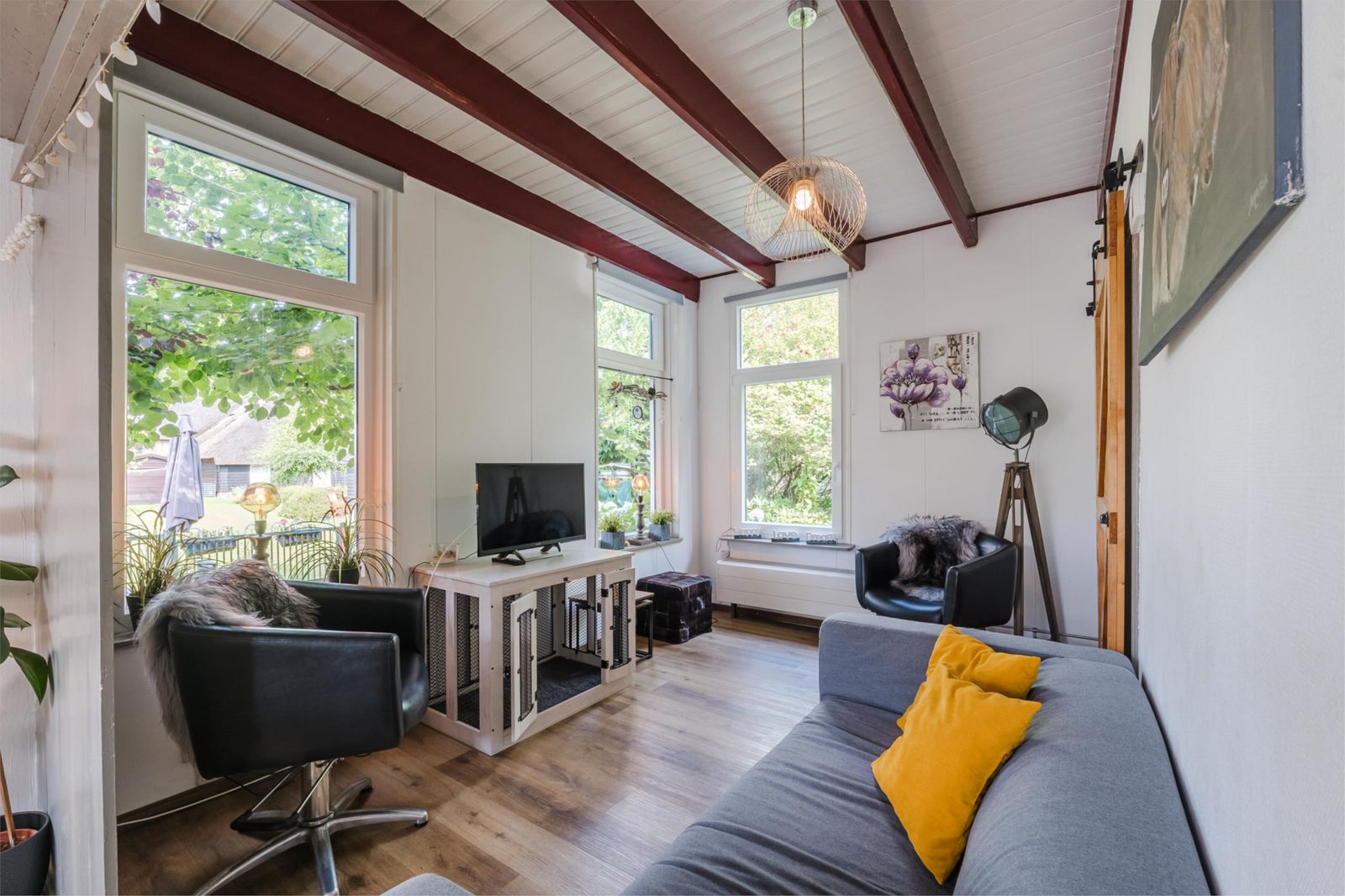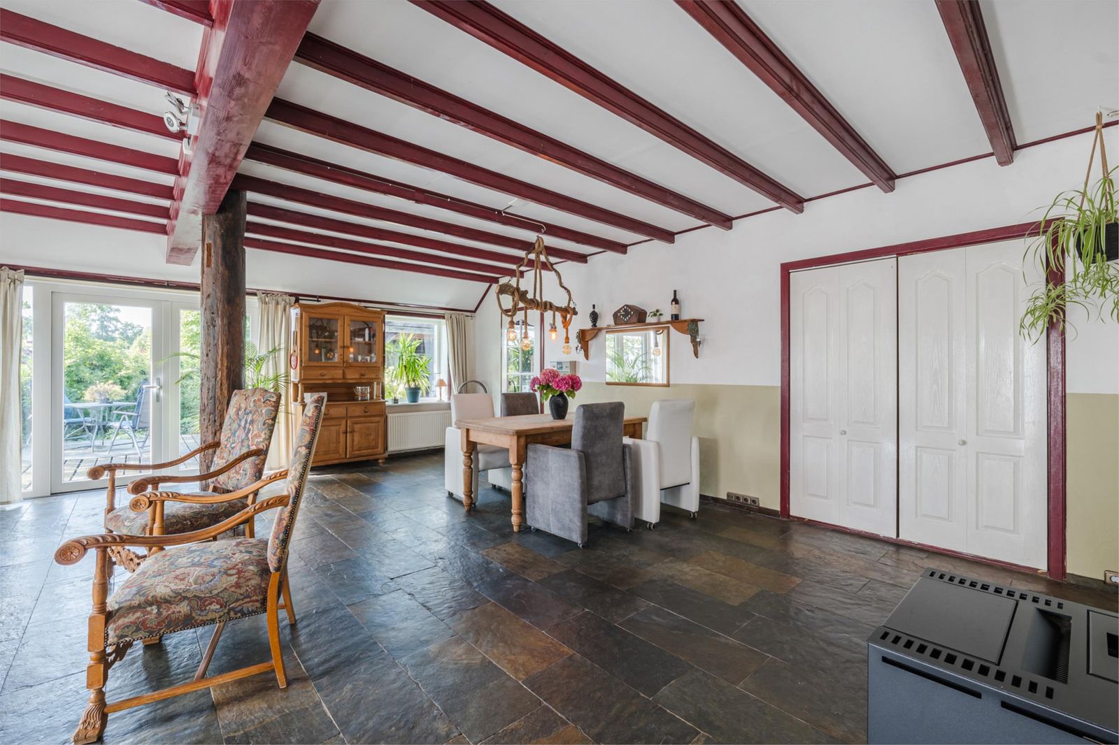 Riante, lichte woonkamer (ca 50 m2) met openslaande deuren naar het terras op het zuiden. Betegeld terras op het oosten en een mencave, die je bereikt via de achterdeur. Pelletkachel en natuurstenen vloer met vloerverwarming