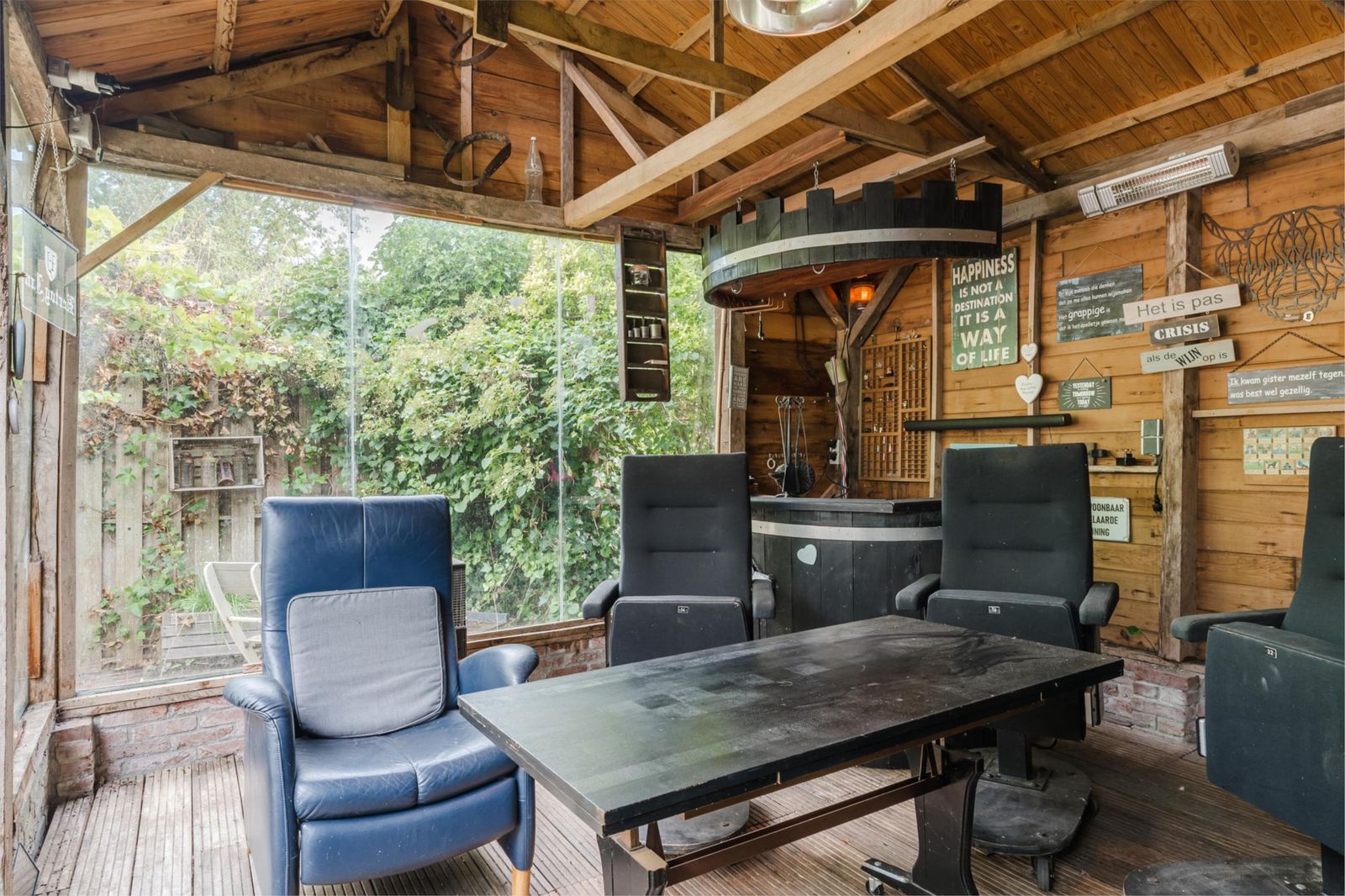 Tuinhuis (ca 32 m2) opgedeeld in mencave met bar en sauna en schuur